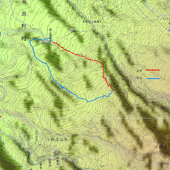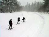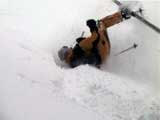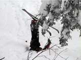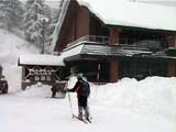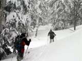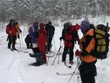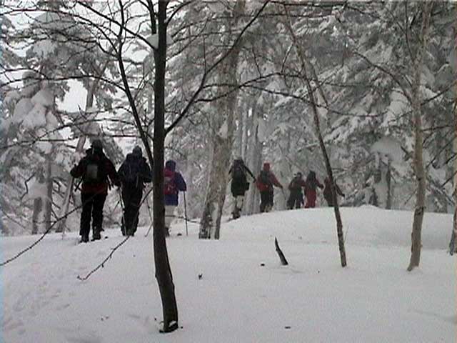 | 結果:二段目上、標高1340mで撤退 天候:雪、視界悪し 風速:0〜2メートル 気温:-17〜-20度 雪量:二段目より上は風で飛ばされて少ない 雪質:カリカリのウインドパック〜重雪 コース:白銀荘〜二段目上〜吹き上げ温泉樹林帯 今日から二日間、東京からやってきたH谷さんを迎え、三段山クラブ&テレテレ隊の合同合宿ツアー。第一目の今日は三段山ツアー。 記録的な悪天候をついて、ぞくぞくスキー馬鹿が集まってきた(遅刻もあったが)。 私は前回の腕の怪我が治りきらないうちの参加。おまけに風邪気味で鼻水が止まらない。まあ、どうせ寒くて鼻水が出るから同じか・・・まさしくスキー馬鹿の鏡と言えよう。 11時10分 白銀荘 天候:雪、風速1〜2m、-17度 予定を大幅に遅れて、白銀荘を出発。 昨夜強風が吹き荒れたということで、粉雪が飛んだ後の固雪を踏みしめながら登る。いつもなら大抵雪の状態の良い一段目にも重く締まった雪しかない。 一段目上の樹林帯の中には、風で折れた枝が散乱していた(写真2)。ラッセルが無いのは楽だが・・・ 12時28分 二段目上 天候:雪、風速1〜2m、-20度 二段目上まで上がってみてがっかり。長い時間をかけてせっかく積もっていた雪が強風で飛ばされて、ハイマツがすっかり顔を出している(写真3)。視界も悪く、これ以上登っても滑りはまったく楽しめそうもないので、ここから下山することにした。ただし、同じコースを戻っても雪が悪くて面白くないので、南西コースと吹き上げ温泉樹林コースに分かれて降りることにする。 私は吹き上げ温泉樹林コース班になる。 このコースは、吹き上げ温泉へ通じる沢沿いに樹林帯を降りるもので(写真4)、傾斜の緩急がきつく、コース取りも難しくて普段あまり降りる人はいない。しかし、樹林が濃いので良い雪が残っているかと期待しての選択だった。 雪さえ良ければ、そこそこ楽しめるコースなのだが、さすがに今日は雪が重たくてスキーがまったく走らない。やっと走ったかと思えばこの始末(写真5〜6)。スキーがとっても良く雪に刺さる。特にA部さんはこの後窒息ものの転倒で大変な目に遇っていた。 13時41分 白銀荘 天候:曇り、無風、-20度 やっと吹き上げ温泉近くの車道に出ておしまい(写真7)。あんまり勢いよく車道に飛び出すと車にはねられるので注意しよう。ここからは10分ほど歩いて白銀荘に到着(写真8)。ああ、疲れた・・・ その疲れを癒すべく今晩は大宴会。A部さんによるすき焼き&ほうとう鍋で満腹。ありがとう、これで風邪も治ります。 感想:とにかく雪が無い、雪が悪い。悪天候で雪が降ったのは良いが、風が強いとこうなってしまう。 それと、寒かった・・・なんだか条件的には最悪の三段山でした。まあ、こんな日はとっとと温泉・ビールに限りますな。 そのかわり、めずらしく吹き上げ温泉樹林コースのログが取れたので見てやってください。 明日は、富良野ジャイアントコースです。お楽しみに。 |