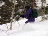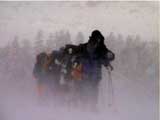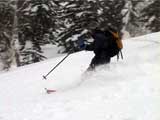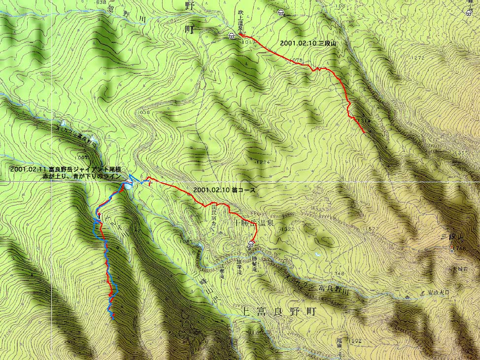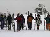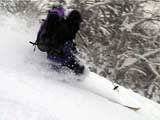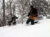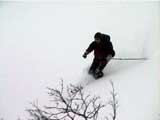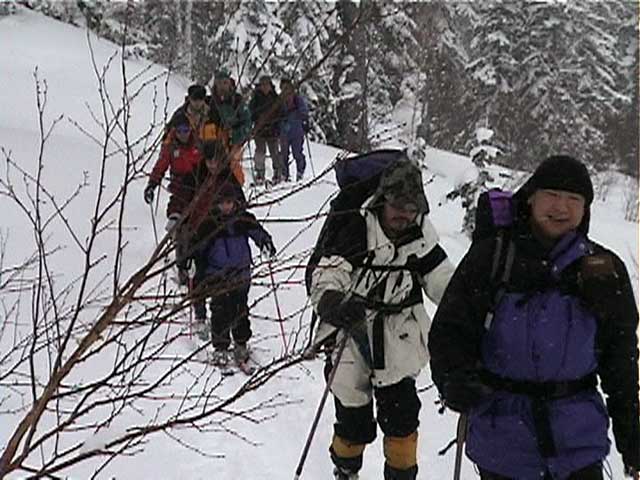 | 結果:二段目上、標高1340mで撤退 天候:二段目より上は地吹雪 風速:0〜10メートル 気温:-7〜-12度 雪量:二段目より上は風で飛ばされて少ない 雪質:カリカリのウインドパック〜粉雪 コース:白銀荘〜二段目上 今日は名古屋からやって来たまなべ夫婦とHYML(北海道山ML)三段山オフミ合宿ツアー。第一目の今日は三段山&翁コースツアー。一応私が三段山周辺を案内することになっている。 最近週末の恒例と化してきた悪天候。そこへぞくぞくと集まってきた面々(写真1)。 HYMLの方々とは初対面の方がほとんどだが、皆さんかなりの実力者らしく頼もしい。 名古屋からリンケンを引っさげてやってきた凄いテレマーカー、まなべさんは、昨日9時30分までナイターを楽しみ、かなりの藪好きぶりを発揮していたが・・・三段山は気に入ってくれるだろうか? ちなみにこれがリンケン(写真2,3)。http://www.linken.com/ ノルウエー製のステップインテレマークビンディングで、まなべさんが世界で80番目に買ったもの。おそらく山岳での使用は、これが日本で3番目・・・くらいだと思われる。 10時30分 白銀荘 天候:くもり、無風、-7度 とりあえず白銀荘を出発。 時々晴れ間も見える天候だが、上空を見ると雲の動きが早い。たぶん尾根ではかなり吹かれるだろう。 10時51分 一段目下 天候:くもり、無風、-10度 衣類調整のために休憩。一段目は雪が良くてホッとした。ラッセルもほとんど無くて助かる。皆さん足並みが良くて、ほとんどちぎれることなく綺麗な一列縦隊で登る(写真4)。 11時21分 二段目下 天候:くもり、1〜2m、-10度 尾根で天候が急変するまえの休憩。防寒装備をしっかり点検。尾根の上で地吹雪が渦を巻いている様子が見える。 11時46分 二段目上 天候:地吹雪、7〜8m、-12度 二段目の途中から雪がクラストし始め、同時に猛烈に吹雪かれる(写真5)。二段目上まで上がってみて、やっぱりがっかり。例によってハイマツがすっかり顔を出している。地吹雪で視界も悪く、これ以上登っても滑りはまったく楽しめそうもないので、速やかに下山を決定する。滑り重視の団体だと気が楽だ(^_^)。ここでスーさん、N西さんと合流。 ちなみに、リンケンを使っての登りの評価は、「登りは別に問題ありません。強いて言えば新雪の中でのステップインはちょっと面倒です。踵にプレートがあるので雪が詰まるとダメ」だそうだ。 いよいよ滑降開始(写真6〜17)。 まず、まなべさんが悪雪急斜面にトライしてくれて爆発!(写真6の直後) なんだか凄くうまくなったK井さんが、良い斜面を選んで鮮やかに滑り降りる。板をK2 Heli Stinxに変えたせいか?でも、それなら私がうまくならないのは、何故? K宮さんはクラシカルなテレマークターン。K田さんはテレマークを始めて3ヶ月とは思えない素晴らしい滑りを見せてくれた。え?師匠はK井さんなの?うーん、旦那も習おうかな・・ 山スキー軍団も皆うまい。特にS口さんやS藤さんはベテランらしく、軽やかで安定した滑りだ。皆それぞれ特徴のある滑りがあり、見ていて楽しい。 スーさんとN西さんは、とてもスピードは乗っているけど、まだアルマーク(アルペンとテレマークの合成語)だなあ・・・(^_^;)。 白銀荘 天候:曇り、無風、-10度 一段目付近で、トップで飛ばしすぎた私を後続が見失ってルートを外れるトラブルがあったが、それもまた楽しい。このあと白銀荘で昼食(ビール)を取り、午後から翁コースへ向かう。 感想:先週と同じく、天候は荒れているくせに雪のない三段山。二段目から上の景色は本当に先週と同じでした。 かろうじて一段目では楽しめましたが、これじゃ欲求不満です。まなべさんも斜度が足りないと言っているし。 帯広労山は、この天候でもピークに登ったということで、さすがですね・・・ |
