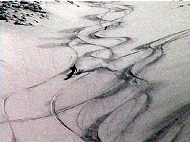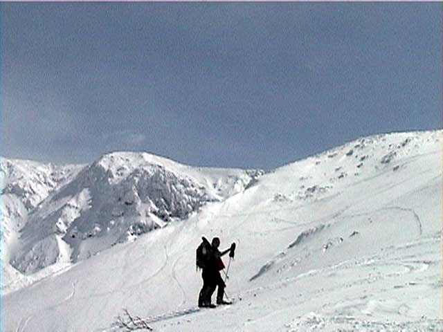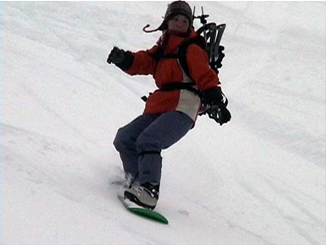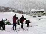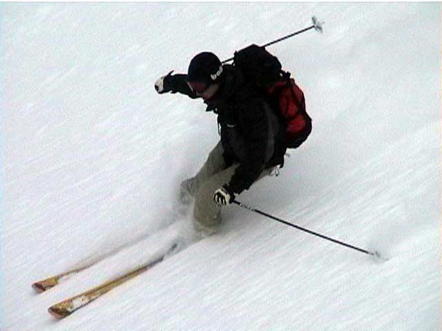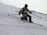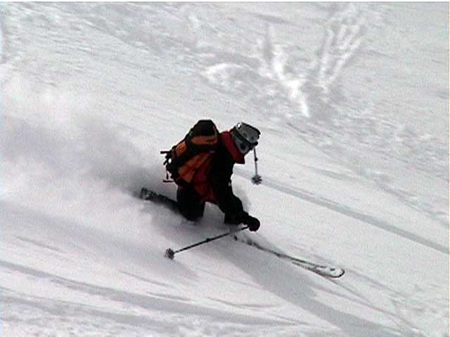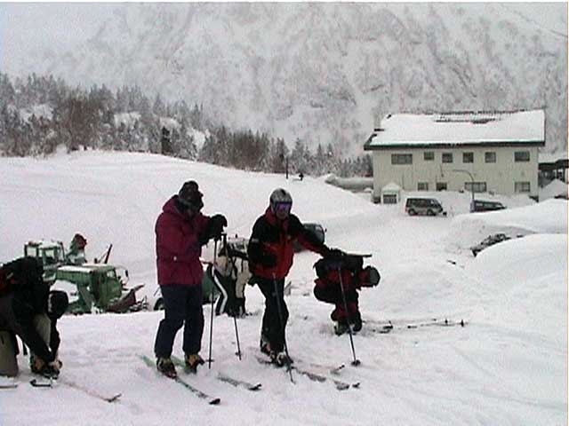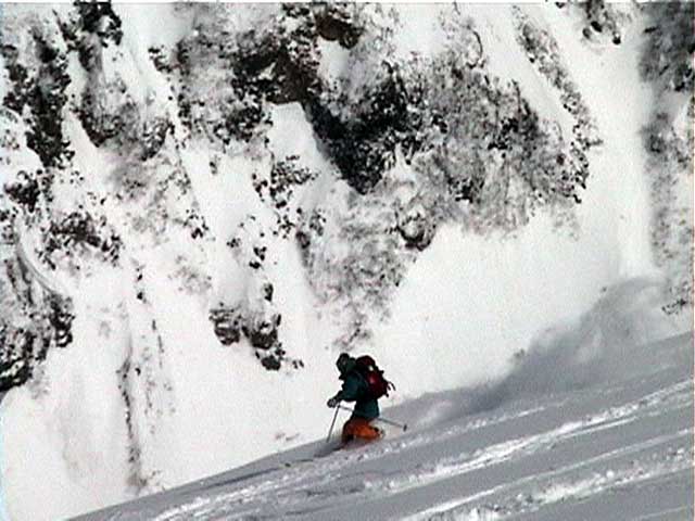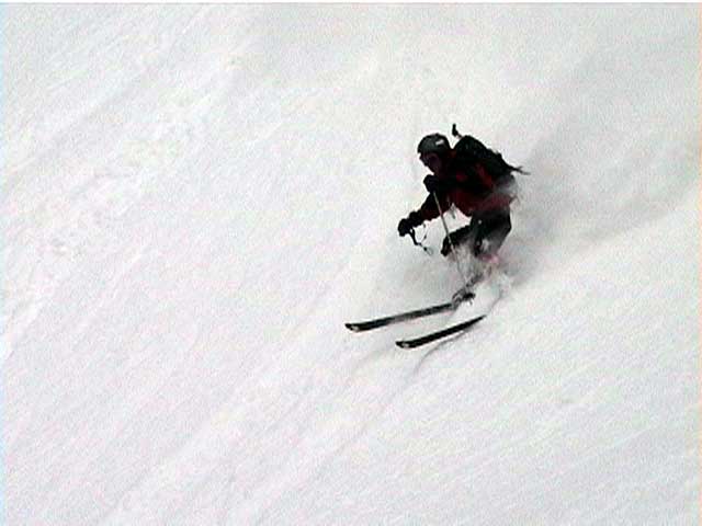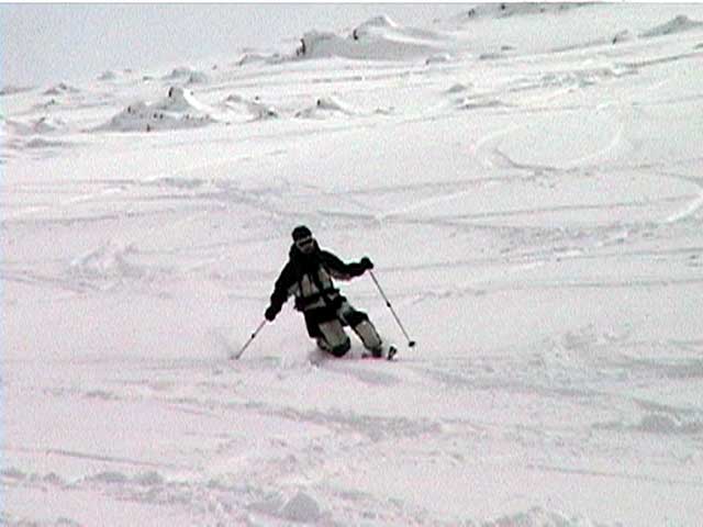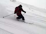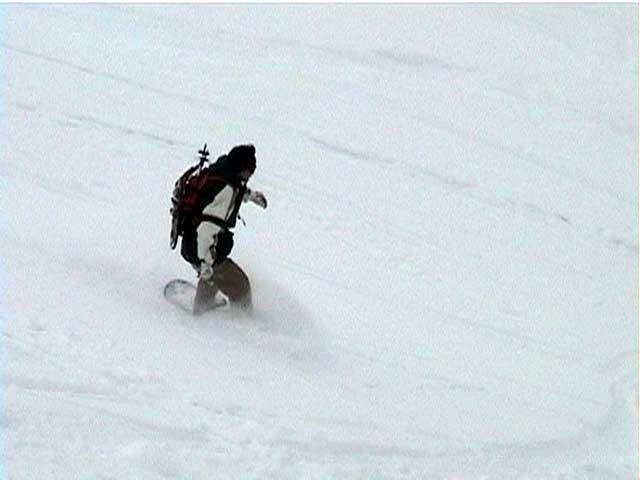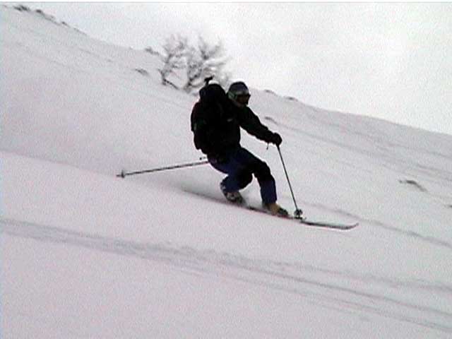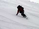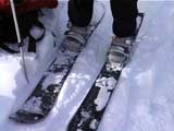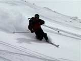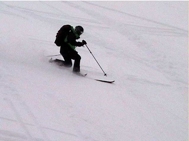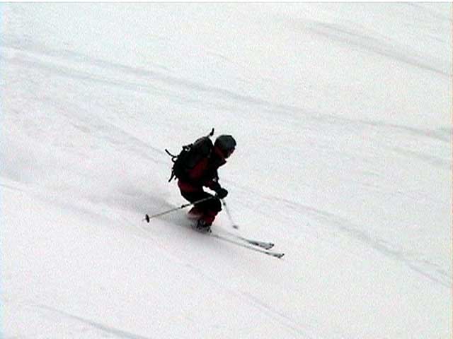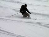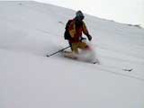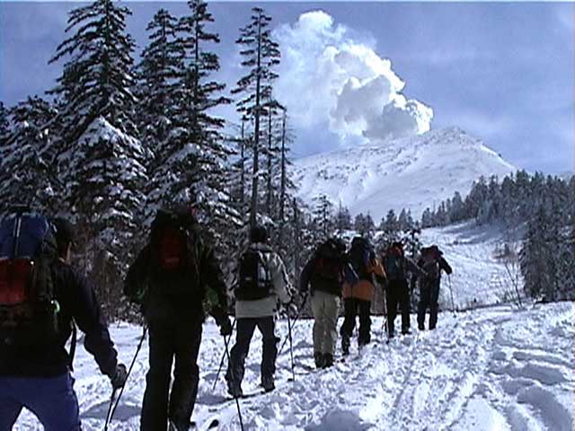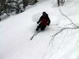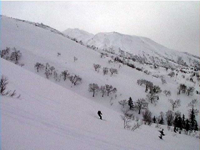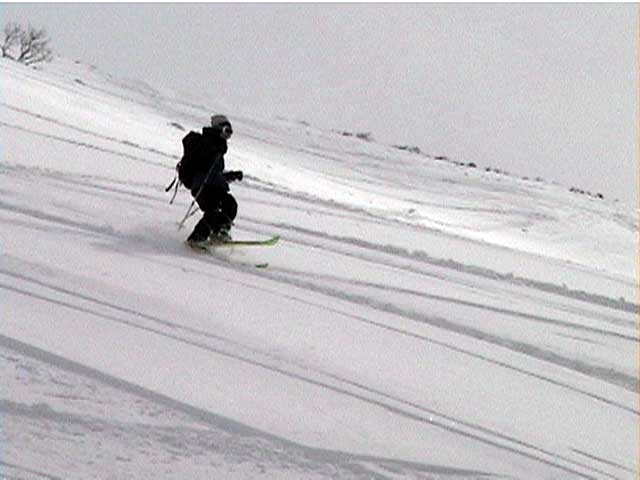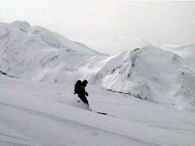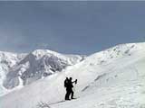 | 三段山ツアー 結果:登頂成功 天候:晴れ時々くもり 風速:0〜1メートル 気温:-5〜-10度 雪量:十分 雪質:若干重めの浅いパウダー コース:白銀荘〜三段山 今朝は、上富のスーさん宅に宿泊して、-22度の朝を迎えた。3月半ばにしては驚くような低温だが、この気温なら雪も良さそうだ。 麓の上富良野町からは、快晴下の十勝岳連邦がすべて見渡せる。 一昨日から呆れるような好天続きなので、きっと三段山には沢山のスキーヤーが入っているだろう。今日は、あまり荒らされていない斜面をどう攻略するかが重要なポイントになる。 10時04分 白銀荘出発 天候:晴れ、無風、-5度 くっきりと見える三段山山頂を横目に見ながら(写真1)、例によって遅刻気味に到着した旦那。白銀荘では沢山の人達が待ちきれない様子で準備を整えていた。 今日のギアも、テレマーク、山スキー、ボード、割ボード(写真2)と、例によってバラエティーに富んだ構成。 あわてて一通り自己紹介してもらったあと、出発する(写真3)。 一応全員ツアー経験者だし、山スキーツアーのプロも何人か同行しているので大変心強い。 ルート上には、何十人ものスキーヤーによって作られた高速道路のようなトレースが出来ていたので、それを辿って楽をさせてもらった。 日差しが強いので大汗をかき、早々とジャケットを脱いだ。これなら半袖になっても大丈夫だろう。 二段目に上がってみて驚いた(写真4)。 ありとあらゆる斜面にシュプールが・・・ なんと、フリコ沢に向かう(雪崩の)やばそうな斜面にもばっちりスノボのシュプールが刻まれていた(写真5)。 主なコースは、何十人ものボーゲンで降りた山スキーヤー達によって、まるでピステンをかけられたゲレンデのような状態になってしまっている(トホホ)。 ため息をつきながら、下降コースを思案していると、丁度追いついてきた皮靴テレマーカーなにわやさんから、三段山火口そばから伸びる谷へ行ってみては?とのアドバイスを受けた。 もう少し雪が締まってから行こうと思っていたルートだったが、今日の雪質なら雪崩の危険性も少ないと判断し、そちらへ滑降することに決めた。 途中、前十勝の見える最高のバックグラウンドの中を滑り降りて行く、角田夫妻と出会った(写真6)上手い。上手いスキーヤーには、僕らから「ヒューヒュー!」という囃子声で最大級の賛辞が送られる。 廊下に入ってすぐに、稜線からとんでもなく上手いテレマークが降りてくる。あっ!犬(ミックス)も一緒だ。T中ファミリーやオクサダさん御一行であった(写真7)。当然、「ヒューヒュー」。 廊下付近で、富良野のK一さん、釧路のO川さんらと出会い、一緒に山頂を目指した。 12時35分-13時10分 山頂 天候:雪、風速1m、-10度 いつも難儀する四段目は、雪が良く締まっていて直登が可能なほどであった(写真8)。急に雲が出てきて、登ってきた方向は真っ白になってしまたが、稜線ではお馴染みの大パノラマが僕らを迎えてくれた。 山頂では、しばらく雲に包まれて小雪なども降っていたが、休憩している間に晴れてくれた。 お約束の記念撮影後(写真9)、当然ビールなどもたしなみ、いよいよ滑降開始! まずは、目的の谷まで崖尾根方向へ稜線をずっと降りる。少し稜線上をはずしたところをトラバース気味に行くと、ハイマツや岩を踏まないですむ。 お目当ての大きな谷の源頭部に到着してみると、目論み通り2〜3本のシュプールしか無かった。 自然に笑みがこぼれる。丁度坪足でこのルートを登ってきたスキーヤーが居たが、心中察するにあまりある。突然滑降予定コースに16人も降ってきたら・・・申し訳ない。 では、滑降開始!(写真10〜25) 少し癖のある重めの雪だったが、この陽気の割には上々の部類だ。 曲げすぎると吹っ飛ばされるので、大きなターンで雪を切っていく。 スピードが乗ると、スキーのトップが雪を切る「シャリシャリ」という音が聞こえてきて心地よい。つい最後まで滑りたくなるのを、鉄の自制心で押さえて斜面の途中に陣取り、皆が滑降する様子を撮影する。 一人ずつ撮影を繰り返しながら降りたので、案外時間がかかって申し訳ない。 皆のフォームをこうして見てみると千差万別で面白いね。 ちなみに、なにわやさんは皮靴細長板だ。 気持ちよく谷を降りたあと、最後にトラバース気味に南西コースへ戻ったが、だるい斜面や登り返しもなくて、とてもいい感じだった。 これからの季節には、主にここで遊ばせてもらおう。 ただし、ボーダーにはちょっとトラバースがきついかもしれない。 14時08分 白銀荘到着 天候:晴れ、無風、-7度 皆の滑降技量が高く、降りの足並みがそろっていたので意外と早く白銀荘に着けた。 このまま温泉入るのも良いが、まだ滑り足りないとお嘆きの貴兄(ほぼ全員)のために、オプショナルツアーとして、翁コースをセッティングしてみた。 翁コース 結果:滑降成功 天候:くもり・小雪 風速:無風 気温:-6〜-10度 雪量:十分 雪質:良質のパウダー コース:翁コース 14:42 凌雲閣 天
