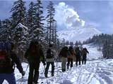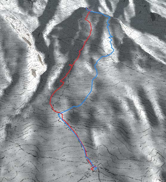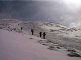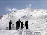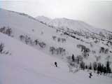 おお!今日はツアー人数が多いぞ。なんだかんだで16人が列をなして登ることになった。 山のコンディションは上々、でも沢山のスキーヤーによって主だった斜面はズタズタ・・ こうなったら穴場の谷へ突撃だ! |