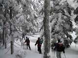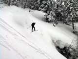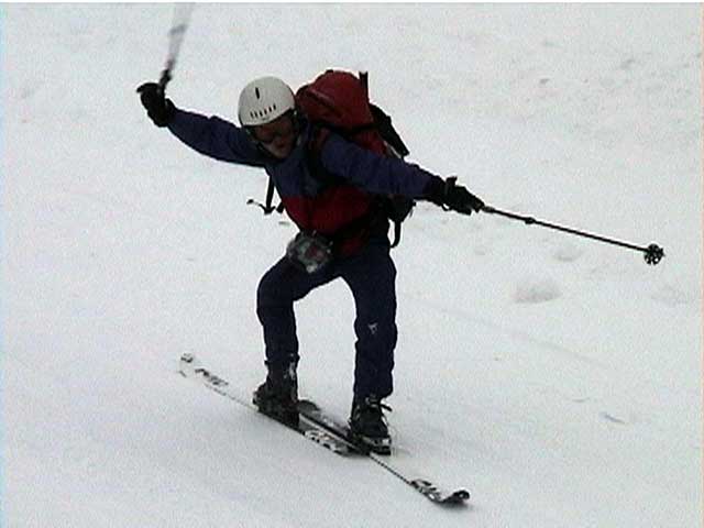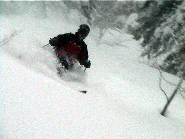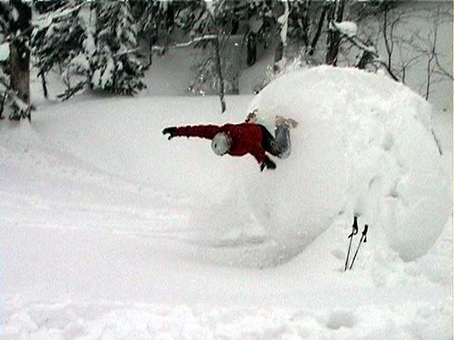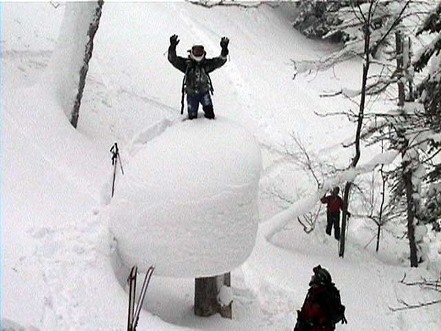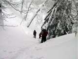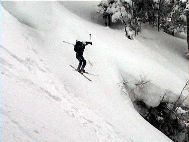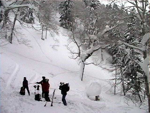 | 結果:ジャイアント尾根1160メートル地点から滑降 天候:雪 視界不良〜くもり 風速:0〜5メートル 気温:-5〜-7度 雪量:十分 雪質:良質のパウダー 天候が悪い。白銀荘付近ですでにガスがかかっており視界不良。風も強く地吹雪が吹いている。 山行中止もありえる天候だったが、こんな時は富良野岳のの樹林帯で遊ぶに限る。 今朝は気温が低いので、夕べ積もった雪でパウダーランが楽しめそうだ。 10時30バーデン上富良野 天候:雪、視界不良 風速4〜5m -5度 例によって富良野岳は濃い雲の中・・・ バーデンかみふらの前の駐車スペースに駐車。こんな天気に登る物好きは他に一人も居ないらしく、駐車していたのは我々の車だけであった。 恒例の板投げの後、砂防ダムの箇所で川を渡渉(写真1)。 樹林帯は、目論み通りあまり風がない(写真3)。雪も良くて軽いラッセルが20センチ程度。いやがおうにも期待が高まる。 11時00分 ベベルイ沢の滝 天候:雪、無風、-5度 北尾根をコンタ(等高線)沿いに進み、ベベルイ沢の滝に到着。谷の底なので風は全くない。 いつもは休憩するだけの箇所なのだが、あらためて周りを見渡すと、斜度35度程度の斜面が四方にある、おもしろい場所だ。 これは・・・どうせ尾根へ出てもカリカリの強風だろうし、ここで上り下りして遊ぼうという話になった。 とりあえず雪が悪くなるところ、たぶん森林限界までは上がろうということになり、登高続行(写真3)。序盤はきつい登りだが、ここを滑れると思うと、なんでも我慢できる。 11時40分 1160m 天候:雪、風速1〜2m、-7度 20センチのラッセル ラッセルが続いて疲れたので、傾斜が緩やかになる1160m地点で一休み。 ああ・・上空からゴウゴウという風の吹き荒れる音と木々のざわめきが聞こえてくる。 誰からともなく「もう、帰るか」。「疲れたし」「早く滑りたーい」 「よし!とっとと降りて、ベベルイ沢でラーメンを食べよう!」 森林限界までは、まだだいぶあるが、簡単に当初の計画を翻して降りることにする。さすが、三段山クラブ。 各自ヘルメットを着用し(スーさんはチンガード付き)滑降開始!(写真4〜15)。 フェイスショットからオーバーヘッドへ、粉雪を被りながら快適なツリーランを楽しむ。雪の良さは予想以上だ。この季節に深さ20センチ程度の新雪が食えるとは思わなかった。わはは。 豪快に滑り、豪快に転んでいたスーさんが、しきりとチンガードの中に指を突っ込んで雪を掻きだしている。なんでもチンガードの中にすぐ雪が詰まり、息が苦しくなるのだそうだ。意外な盲点。 12時00分 ベベルイ沢の滝 天候:くもち、無風、-3度 アッと言う間にベベルイ沢の滝に到着。昼食を取りながら、登り返してどこを滑るかで盛り上がる。 お?天然のキッカー発見!まず、Kamixさんが飛びたいと言い始める。さすが、裏磐梯メットサル軍団だ。 当初かなりびびっていた他の面々も、なぜかその気になってしまい、結局飛びまくる(写真16、17)。 さらにそれに飽きたらず、きのこ状に冠雪した雪の塊、通称「きのこ」によじ登る者やダイブする者が出現。それを見て皆で腹を抱えて笑う。 かなりイカレている、パウダー酔いだろうか? いい加減、谷の良い斜面を滑り尽くしてしまい、今日はこれでお開き(写真20)。 急斜面の至る所がシュプールだらけで、きのこの下には人型の凹みまでついている。 明日ここへ登った人は、この有様を見てびっくりするだろう。三段山クラブ恐るべし。 バーデンかみふらの 天候:くもり 無風 何時に着いたか不明。 天候はかなり回復してきた ここでKamixさんが、ビデオ「unparalleled」に登場した「開脚ゴーゴー滑り」を披露してくれた(写真21)。それを笑い転げながら撮影する旦那「スゲエ!みんな凄いよ!ワハハハ!」(旦那もおかしくなっている) どうにもテンションが高まったまま納まらず、盛り上がったまま上ホロ荘の露天風呂へ。 粉雪の感触の余韻に浸りながら、ビールで乾杯して、十勝山系樹林ツアーを締めくくった。 感想: 十勝山系蹂躙ツアーは、最高の粉雪で締めくくれました。快晴の前十勝から始まって、3日間の間に、ほとんどのコンディションとロケーションを味わえたことになります。 高Tさん、Kamixさん、また来てくださいね。 高Tさんの作ってくれた晩飯最高でした。 Kamixさんは、私と同じビデオカメラ持参で来てくれて、旦那も沢山撮影してもらいました。こんな事は初めてです。ありがとうございます。 |