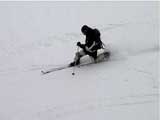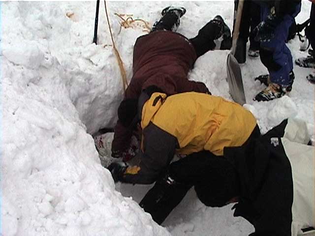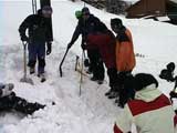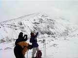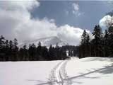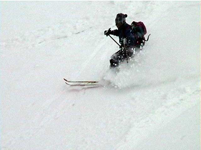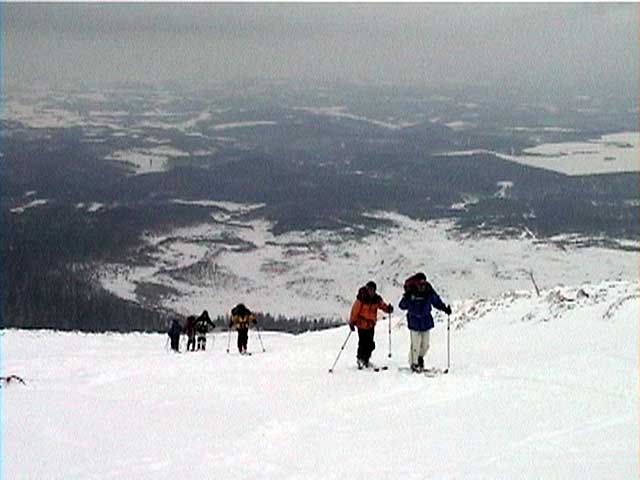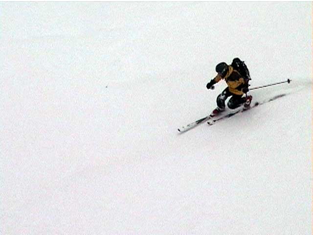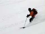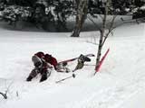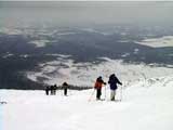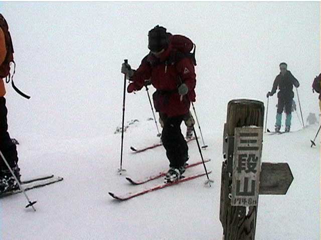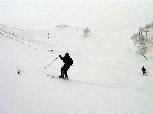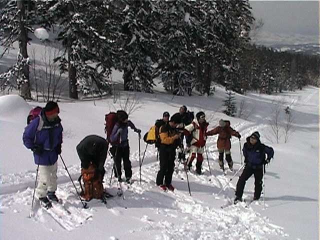 | 三段山ツアー 結果:登頂成功 天候:晴れ時々くもり 風速:0〜3メートル 気温:0〜-8度 雪量:十分 雪質:少々重め コース:白銀荘〜三段山 今日は、N崎さんのお知り合いと、総勢16名で白銀荘で宴会する日。 久しぶりに多くの山スキーヤーの方々と登った。 10:15 白銀荘出発 天候:晴れ 無風 0度 雲は多いが、なんとか晴れている(写真1)。気温が高いので早々にジャケットを脱いだ。雪質自体はまあまあだろうか?しかし、降りてきたスキーヤー達は口々に、上部は雪が堅くてまったく楽しめなかったとこぼしていた。コース取りでなんとかなることを期待する(写真2)。 天候が良いせいか、先発していた沢山のスキーヤーが降りてくる。天候は晴れたり曇ったり、風はほとんど無い(写真3)。 雪は、ラッセルは無く、尾根上はクラスト気味に堅く締まっていて滑りずらそうだ。 廊下で昼食を取る。下界は晴れているが、山頂付近はガスの中(写真4)。 スリップしやすい四段目は何度かジグを切り、苦労して稜線へ。このあたりは、すっかりガスの中だった。 12:26三段山山頂 天候:曇り 視界不良 風速2〜3メートル -8度 着いたことは着いたけど、なーんにも見えない。風も出てきた。(写真5)。 このガスの中じゃ、予定していた西の谷へのルート取りの自信がない。 憂鬱だ、困った。と、思いながら集合写真(写真6)。するとそのうち・・・おお!!ガスが晴れてきた!!! どんどん視界が開けて、周囲にお馴染みの大パノラマが広がってくる。チャンス!この機会を逃すな!! (って、これって先週とまったく同じシチュエーションだ。最近、このパターンが多い。) 12:35 三段山山頂より下山開始 天候:晴れ とにかく、晴れている間に西の谷への下降ルートを確保しなくてはならないので、大急ぎで出発。 さあ、西の谷の大滑降開始!(写真7〜14)。 雪質は少し重ためだったが思ったよりは良く、夏道ルートと比較すると雲泥の差だった。 試しに、ジャンプターンをしながら両足同時操作をするという、悪雪対策滑りをしてみた。うん、これは具合が良い。 谷の下部を東へトラバースし(写真15)、そこから林間コースに入る。 今回も良質のパウダーが待っていた(写真16)。適度な疎林で、快適な滑降が楽しめる。ただし、油断すると(写真17)みたいなことになるので注意。 今回は、樹林帯からどれだけ白銀荘の近くへ直接出ることが出来るか挑戦してみた。 斜度の無くなった樹林帯コースの後半を、GPSとコンパスを使いながら進み、ビンゴ!(写真18)無事白銀荘へ直接到達。 13時37分 白銀荘到着 天候:晴れ、無風 かなり早めに白銀荘へ到着。かなり汗をかいたので、とりあえずビールで乾杯する。 宴会にはまだ時間が早いので、長老を講師にして雪崩講習会を催すことにした。丁度居合わせたガイドの山小屋さんが全面協力してくれて、埋没、ゾンデ棒、ビーコン訓練を行った(写真19,20)。 感想: これで、山頂〜西の谷〜林間コースは完成したと言えるだろう。どうか、GPSトラック図を参考にしてみてください(このトラック図は、樹林が濃いせいかうまくログが取れなかったため、マニュアルで補正したものです)。 このコースなら、より急な斜度とより良い雪質で、今までのよりずっと三段山を楽しめると思います。 特に一段目と二段目がすでにズタズタにされていた時には、こちらのコースをお勧めします。 しかし、谷への降り口は少々見つけづらいので、視界が悪ければノーマルルートを降りるしかないでしょう。樹林帯の中も迷いやすいので注意が必要です。 厳冬期には、また状況は変わるだろうが、雪の締まる3〜4月期ではベストのコースでしょう。 雪崩講習に参加した皆さん、埋没体験の感想はいかがでしたか?(^_^) 一度埋まってみると、雪崩に対してすごく用心深くなれると思います。 ビーコンは、デジタルビーコンが威力ありましたね。操作に慣れていない人でも、比較的簡単に扱えそうです。 最後になりましたが、入浴時間を棒に振って、雪崩訓練に協力・指導してくれた、ガイドの山小屋さんに深く感謝いたします。 |