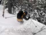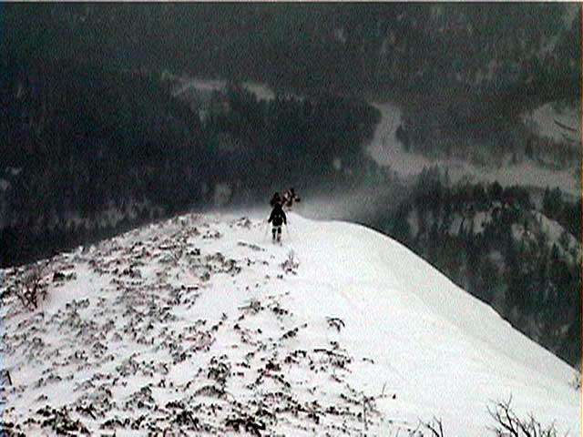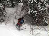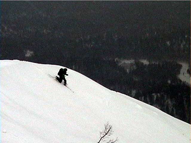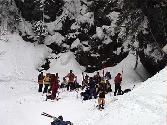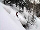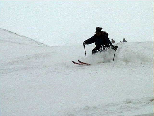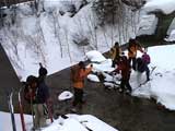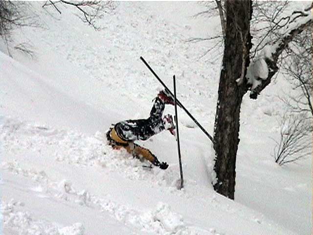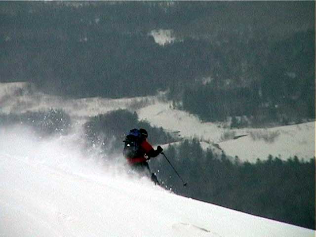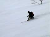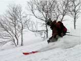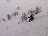 | 結果:ジャイアント尾根上1500メートル地点から滑降 天候:曇り時々小雪 風速:0〜3メートル 気温:-1〜+5度 雪量:十分 雪質:森林限界より上は堅め、樹林帯は重ためのパウダー うーん、気温が高いなあ・・・雪質に黄色信号が灯る。 こうなったら、ジャイアント尾根の樹林帯に期待するしかない。 標高の高い尾根まで上がれば、案外雪質も良いかもしれないし。 でも、雪崩の危険性もあるかもしれない・・・ 8時54分 バーデンかみふらの 出発 天候:曇天 無風 -1度 恒例の川渡り(写真1)。川に温泉が入って温度が高いせいか、砂防ダムの近くにスノーブリッジが出来にくい。 富良野ジャイアント尾根は、この川の渡渉が唯一面倒な箇所だが、そのおかげで入山する人が少ないのかもしれない。 途中で先行者のトレースを見つけたが、北尾根の途中で分かれた。 9時36分 ベベルイ沢滝到着 北尾根のコンタ沿いにベベルイ沢の滝に到着。 相変わらず良い斜面が3方に広がっている。しかし、雪が重たくて乗りこなしが難しそうだ。 ここで、Hiroさんの新型GPS eTrex ventureのお披露目(写真2)。 三段山クラブGPS担当のホゼ*タッキーニさんによると、こいつはeTrek Sumitと比較すると、メモリー数が増え、LCDのドットが増え、5方向のスイッチが着き、メニューが選択しやすくなっているらしい。 実際、旦那がいじってみた感想は、液晶画面の表示が精細で、特にマップ画面が使いやすそうだった。むしろ精細すぎて、文字が細かすぎて見えずらいくらい。 旦那のGPS12XLと比較すると、スクロールはジョイスティック操作で使いやすいし、なにより胸ポケットに収まる小ささがうらやましい・・・これは、買いでしょう。 さて、小休止の後トレースの無い樹林帯のラッセルが続く。途中まで旦那が先頭を行ったが、つらい・・・夕べの宴会での酒の飲み過ぎと、雪の重たさ、気温の高さが相まって、めずらしくグロッキーになってしまった。反省。 高度を得るにしたがって、だんだん樹林帯の雪質は良くなってきた。 しかし、森林限界を過ぎると若干クラスト気味になってくる(写真3)。 谷への滑降を念頭に尾根を詰めたが、尾根が狭くなり(写真4)、さらにクラストがひどくなってきて滑落する危険を感じたので、1520mを滑降地点に定めた。 11時10-34分 1520m地点滑降開始 天候:小雪、3m、+4度 皆が滑降準備をしている間に、谷への滑降が可能かどうか弱層試験を行った。 15センチと30センチの深さに見事な弱層発見。肘の力で簡単にずれてくれる(写真5は、シャベルテストの様子)。 判断が難しいところだが、今回は人数も多いので無理はせず、この地点からの滑降は断念する。 しばらく尾根を下ると、谷へ向かう比較的良い斜面があったので(写真6)、そこを滑降することにした。 では、いよいよ滑降開始!(写真7〜18) 雪は重ためだが、思いの外滑りやすかった。嬉しい誤算。 谷から尾根上の樹林帯へ戻り、さらに快適なツリーランを楽しんだ(写真19)。 雪質は重ためだったが、扱いやすい雪だった。板が刺さることも無く、憂慮していたほど悪い雪ではない。 しかし、コントロールが若干難しく、木に絡め取られる者(写真20)や多数の転倒者(写真21)が出た。 今日の雪質は、大量のスノーボールを発生させる。 スキーヤーの後ろから沢山のアンモナイト状の塊が転がってくるのが面白い。 12時30分頃 ベベルイ沢の滝 到着 ここで昼食(写真22)。ラーメンがうまい。 昨日に引き続き雪崩講習会を実施。ビーコンを複数埋めた場合の捜索訓練等を行った(写真23)。 ゆきこさんが、犬が嗅ぎ回るようにビーコンを操り、なかなか素早く埋められたビーコンを探し出していた。意外な才能を発見。これで、雪崩そうな斜面に出くわしても少し安心できそうだ。 その間に、やんちゃ組は恒例と化した沢のジャンプ大会を敢行(写真24〜26)。ジャンプは癖になるらしい。しかも皆さんだんだん飛距離が伸びてきた。特にキ様の飛びっぷりが大躍進を遂げていた。 スーさんは飛びすぎ。(^_^) 転ぶと、後ろから大きなスノーボールが襲ってくる。 14時23分 バーデンかみふらの 到着 天候:曇り、無風、+5度 散々遊び尽くした後、シュプールだらけの谷を後にした。 バーデンからは富良野岳がよく見えて、その斜面には我々がつけた無数のシュプールがあった。こういうのって、マーキングっていうのかしら(^_^;)。 なぜか、満足感を覚える。 感想: 予想外に雪が良かった(^_^)。それよりも、怪我人が一人も出なくて良かった(^_^)(^_^)。 弱層が無ければ、絶好の大斜面を滑降できたのに、それだけが心残りです。 |