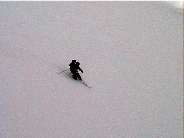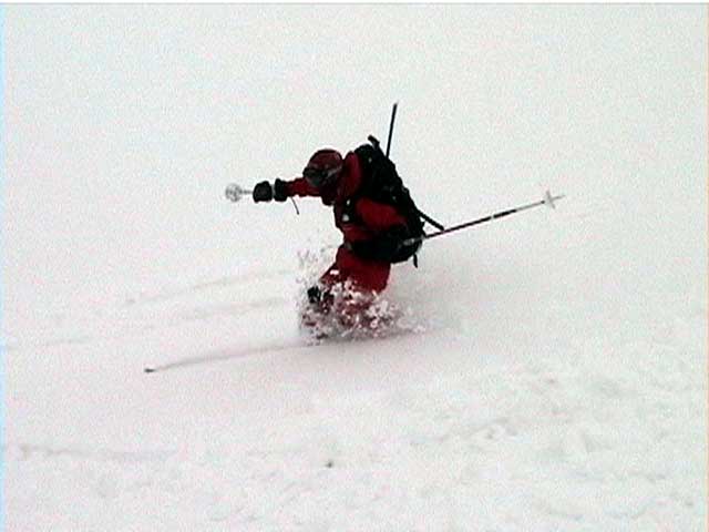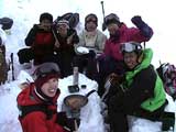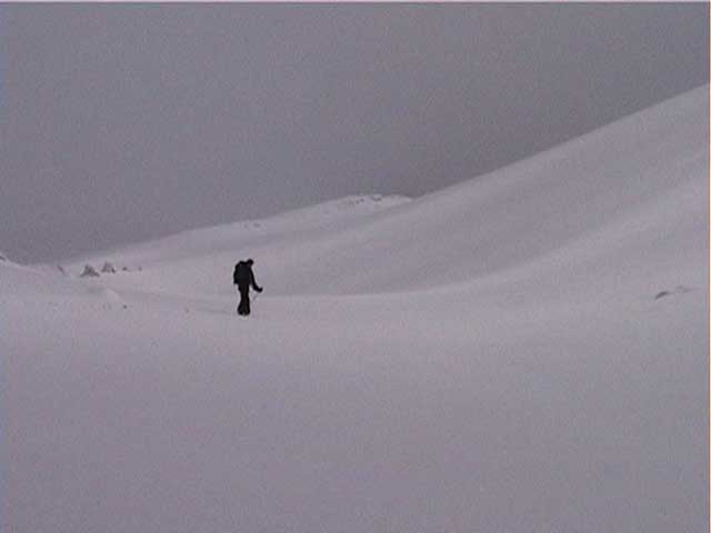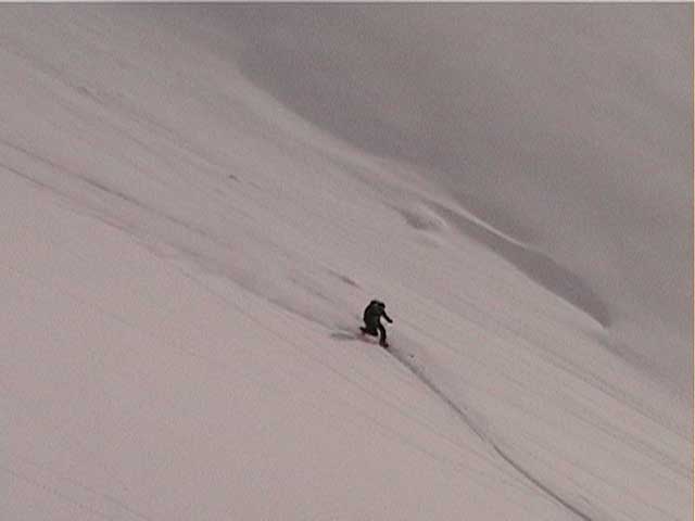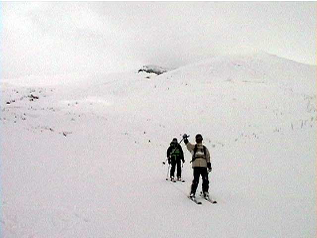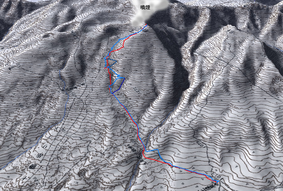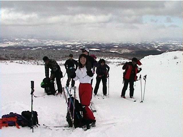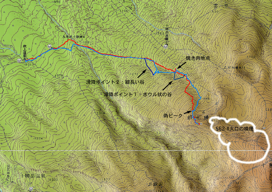 | 前十勝ツアー 結果:登頂成功 天候:曇り時々晴れ(山頂はガス) 風速:0〜3メートル 気温:-2〜-8度 雪量:十分 雪質:若干重めのパウダー、望岳台付近はダメ雪 コース:白銀荘〜前十勝 天候次第で登る山を決定する予定だったが、現地に着いてから悩む。 雲が多い・・が、晴れ間もある。 うーん、どうしようか。富良野ジャイアント尾根あたりが穏当なのだろうが、先週も行ったし〜。すでにボーダーとか先客が入っているし〜。やっぱり前十勝にしよう。そして、焼き肉を食べよう。デポ旗は多めに持っていこう。 今回の焼き肉山行には、皆さん気合いが入っている。 ゆきこは、新しいザックを新調して容量大幅アップ!その中身はもちろん大量の肉だ。 私は、火力の強いコールマンPeak-1を昨日購入。目的は低温下でも素早く肉を焼くこと。 佐藤さんは、スノーシャベルと見まごうばかりのでかい焼き肉プレートをザックに取り付けているし、長老も大きなフライパンとバーナーと・・ビールを一リットルも(私もだが)持っている。全部一人で飲む気なのだろうか? 完璧だ。完璧な焼き肉山行だ。 9:45白銀荘前出発 天候:曇り時々晴れ 無風 -4度 いつも通り、白銀荘からすぐ左手へ折れて樹林帯を横断し、望岳台の広い雪原へ出る(写真1)。樹林帯の中は素晴らしい雪質だった。 樹林帯の出口には火山活動観測小屋(無人)が建っており、良いランドマークとなっている。 ここには看板が建っていて、「S62-II火口付近は危険だから近づくな!」と書いてある。もちろん我々もむやみに火口に近づくつもりは無いが、具体的にどこからが立ち入り禁止地帯なのか、地図が示されていないのでよく分からない。 まあ、よい子の皆さんは前十勝には近づかない方が無難でしょう。あの噴煙に直接襲われたら亜硫酸ガスにまかれて死ぬかもしれないし、ひょっとしたら突然噴火するかもしれないし(その時はあきらめます)。我々も風向きによっては前十勝の山行は即中止である。 さて、悪い子(写真2(^_^;))の私たちは、前十勝を目指して望岳台を延々進む。雪は重たく、10センチくらいのラッセルなのにきつい。雪がシールに絡んでくる感じだ。高い標高の雪質が良いこと祈りながら登る(写真3)。 他に登山者はほとんど居ず、僅かにナマコ尾根方面へ向かったトレースと山スキーヤーを一名見かけただけだった。珍しいことに十勝岳本峰へ向かう登山者も居ない。 十勝岳避難小屋付近で休憩。手つかずのおいしそうな斜面だらけだ。雪質もだんだん良くなってきた。 ただし・・十勝岳名物の岩が出現しはじめた。薄ーい雪の下に尖った岩が隠れている(写真4)。こいつらは、スキー板で踏んでやって初めて正体を現す。そんな地雷岩がポツポツと出現しはじめた。 長老が、発見した岩に赤旗を立てて行くが、焼け石に水だろう・・・こいつらを踏まないためには、とにかく谷筋を外さないこと。さもないと、あなたの大事なスキー板に(ひょっとしたら頭にも)穴が空くことになる。 1550m地点から、先週クラストしていて登りに苦労した尾根へ上がった(写真5)。今回は尾根全体に雪が付いていて滑落の危険性は無かった。きつい登りの果てにようやく偽ピーク(1750m)に到着。ここは、山頂から220mほど手前の小ピークで、麓からはここが前十勝の山頂に見える。 ここから先は岩が出ているし、すっかり周囲もガスで覆われてきたので引き返そうと思ったのだが、長老の希望で前十勝のピークを目指すことになった。 12:50 前十勝山頂(1778m) 天候:ガス 風速2〜73ートル -8度 時々岩を踏みながらクラストした斜面を登り、15分ほどで登頂! 晴れていれば素晴らしい眺望が望めるピークだが、今回は真っ白。硫黄の臭いが鼻を突く。昨年より雪付きが悪く、ここからの滑降は不可能だった。また、地熱が高くなってきているのか頂上付近の雪が溶けていて水蒸気も上がっている。なんともイヤーな感じだ。 風向きが変わり、噴煙がこちらへ来る可能性が出てきたので、スキー板を担いでスタコラ退散する(写真7)。ヤバイヤバイ。 荷物をデポしていた偽ピークから、いよいよ滑降開始(写真8〜11)!雪質は良好だが、視界が悪すぎて斜面がよく見えない。雪酔い一歩手前の状況。 すぐそばにあるはずの雪庇からの墜落だけは避けたいので、慎重に降りざる終えなかった。良い雪を目前にして全く残念だ。 しばらく降下して、やっと視界が晴れてきた。 本日のメイン滑降斜面であるボウル状の谷は、若干雪が重たくなっていて、妖怪「板掴み」が少し棲息しているようだ。 各人、自分の滑降ラインを確保すべくトラバースし、端から順に滑降開始!(写真12〜14) ここでは、スキーヤーが少しでも弱気を見せると容赦ない愛のヤジが飛ぶ。「チョッカリー!」「もっと攻めて〜遅い遅い!飛ばせー!」「落ちろー」等々、あっ・・ゆきこさんは、突っ込みすぎ「危ない!」(写真15) 閑静な山麓に響く我々の歓声。 全員無事に降下し、ここで昼食タイムとなる。 13:35-14:58 1410m 焼き肉地点 テーブル、ベ