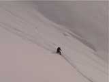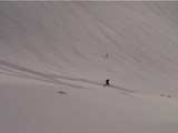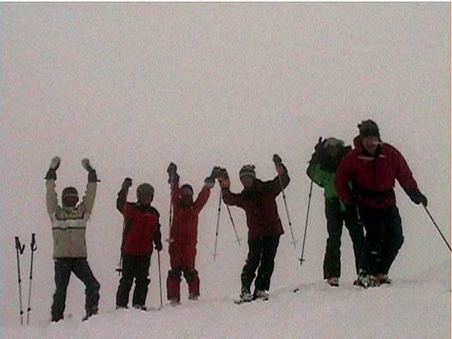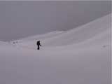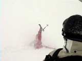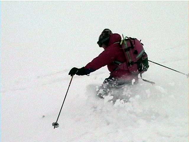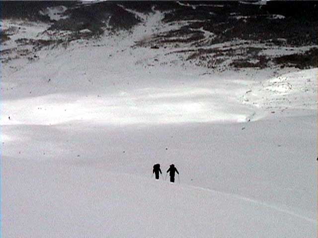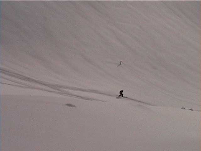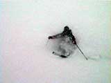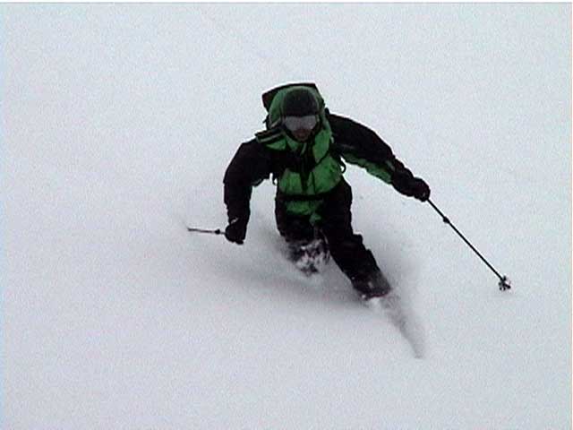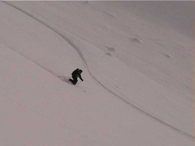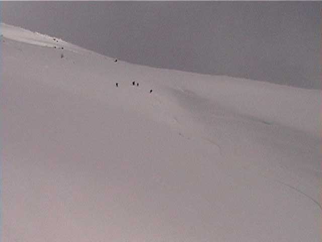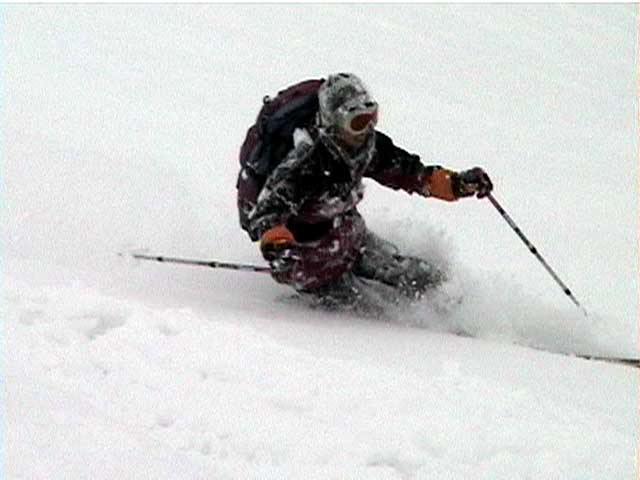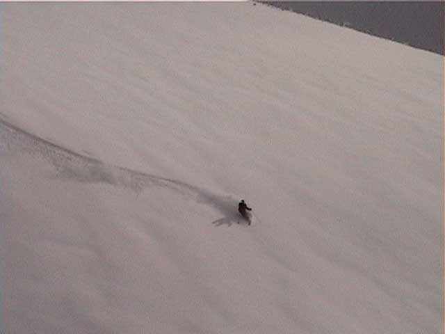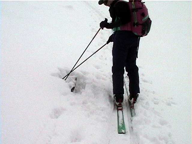 | 前十勝ツアー 結果:登頂成功 天候:曇り時々晴れ(山頂はガス) 風速:0〜3メートル 気温:-2〜-8度 雪量:十分 雪質:若干重めのパウダー、望岳台付近はダメ雪 コース:白銀荘〜前十勝 天候次第で登る山を決定する予定だったが、現地に着いてから悩む。 雲が多い・・が、晴れ間もある。 うーん、どうしようか。富良野ジャイアント尾根あたりが穏当なのだろうが、先週も行ったし〜。すでにボーダーとか先客が入っているし〜。やっぱり前十勝にしよう。そして、焼き肉を食べよう。デポ旗は多めに持っていこう。 今回の焼き肉山行には、皆さん気合いが入っている。 ゆきこは、新しいザックを新調して容量大幅アップ!その中身はもちろん大量の肉だ。 私は、火力の強いコールマンPeak-1を昨日購入。目的は低温下でも素早く肉を焼くこと。 佐藤さんは、スノーシャベルと見まごうばかりのでかい焼き肉プレートをザックに取り付けているし、長老も大きなフライパンとバーナーと・・ビールを一リットルも(私もだが)持っている。全部一人で飲む気なのだろうか? 完璧だ。完璧な焼き肉山行だ。 9:45白銀荘前出発 天候:曇り時々晴れ 無風 -4度 いつも通り、白銀荘からすぐ左手へ折れて樹林帯を横断し、望岳台の広い雪原へ出る(写真1)。樹林帯の中は素晴らしい雪質だった。 樹林帯の出口には火山活動観測小屋(無人)が建っており、良いランドマークとなっている。 ここには看板が建っていて、「S62-II火口付近は危険だから近づくな!」と書いてある。もちろん我々もむやみに火口に近づくつもりは無いが、具体的にどこからが立ち入り禁止地帯なのか、地図が示されていないのでよく分からない。 まあ、よい子の皆さんは前十勝には近づかない方が無難でしょう。あの噴煙に直接襲われたら亜硫酸ガスにまかれて死ぬかもしれないし、ひょっとしたら突然噴火するかもしれないし(その時はあきらめます)。我々も風向きによっては前十勝の山行は即中止である。 さて、悪い子(写真2(^_^;))の私たちは、前十勝を目指して望岳台を延々進む。雪は重たく、10センチくらいのラッセルなのにきつい。雪がシールに絡んでくる感じだ。高い標高の雪質が良いこと祈りながら登る(写真3)。 他に登山者はほとんど居ず、僅かにナマコ尾根方面へ向かったトレースと山スキーヤーを一名見かけただけだった。珍しいことに十勝岳本峰へ向かう登山者も居ない。 十勝岳避難小屋付近で休憩。手つかずのおいしそうな斜面だらけだ。雪質もだんだん良くなってきた。 ただし・・十勝岳名物の岩が出現しはじめた。薄ーい雪の下に尖った岩が隠れている(写真4)。こいつらは、スキー板で踏んでやって初めて正体を現す。そんな地雷岩がポツポツと出現しはじめた。 長老が、発見した岩に赤旗を立てて行くが、焼け石に水だろう・・・こいつらを踏まないためには、とにかく谷筋を外さないこと。さもないと、あなたの大事なスキー板に(ひょっとしたら頭にも)穴が空くことになる。 1550m地点から、先週クラストしていて登りに苦労した尾根へ上がった(写真5)。今回は尾根全体に雪が付いていて滑落の危険性は無かった。きつい登りの果てにようやく偽ピーク(1750m)に到着。ここは、山頂から220mほど手前の小ピークで、麓からはここが前十勝の山頂に見える。 ここから先は岩が出ているし、すっかり周囲もガスで覆われてきたので引き返そうと思ったのだが、長老の希望で前十勝のピークを目指すことになった。 12:50 前十勝山頂(1778m) 天候:ガス 風速2〜73ートル -8度 時々岩を踏みながらクラストした斜面を登り、15分ほどで登頂! 晴れていれば素晴らしい眺望が望めるピークだが、今回は真っ白。硫黄の臭いが鼻を突く。昨年より雪付きが悪く、ここからの滑降は不可能だった。また、地熱が高くなってきているのか頂上付近の雪が溶けていて水蒸気も上がっている。なんともイヤーな感じだ。 風向きが変わり、噴煙がこちらへ来る可能性が出てきたので、スキー板を担いでスタコラ退散する(写真7)。ヤバイヤバイ。 荷物をデポしていた偽ピークから、いよいよ滑降開始(写真8〜11)!雪質は良好だが、視界が悪すぎて斜面がよく見えない。雪酔い一歩手前の状況。 すぐそばにあるはずの雪庇からの墜落だけは避けたいので、慎重に降りざる終えなかった。良い雪を目前にして全く残念だ。 しばらく降下して、やっと視界が晴れてきた。 本日のメイン滑降斜面であるボウル状の谷は、若干雪が重たくなっていて、妖怪「板掴み」が少し棲息しているようだ。 各人、自分の滑降ラインを確保すべくトラバースし、端から順に滑降開始!(写真12〜14) ここでは、スキーヤーが少しでも弱気を見せると容赦ない愛のヤジが飛ぶ。「チョッカリー!」「もっと攻めて〜遅い遅い!飛ばせー!」「落ちろー」等々、あっ・・ゆきこさんは、突っ込みすぎ「危ない!」(写真15) 閑静な山麓に響く我々の歓声。 全員無事に降下し、ここで昼食タイムとなる。 13:35-14:58 1410m 焼き肉地点 テーブル、ベ