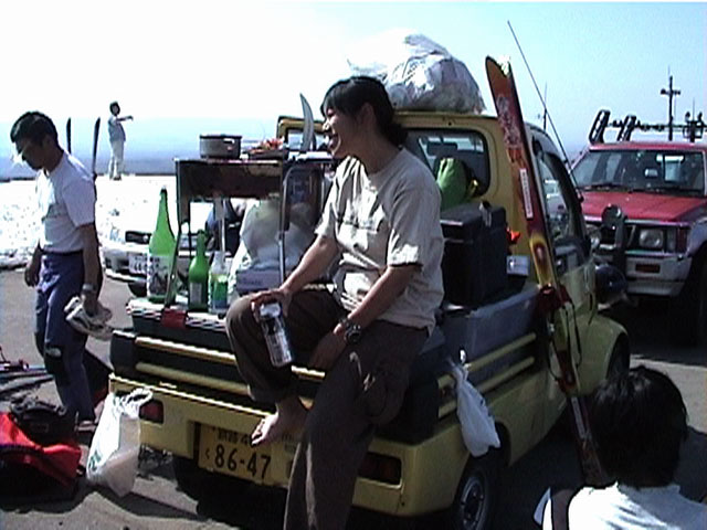 漁師ミゼット上で、ビール片手に幸せそうな山女さん。