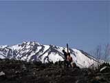 富良野岳をバックに、家族で登る微笑ましい風景。