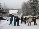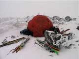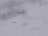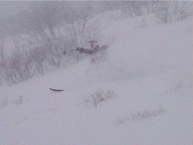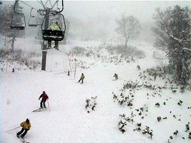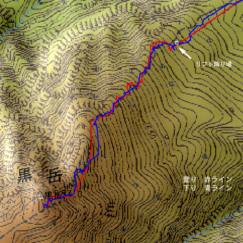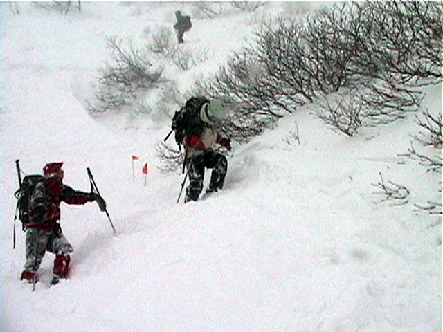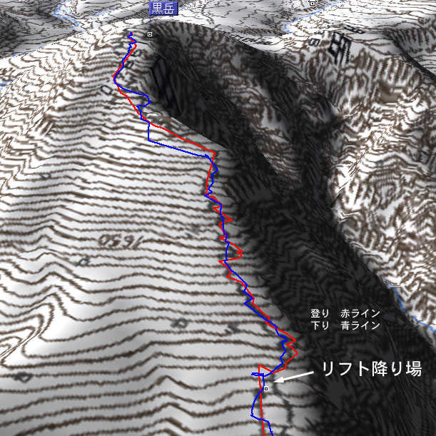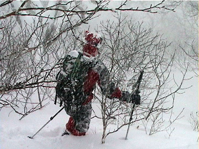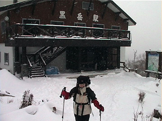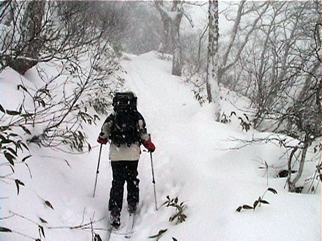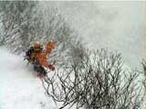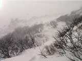 | 結果:登頂成功 天候:雪 風速:0〜20メートル 気温:-4〜-8度 雪量:7合目で1メートル 雪質:軽い粉雪 コース:層雲峡〜黒岳 リフト終点10:16-8合目11:00-9合目11:25-12:10黒岳山頂12:20-リフト終点13:40 今日は黒岳スキー場開き。例年より一週間遅れのオープンだ。先週黒岳を登った方から、雪がもう一降りすれば滑降可能だろうという情報を得ていたので、今シーズン初パウダーを狙ってみた。 9:10 層雲峡到着 天候:雪 無風 予定より一時間以上遅れて層雲峡黒岳ロープウエイ層雲峡駅へ到着(写真1)。天気予報では曇り時々雪だったが、来る途中で吹雪がひどくて回転灯が初稼働した。 今シーズンは天然雪初オープンを中山峠スキー場に奪われたせいかスキーヤーが少なく、思ったより駐車場が空いていて驚いた。 8時に始発のロープウエイを狙っていたのだが、乗り込めたのは9時40分。実は昨夜遅くまで行方不明の装備を探していたので寝坊したのだ。 シーズン初めは、いつもこうなので、反省。 ロープウエイの大人往復運賃は1,650円なり。 9:50 ロープウエイ黒岳駅 天候:雪 無風 -4度 がらんとしたゴンドラに乗って黒岳駅へ到着(写真2)。思ったより雪があったので一安心。この駅に備えてある入山届で、帯労のまささん達一行の入山を確認。他にはフラテが入山しているようだ。「これは・・・ラッセル泥棒ができる!」夫婦共々がぜん登る気満々となる。 10:10 リフト乗り場 天候:雪 無風 気温-5度 なんと、スキー場のオープニングセレモニー(写真3)に捕まり、若干遅れてしまった。例年オープン日の10時に行われるとのことだが、我々にとってはリフトに乗れずイライラするだけの催し。来シーズンにはかち合わないようにしよう。 リフト料金は大人片道400円。オープン日の特典は得に無し。ディタイム券という、リフト・ロープウエイ乗り放題の券(3,600円)は、ここではなくロープウエイ駅で売っている。 ゲレンデの様子は写真4の通り。まだ積雪が少なくて、リフト下のコースのみオープンしている。11月25日まではスノーボード禁止。 10:16 リフト終点 天候:雪 風速:2メートル 気温-5度 さあ、いよいよパウダーの世界へ出発だ。 最近このあたりで遭難や行方不明が続いたせいか、こんな注意書き看板が建っていた(写真5)。登り口付近は、まだ笹が顔を出している状態(写真6)。 11:00 8合目 天候:雪 風速:2メートル 気温-8度 気温が降下。風はほとんど無いが時々強い突風が吹く。稜線上は凄い風が吹いているらしく、上空から轟音が響いてくる。 先発しているパーティのラッセルのおかげで順調だ。例年ならこのあたりで引き返しているのだが、まささん達と会えるまで登ることにした。 11:25 9合目 天候:雪 風速:5メートル 気温-9度 降雪が激しい。このあたりで膝下までのラッセル程度の積雪量で、9合目の標識がかろうじて顔を出していた(写真7)。もうすぐ完全に埋まってしまうだろう。 このあたりから傾斜がきつくなり、特徴的な岩塊を左手に見ながら大きくジグを切っていく(写真8,9)。 山頂まであと100メートルといったあたりで、やっと下山中のまささん達のパーティと出会えた(写真10)。とてもうれしい。まささんは、新兵器のビデオでさっそく撮影中(写真11)。我々はせっかくなので山頂を踏んでくることにして一旦分かれ、少し標高を下げたところで再び合流することにした。 12:10 黒岳山頂(1984m) 天候:吹雪 風速15〜20メートル -12度 山頂直下ではアイゼンが必要かと思ったが、スキーのまま簡単に登頂できた。 しかし、うぉー!!山頂は猛烈な風が吹いていて、立っているのがやっとの状態(写真12)。 フラテの方々はツエルトに籠もっていた(写真13)が、我々はとてもじゃないが長居なんてできない。(めずらしく)ビールも飲めない。記念撮影もそこそこに直ちに滑降準備に入いったが、シールを剥がしヘルットを被る間にも、たちまち顔が凍りついていく。冗談じゃない。とっととおさらば。 12:20 滑降開始 山頂直下はかなりの急傾斜だが、雪は膝までの絶好のパウダーで、灌木も無い!思い切って滑降開始(写真14〜15)!! 素晴らしいパウダーランを楽しめた。オーンズで滑りの感覚を取り戻しておいたせいか、スムーズにテレマークターンが決まる。 9合目付近でまささん達と合流し、一緒にフェスショット級のパウダーを楽しんだ(写真16〜18)。 こんなに条件の良い黒岳は初めてだ。 しかし、楽しかったのはここまで。 特に8合目から下は、灌木が濃くてほとんど滑りを楽しむことができなかった。藪スキーの名手であるきたさんも、手こずっていたようだ(写真19)。 滑降時には、東へ迷い込みやすいので注意されたい。かといって西へ行きすぎると絶壁だ。所々にテープが吊してあるので、注意すれば迷うことは無いが、GPSとコンパスで現在地の確認を行いながら降りた。 まだ雪が締まっていないので、ストックを突くとそのまま深く潜ってしまい、バランスを崩して転倒してしまう。 おかげで数え切れないくらい転んだ。頭から雪に突っ込み、窒息しそ