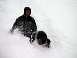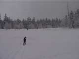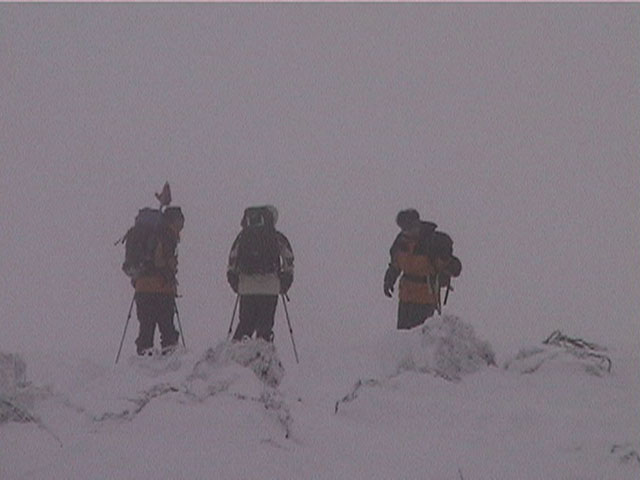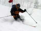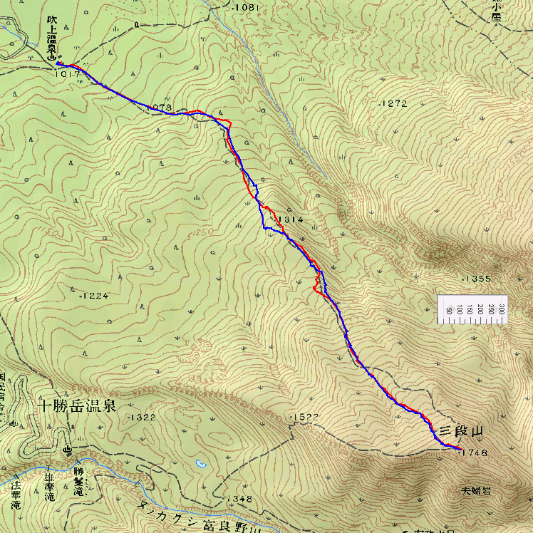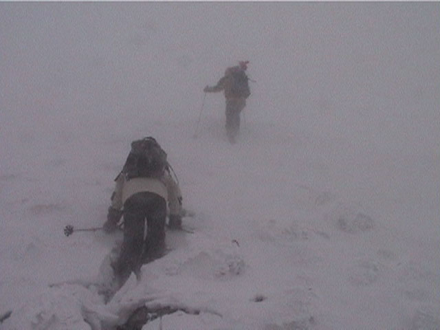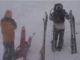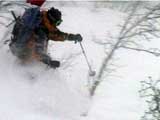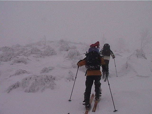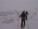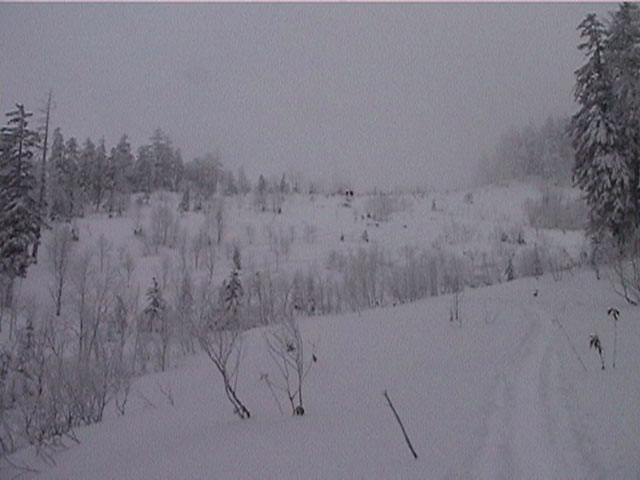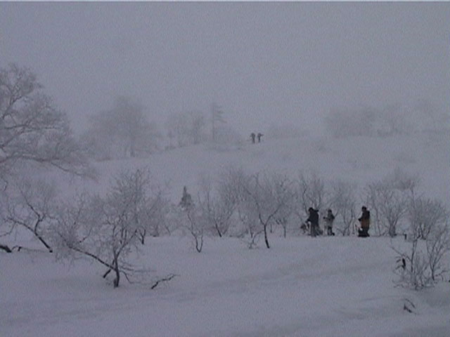 | 結果:登頂成功 天候:雪 風速:0〜15メートル 気温:-12〜-24度 雪量:あと、50センチは足りない 雪質:下部は軽い粉雪、上部はウインドパック〜クラスト状態 コース:白銀荘〜三段山 夏道コース 白銀荘10:00-10:20一段目10:30-11:00二段目11:10-11:30三段目-12:48三段山山頂12:56-14:25白銀荘 かりにも三段山クラブと名乗る集団が、未だ今シーズン三段山登頂を果たしていないとは、まったくもって由々しき事態であーるっ。 行かねば、登らねば、滑らねば!! しかし、道北地方は一昨日から大荒れの天候・・・参加予定者からもキャンセルの電話や待てども来ない者がいたりして・・・ 9:35白銀荘(1017m)10:00 天候:くもり 無風 -12度 当初は8名程度で登る予定だったのだが、結局山頂を目指したのは3名ぽっきり。少々トホホな感じだが、結構こんなトホホ感が好きな旦那であった(さらにトホホなことに、ジャケットを忘れてHiroさんから借りる旦那)。 悪天候が予想されたが、なぜかこの付近は小康状態。 他のパーティーは3組くらいが先発していた。 他には、一歳のりんたろう君と共に二段目を目指すN西夫妻(写真1)や白銀荘周辺でテレマーク犬ハッピーと共に雪中訓練を行うスーさん一家(写真2)が居た。そんなこんなで、なんとなく出発。 10:20一段目10:30 30センチくらいの深さのラッセル跡を辿り、ブッシュだらけの一段目に到着(写真4)。ここで前回の旭岳でも一緒になったK宮さんとバッタリ!お互いあまりの奇遇に苦笑しつつ一緒に登る。 11:00二段目下11:10 天候:雪 風速2メートル 気温-15度 二段目も、まだブッシュが多い(写真5)。しかし雪質は大変良く、斜面を選べば十分パウダーを楽しむことができる。ここから上は雪も少なそうだし、風も強そうだ。今日のコンディションなら、頭の良い人はこのあたりから下で登り返して楽しむのだろう。しかし、我々は違ぁう! N西さんとは、ここでお別れ。 11:30二段目上 天候:雪 風速5メートル 気温-17度 視界100メートル以下 案の定、二段目から上は天候どんどん悪化、気温急降下、ハイマツだらけ。綿下着のK宮さんはここで引き返し、残る三馬鹿トリオは登山続行(写真6,7)。 12:25山頂直下(1668m)12:35 ちょっとヤバイくらいに吹雪いてきた。目の回りが氷結してきたので、珍しく登りでゴーグルを着用し目出帽を・・・あれ?無いゾ!「Hiroさん、俺、目出帽忘れて来ちゃったよ」「ハハハ、僕もです」「えー!」 これはかなり致命的な忘れ物。旦那はゆきこさんから予備の目出帽を借りたが、Hiroさんは・・・鍛えているから大丈夫だろう。 視界がまったく効かず、デポ旗を打ちまくりながら登り、これまた珍しく稜線上の滞在時間を少しでも減らしたい一心で稜線直下にスキーをデポ(写真8)。その後ハイマツの間に落ちながら這うようにツボ足で山頂を目指す(写真9)。けっこう辛い。 12:48三段山山頂(1748m)12:56 天候:雪 風速15メートル 気温-24度 視界15メートルくらい 感動の山頂シーン(写真10,11)。これくらい悪条件下だと三段山でも十分達成感が得られる。しかし、感動に浸っている暇はない。すでに手足先の感覚は無く、鼻はもげそう・・・すぐにこの冷凍地獄から脱出せねば! HiroさんのeTrex Ventureや、旦那のGPS12XLは、-24度の環境下でもしっかり動いていた(写真12)。こんな状況下ではGPSが本当に頼もしい。 14:25白銀荘(1017m) 天候:くもり 無風 気温-12度 滑降に関しては、二段目まではずっとボーゲンでハイマツを縫うようにしながら降りてくるしかなかった。おまけに旦那は三段目で底なし沼のような深雪スポットにつかまり難破しそうになった。 そこから下は、上に比べりゃパウダー天国とはいえ、ゆきこさんは戦意喪失ダメダメ状態。旦那とHiroさんのみキャーキャー喜んで滑っていたが(写真13,14)、Hiroさんはパウダーに潜んでいた枝に引っかかり大破(幸い無事だったけど)。 白銀荘へ到着後、とりあえずビールを一杯やってから風呂に浸かったが、体の芯から冷えていて、なかなか温まらない。風邪引きそう。 感想: 凄く良い耐寒訓練になりましたよ。 -24度&15メートルの風には、三重グローブも、二重靴下も通用せず、 幸いひどい凍傷は免れたとはいえ、これを書いている今も指先が痺れているし、夫婦揃って鼻の頭の皮もむけた。 しかし、今回旦那が一番驚いたのは三段目ではまった底なし深雪の恐怖だった。 別に転んだ訳ではなく、ただそこに立っているだけでどんどん沈んでいき、ストックを突いてもなんの手応えも無し。 たった一メートル先のクラストした斜面へ脱出するために、周りの雪をかき集めてスキー板の下に詰め込み、少し進んではまた沈む・・・これを繰り返して結構な時間を要した。もう少し距離が長かったら、仲間にザイルを投げてもらい、引っ張ってもらうしかなかったでしょう。もし単独行だったら・・これは恐い。 まあ、とりあえず祝!今シーズン初登頂。 |