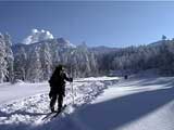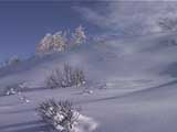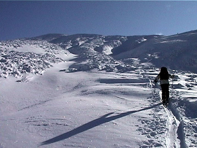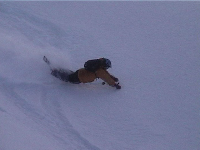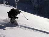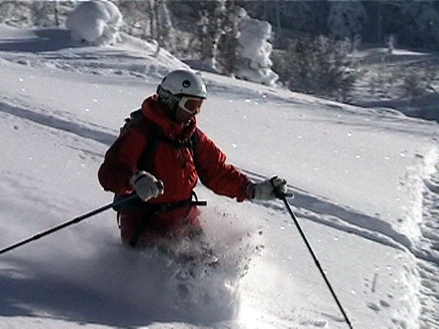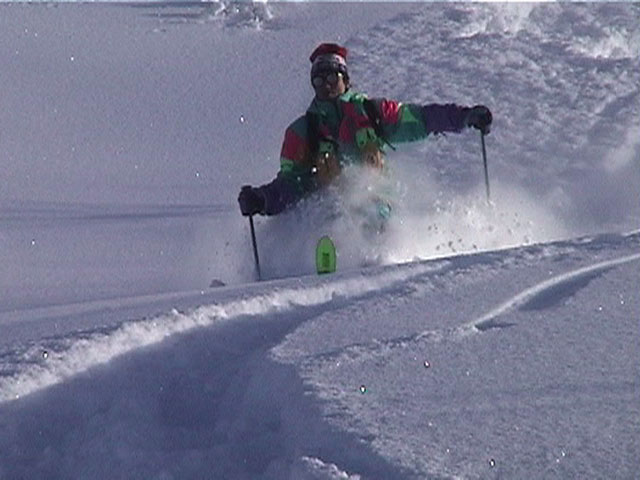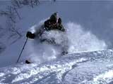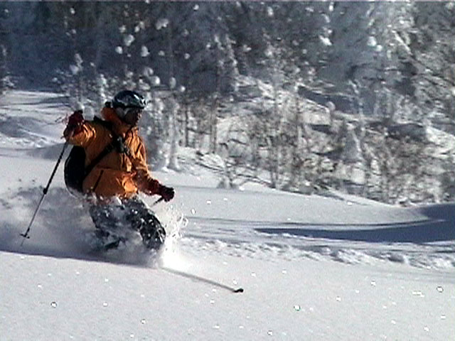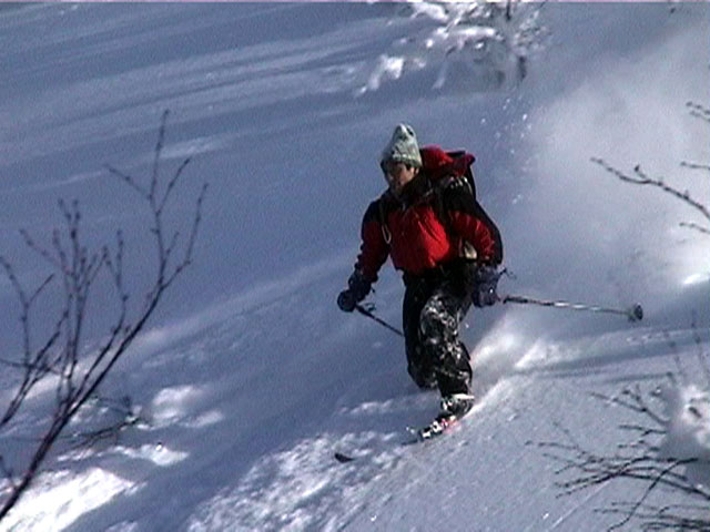登ってきたルートは、すでにかなり荒らされていたので、少し西へトラバースしてバージントラックを狙った。ほとんど滑られていない谷を見つけて滑降開始(写真8〜11)。雪質は最高のパウダーだが、ハイマツが多くてかなりコースは限られる。もし少しでもコースを逸脱したらハイマツの餌食だ。
