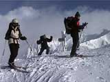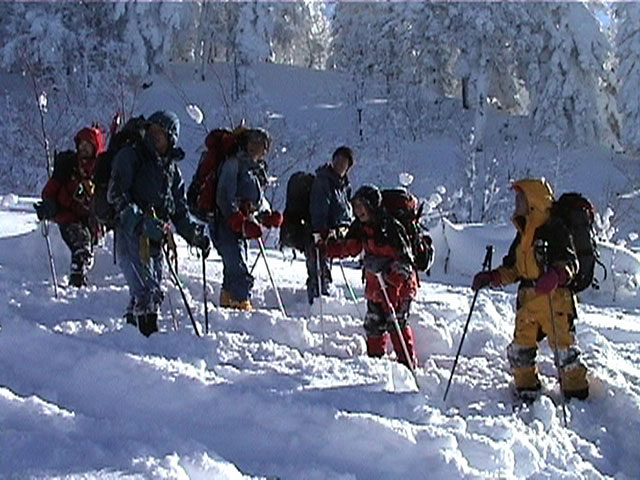 ここで再び帯広畜産大学山岳部と出会った(写真18)、彼らの装備は山スキー、テレマーク、割ボードとバラエティに富んでいて、興味深かった。昔の大学山岳部といえば、山スキー以外は許されない雰囲気があったと思うが、時代は変わったのだ。