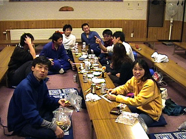 白銀荘の休養室で、三クラブ合同臨時宴会を行い(写真19)、漁師が釧路から持ってきてくれた新鮮な刺身をごちそうになった。ビデオでお互いの転びっぷりを称え合いながら、突っつく刺身はうまかった。