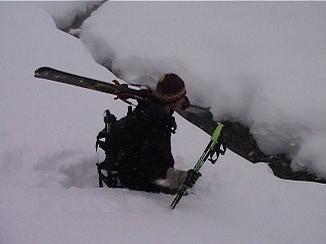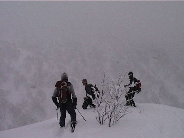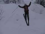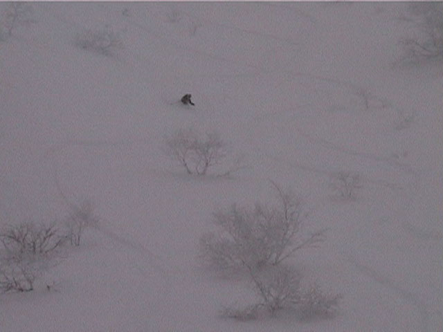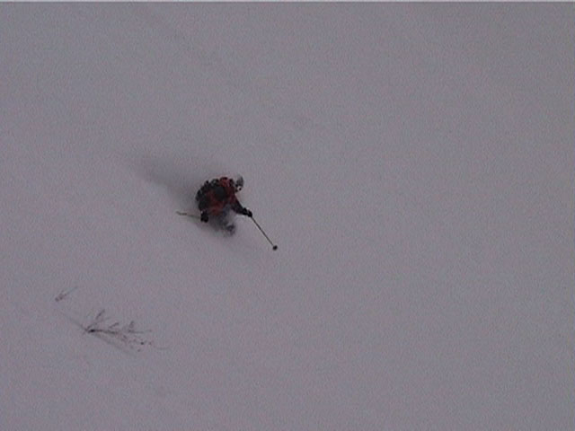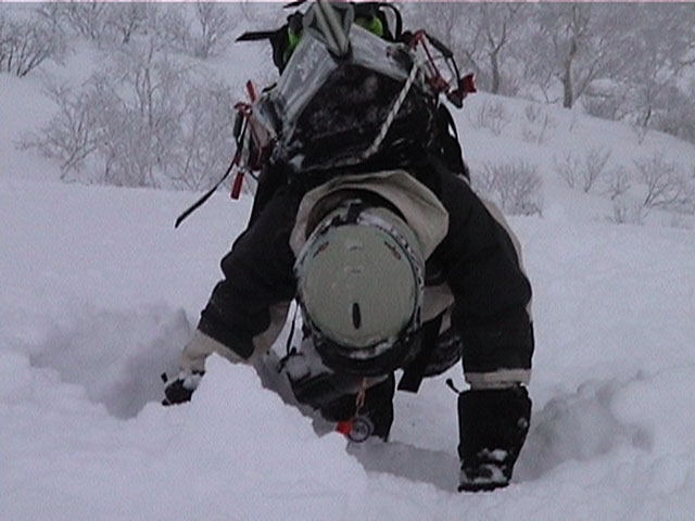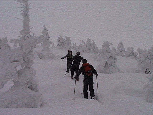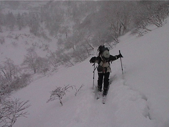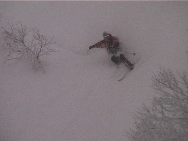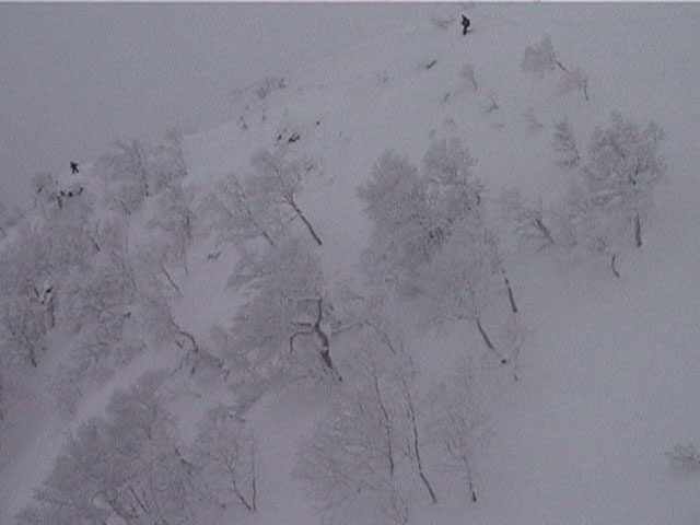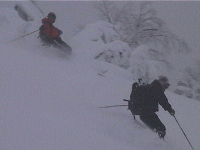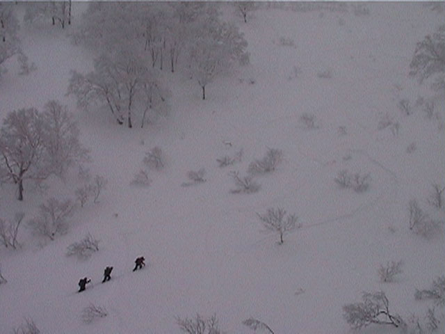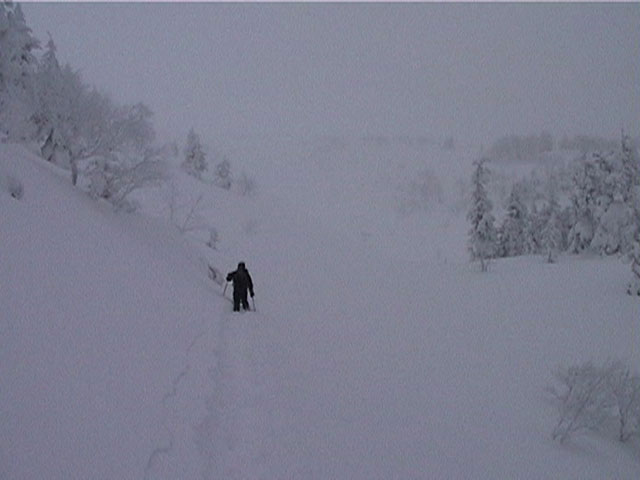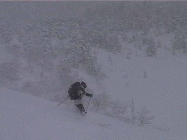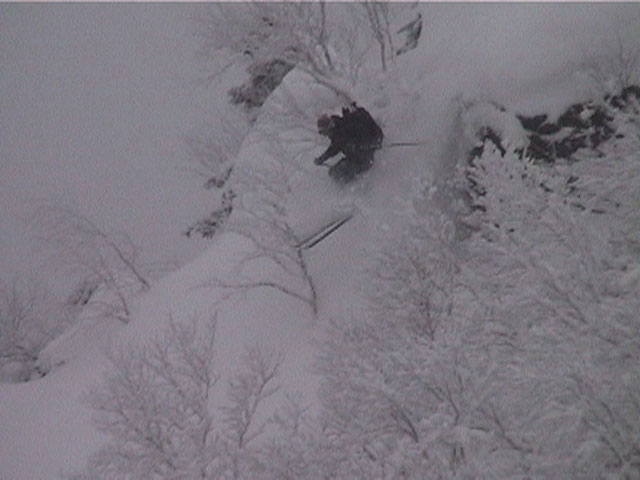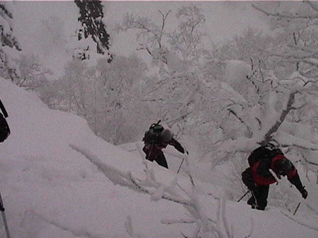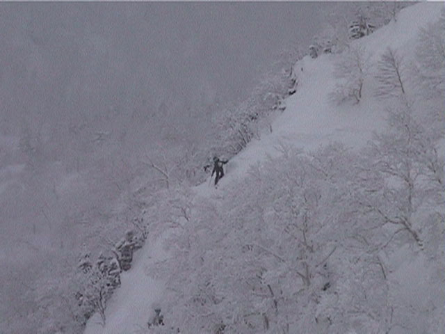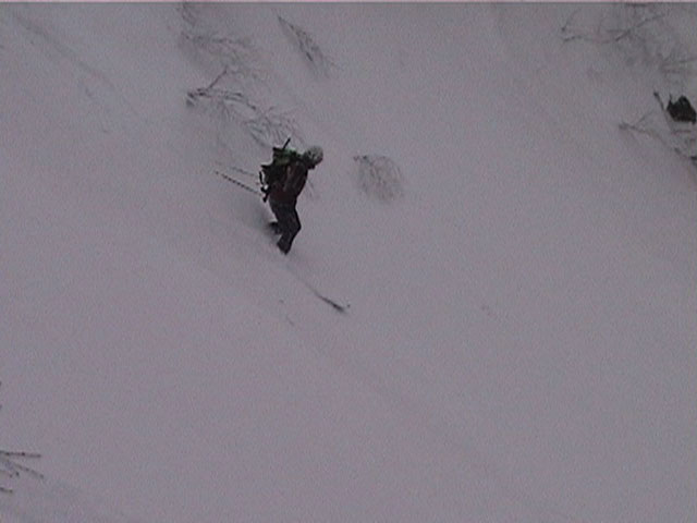 | 2002年1月19日(土) 三峰山沢スキーツアー(崖・雪崩・滑落なんでもこい!) 結果:三峰山沢を二回滑降 天候:くもり〜雪 風速:0〜3メートル 気温:-15〜-20度 雪量:十分 雪質:極上パウダー(弱層あり) コース:温泉沢〜三峰山沢 今回はNAB(ノーザン・アバンチュール・ボーイズ)のツアーに三段山クラブがおじゃました。前日の夜に突然お誘いを受けて驚いたが、NABの過激な滑りを拝見する良い機会なので、修行のつもりで参加させてもらった。 フィールドは、上ホロカメットクの下部、三峰山沢。 参加した感想は、過激!の一言に尽きる。アイスバーンの上に40〜50センチの軽い雪という非常に危険な雪質の、崖のような斜面を、雪崩を誘発させながら滑り落ちる。登り返す。また滑り落ちる・・・ はっきり言って、これは普通のバックカントリーツアーではない。とても高いスキルと度胸が要求される、エクストリームスキーに近いものだ。当然、滑っているフィールドもまともではない。 雪崩の危険性が高く、登りも滑降も非常に危険であるため、地図は削除しました。 凌雲閣前10:10-温泉沢10:21-11:25最高高度到達点(1407m)-11:35後は三峰山沢を二回登り返し14:50-15:28温泉沢-15:40凌雲閣前 メンバー:旦那、ゆきこ、U田、I橋、ファルコン(順不同 三段山クラブ&NAB)合計5名 |