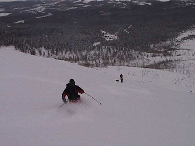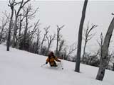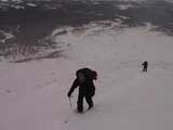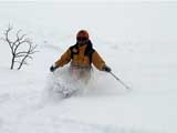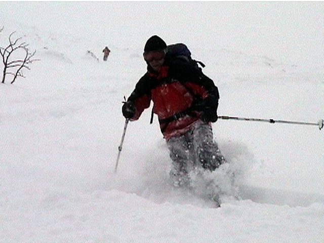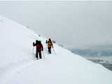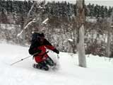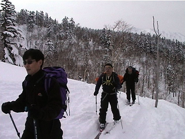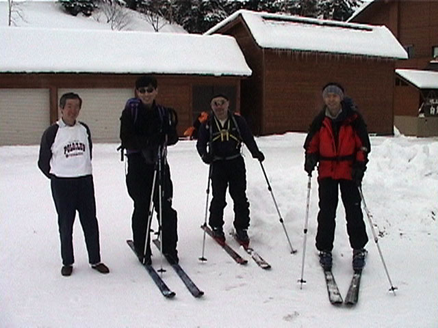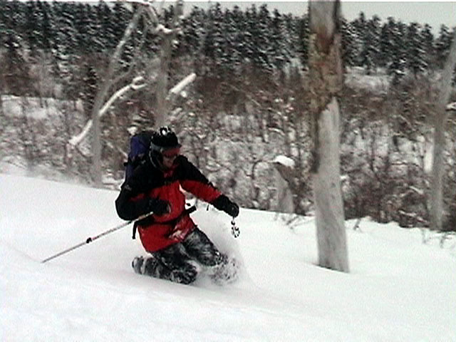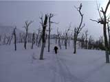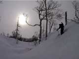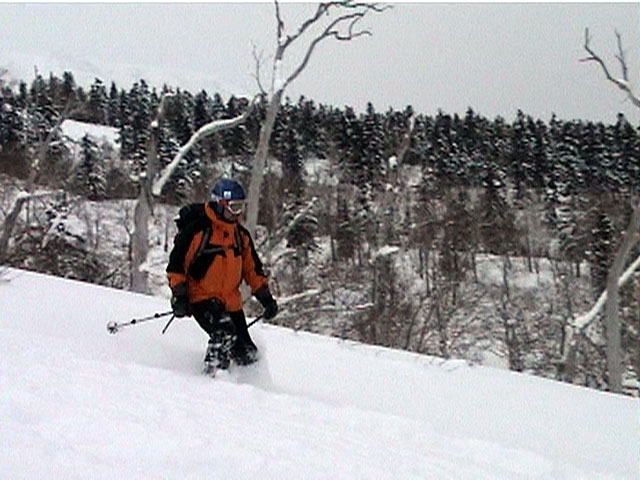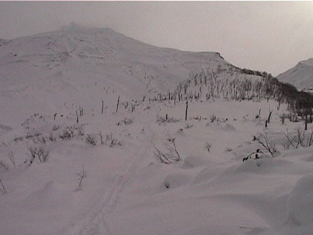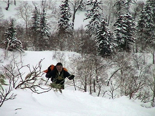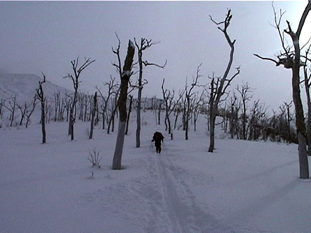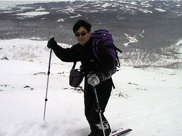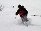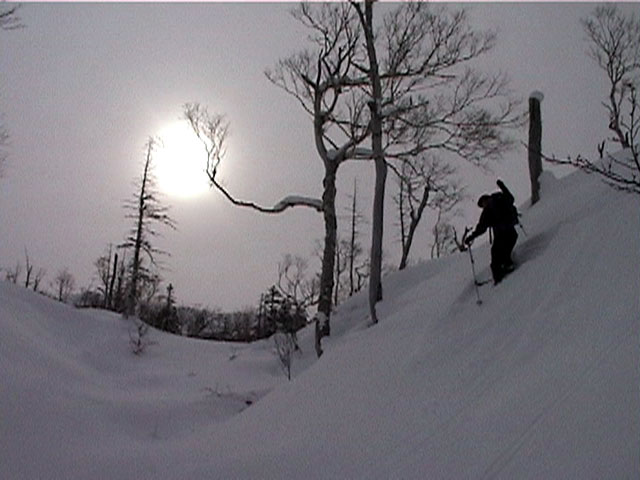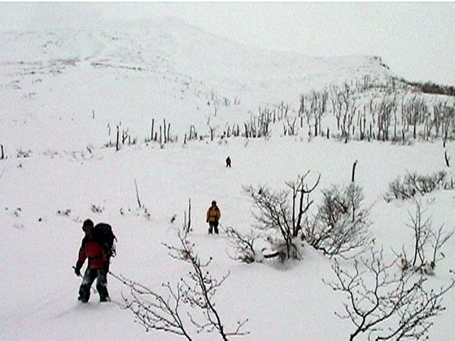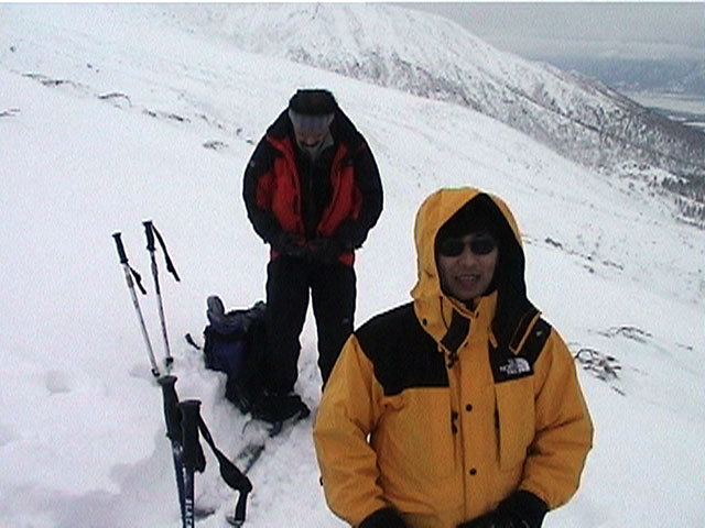 | 2002年1月27日(日) 前十勝スキーツアー(正面スロープは臭かった・・) 前回に引き続き、名古屋から来てくれた大学時代からの旧友との恒例ツアーです。 午後から全道的な大荒れとの天気予報に怯えつつ、今シーズン初めての前十勝へトライしてみました。天候は終日曇天のまま、強風に襲われる前に無事下山できました。 しかし、風向きの関係でS62火口からの噴煙を浴びてしまい、咳き込みながらのツアーとなりました。 ルートは、前十勝のピークへの最短ルートとし、正面スロープを登り、降りてくるルートにしてみました。比較的手軽に1000メートル級の大斜面へアプローチできるのでお勧めです。斜面の下部ではカバワラ尾根か急傾斜の谷筋を選択できます。どちらもおもしろそうです。 雪質は昨日と同じ、アイスバーンの上にパウダーという状態でしたが、この日の晩に吹き荒れた強風でパウダーの部分が全て飛んでしまい、ハイマツだらけになってしまいました。 結果:1587m地点から滑降 天候:曇天 風速:0〜4.5メートル 気温:-10度 雪量:十分 雪質:パウダー(約30センチ下にアイスバーン) コース:白銀荘〜前十勝 登り:正面スロープ 下り:正面スロープ 白銀荘9:48-10:45カバワラ尾根11:05-12:20 1587m 12:42-13:55白銀荘 メンバー:旦那、もりりん、矢澤、toshiさん 合計4名(順不同) |