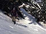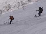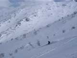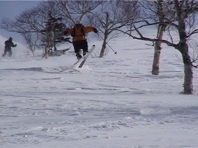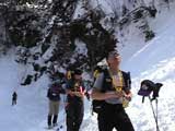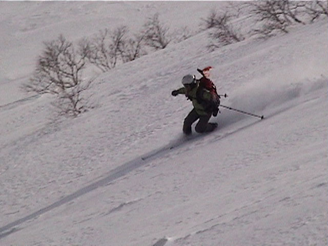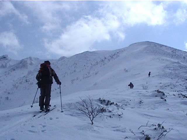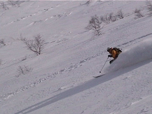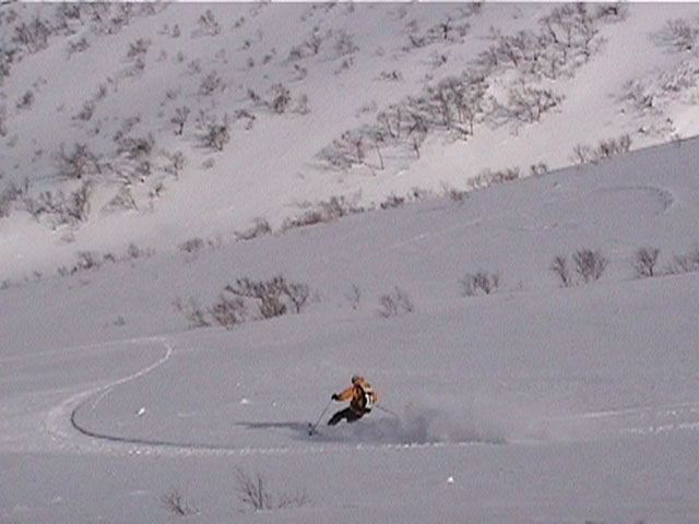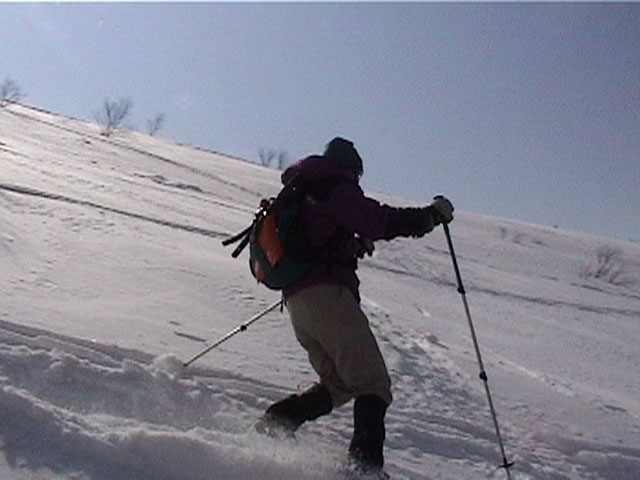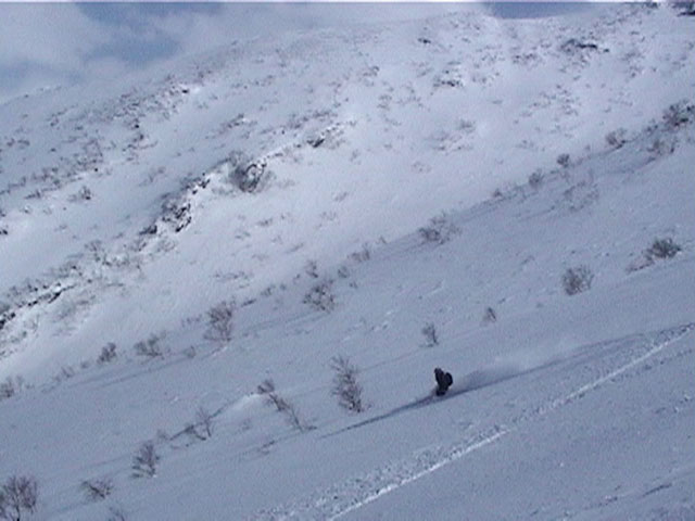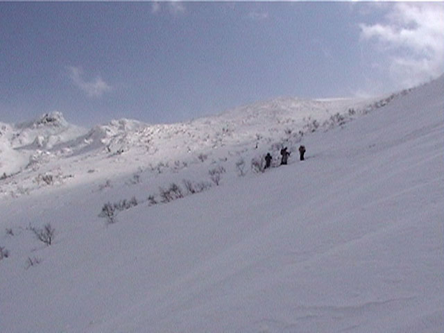 | 2002年3月20日(水) 富良野岳スキーツアー(ひさしぶりだね!快晴のベベルイ沢) 結果:1548m地点から滑降 天候:曇り〜晴れ 風速:0〜15メートル 気温:0〜-5度 雪量:十分 雪質:重雪の上にパウダー、一部クラスト、樹林帯は良好なパウダー コース:ジャイアント尾根〜ベベルイ谷〜ジャイアント尾根 バーデン上富良野前10:20-10:40ベベルイ沢の滝10:50-12:00森林限界(1370m)-12:42滑降地点(1548m)12:54-14:42バーデン上富良野前 メンバー:旦那、K山、スー、N西、mannen(順不同)合計5名 K山さんと一緒のツアー二日目、今日は仕事を休んで駆けつけてくれた三段山クラブ員と偶然白銀荘で出会ったK山さんの知り合いmannenさんとの5名でツアー。 めずらしく快晴下での富良野岳ツアー。いつも悪天候の時ばかり入っていたが快晴の富良野岳も良いものだ。そのことを再認識した貴重なツアーだった。 北尾根には他にもツアーが入っていたが、ジャイアント尾根は我々だけ。パウダーをたっぷりと独り占めする事ができた。 (お願い)ツアー中にmannenさんがデジカメを落としています。もし拾われた方がいたら、ぜひウエブマスターまで、ご連絡ください。 |