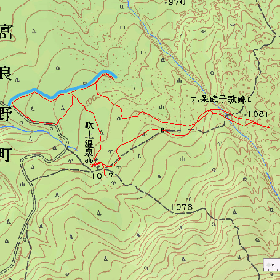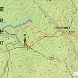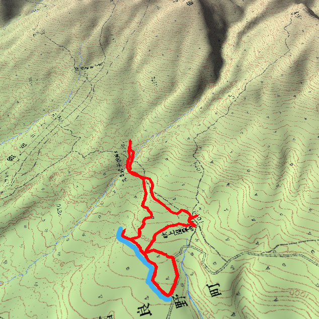 (赤のラインが歩いた軌跡、水色は目印テープのぶら下がっていたところ)