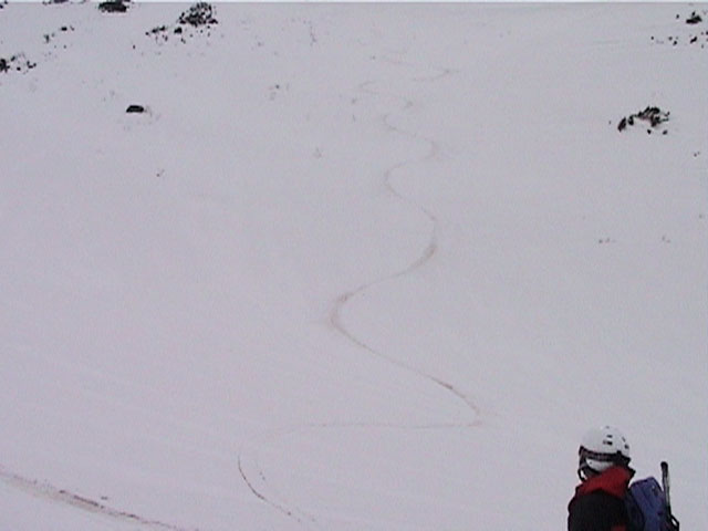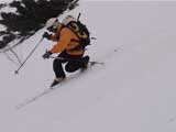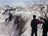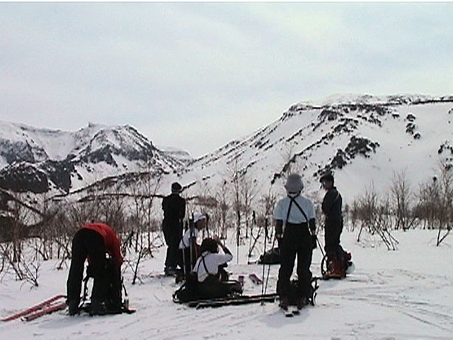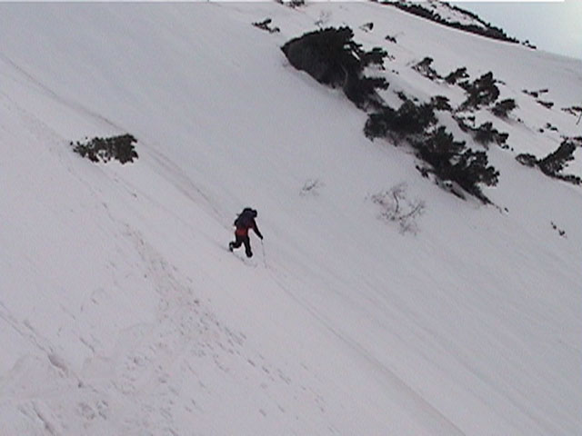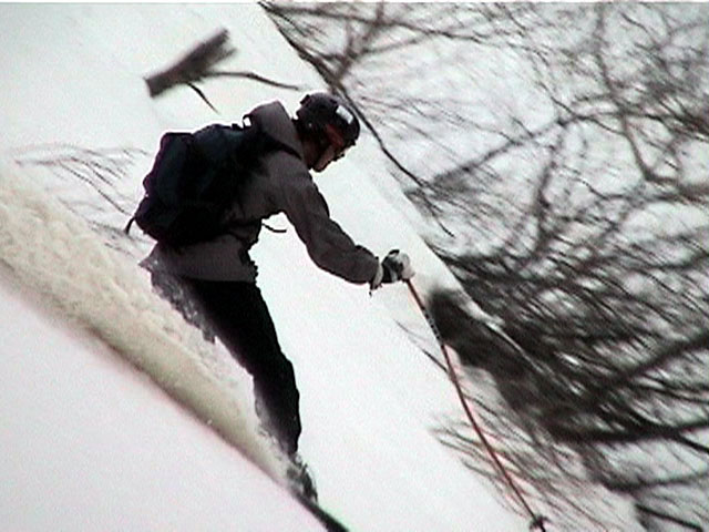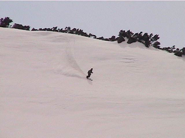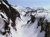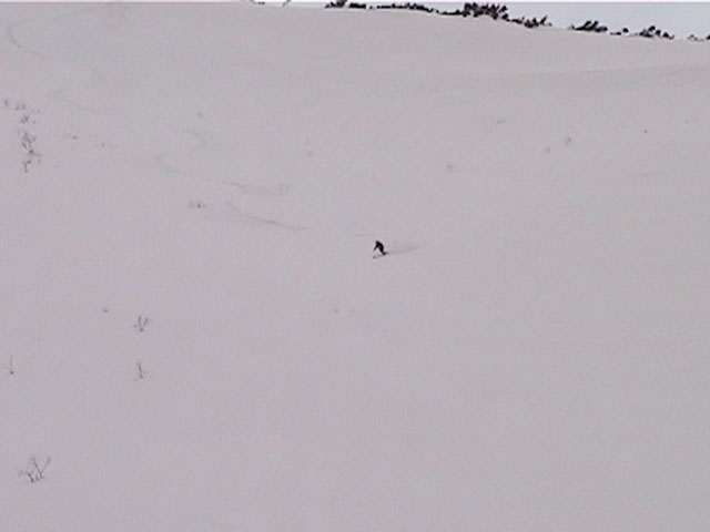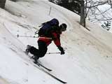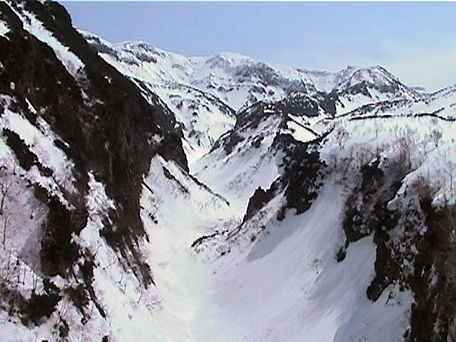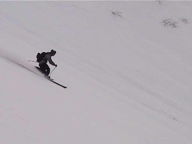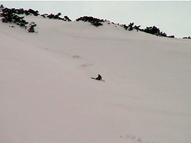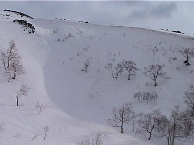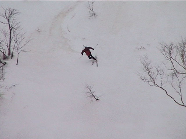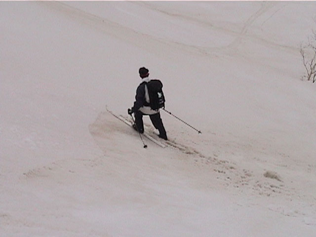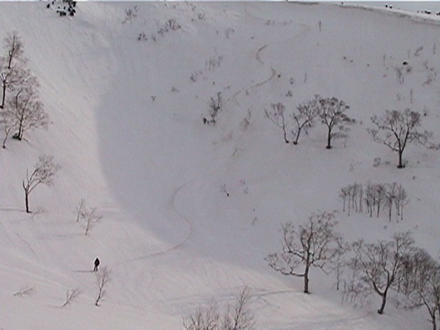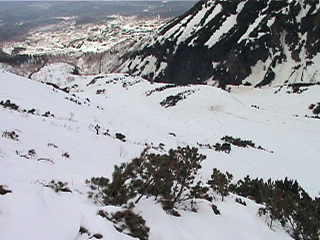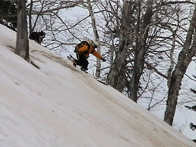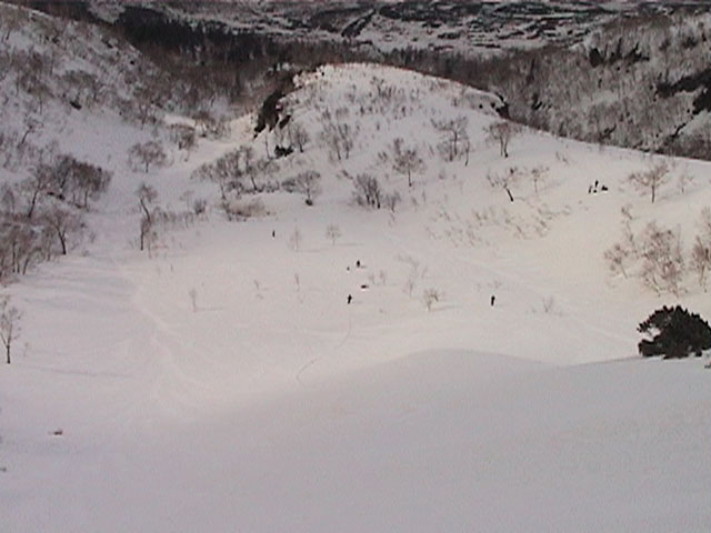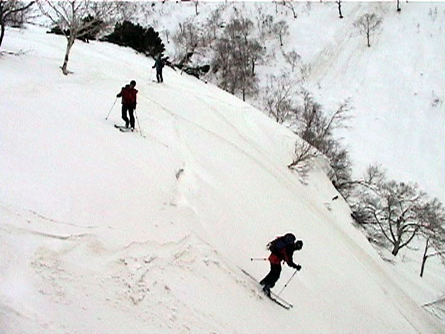 | 2002年4月13日(土) 三段山ナマコ尾根スキーツアー(フリコ沢サーカス) 通常よりも半月以上早い雪解けに焦り気味の僕ら。今回はツアー初めての初心者と超過激テレマーカーが一緒なので、行き先には頭を絞った。結局、ナマコ尾根をつめてフリコ沢にベースを構え、周りの緩急様々な斜面をお好みで登り返して楽しむ事にした。 行ってみたら、これが意外と・・・イイ!斜度40度級のオープンバーンに囲まれ、他に登山者も居ず、カッコイイV字型の渓谷もある。雪庇からのジャンプ、崖からの落下・・僕らは時間を忘れて登り滑りを繰り返し、フリコ沢サーカスを楽しんだ。 ちなみに急斜面に囲まれたこの場所は雪崩の巣である。今回もデブリや雪崩の跡を目にしたので、特に厳冬期には近づかない方が良い。この時期にも全層雪崩に注意しよう。 結果:フリコ沢滑降しまくり 天候:晴れのち曇り 風速:0〜3メートル 気温:10〜12度 雪量:先週からは劇的に減ったが、コースを選べば十分に滑降可能。ただし尾根はハイマツがひどいので避けた方が良い 雪質:黄砂の上に1センチの新雪。おかげでシュプールが茶色浮かび上がる。部分的にはパウダーもどきが残っている コース:白銀荘〜ナマコ尾根 白銀荘9:50-11:30ナマコ尾根最深部14:32-16:23白銀荘 メンバー:旦那、ゆきこ、スー、toshi、チリ、かっちゃん(漁師7号)、みどりママ、さとう 合計8名(順不同) |
