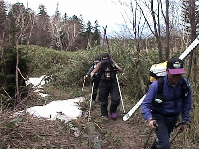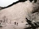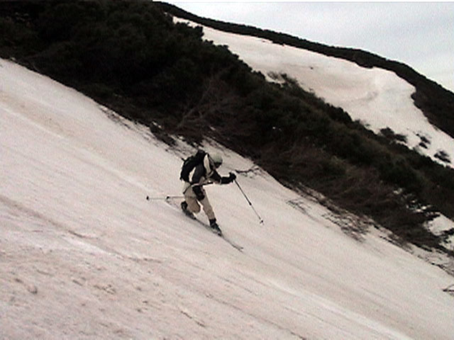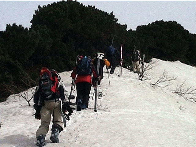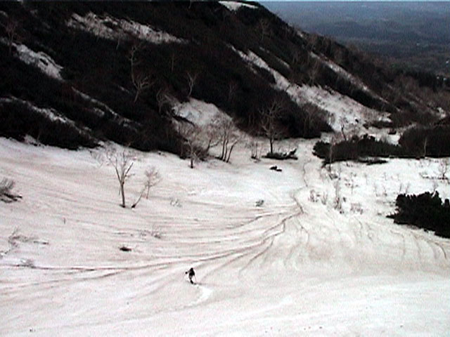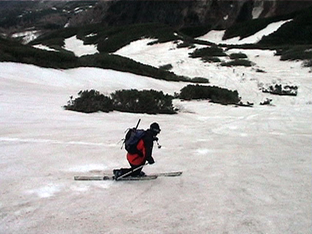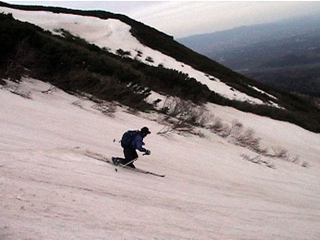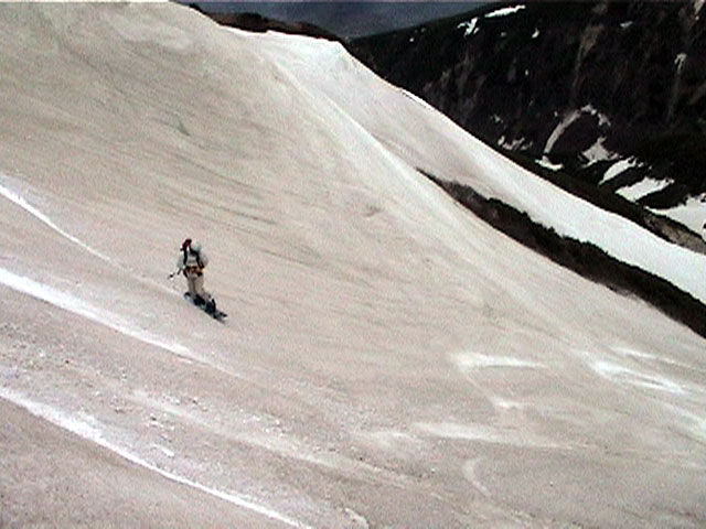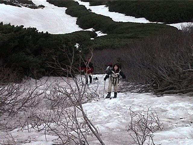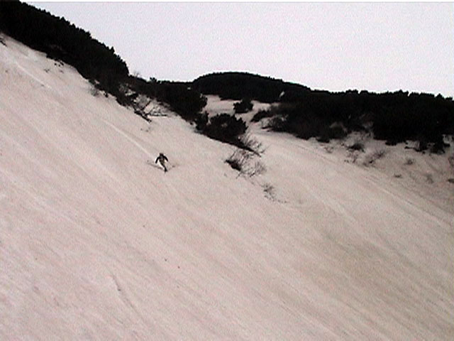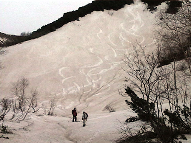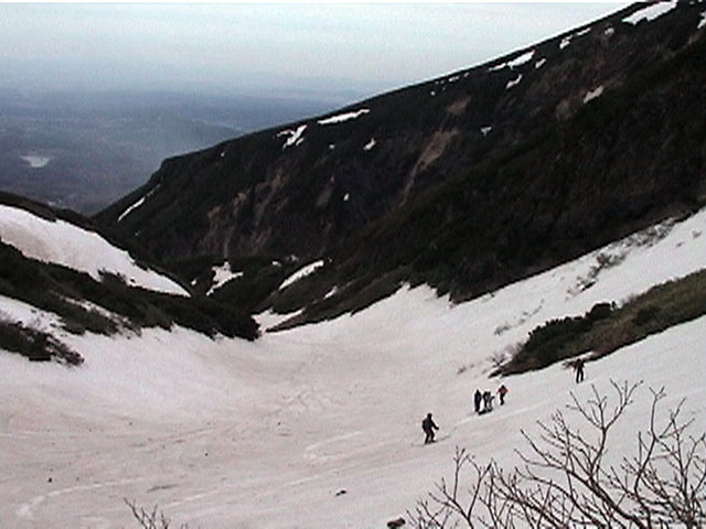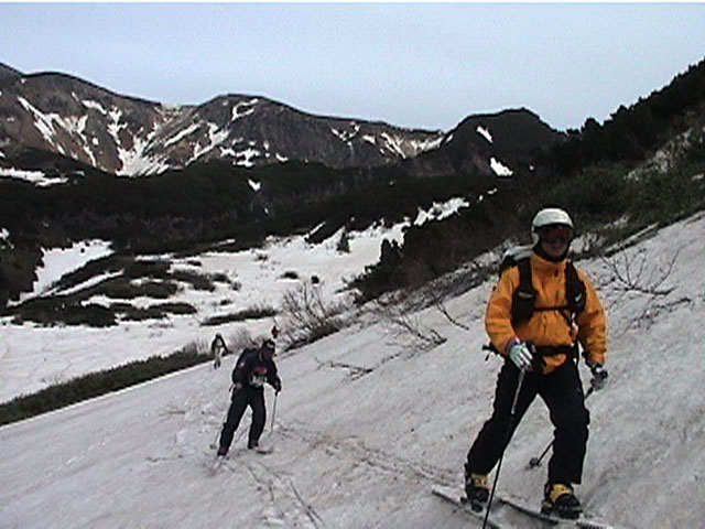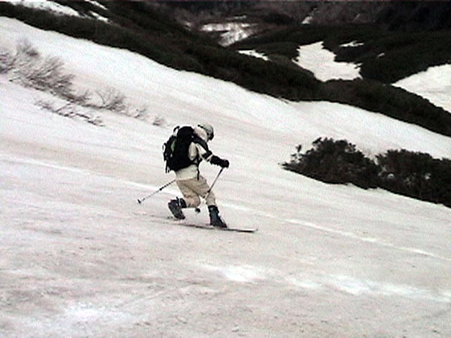 | 2002年5月11日(土) 三段山フリコ沢スキーツアー(三段山ラストラン) 例年より2週間ほど早く、三段山での最後のスキーツアーを行いました。 雪は、やはり少なくて白銀荘から一段目までは板担ぎ。そこから南西ルートを行けば稜線までシールで登高できます。 (滑降してみて分かったのですが、三段山へ向かって右側の樹林帯を行けば、白銀荘から稜線までずっとシール登高が可能です。) 下りは、山頂からフリコ沢へ滑降し、谷から二段目へトラバースしてきました。フリコ沢には、まだ豊富に雪がありますが、山頂直下はとても急傾斜で、途中でコースが狭くなっている部分があります。滑落に注意してください。 フリコ沢の中は、谷と谷との間の雪が切れはじめており、もう少しでハイマツにより分断されて谷の通過が困難になりそうです。無理すればまだスキー滑降は可能だと思いますが、かなりスキー板を担がなければならないし笹藪を通過する箇所も増えるでしょう。 僕らは、今回で三段山のスキー滑降は打ち止めと致します。 お詫び:ボーダーの方と一緒にツアーを行いましたが、コース取りの配慮が足りなくてずいぶん大変な思いをさせてしまい申し訳ありませんでした。滑降気味にトラバースする事、滑降途中で立ち止まるときには再出発しやすいように緩傾斜地点にすること、樹林が密で急な斜面は避けることなど、指摘されるまで注意が足りませんでした。文句一つ言わずに笑顔でついてきてくれたきよみさんに感謝します。 ピンクテープ:我々がせっせと回収したピンクの標識テープが、またしてもシーズン終了間際にどこかのスットコドッコイによって取り付けられたようで、雪渓外のハイマツ上に点々とぶら下がっていました。 雪が溶けたことにより、テープの位置は手の届かない高さ&ハイマツの奥深くになっており、テープに接近して回収することができませんでした。おかげで、この一夏の間は意味のないピンクテープが景観に紛れ込むことになります。 夏道とは全然違う位置にぶら下がっているので、これを目にした人はコースが混乱するかもしれません。 蛍光ピンクって、すごく新緑に映えますねぇ・・・まったくのコース外に連なることになってしまったピンクテープの存在は、滑稽を通り越してもの悲しさすら感じさせます。 怒:「こいつをぶら下げた奴!シーズン終了間際なら、なおさらのことちゃんと回収しろ!」 失礼しました。 天候:曇り時々晴れ 気温:5度〜12度 風速:3〜10メートル 雪量:少ない 雪質:ザラメの上に黄砂 コース:白銀荘〜ナマコ尾根 白銀荘9:50-13:05三段山山頂13:36-16:20白銀荘 メンバー:旦那、ゆきこ、スー、toshi、N西、キ、きよみ 合計7名(順不同) |