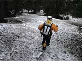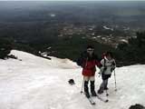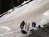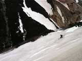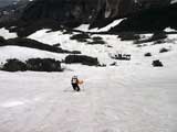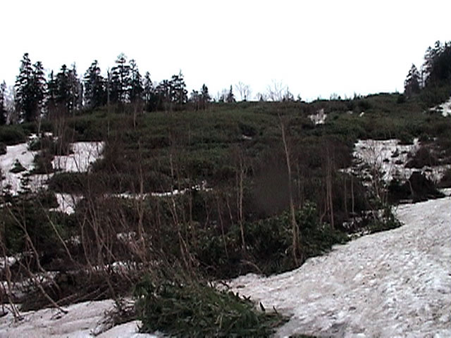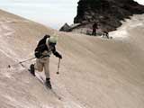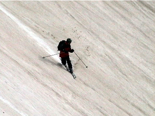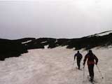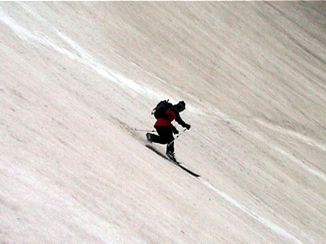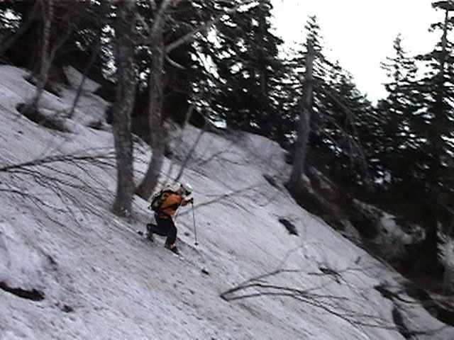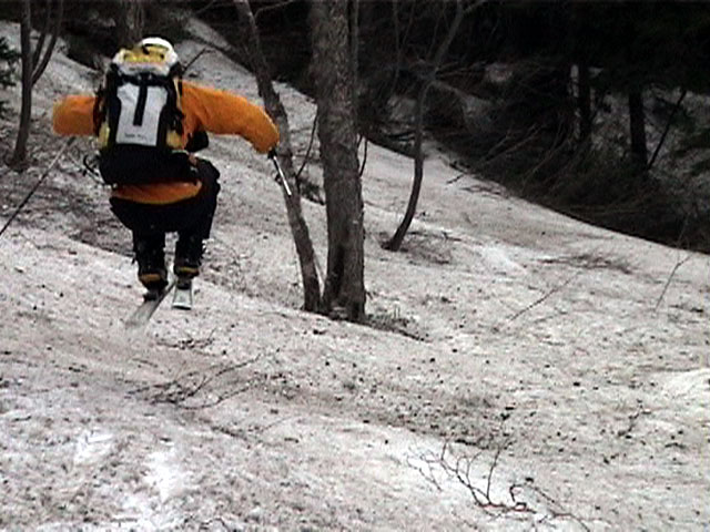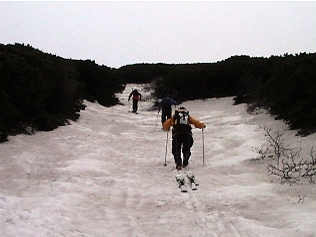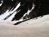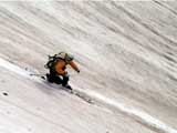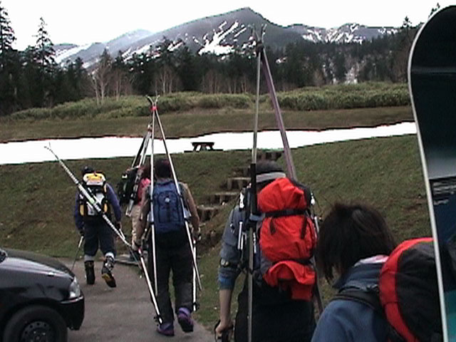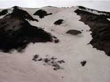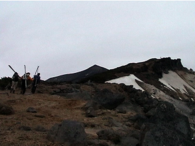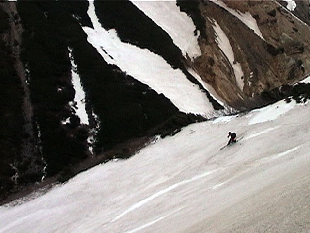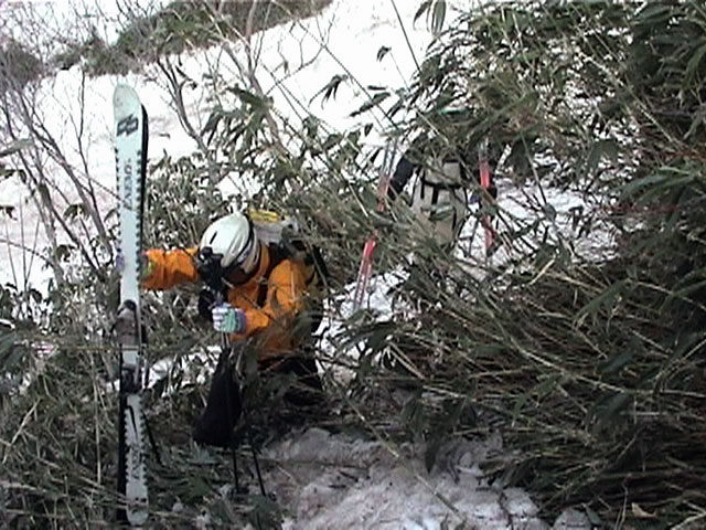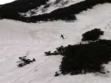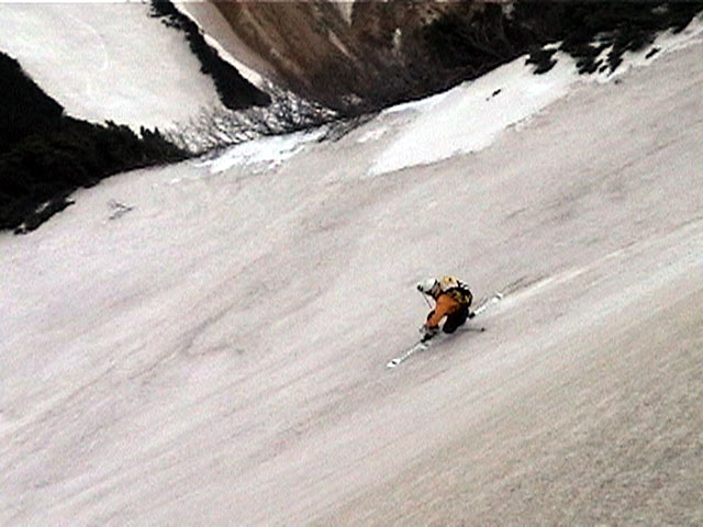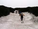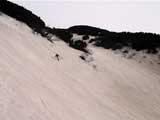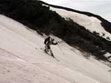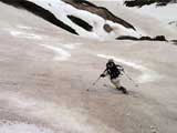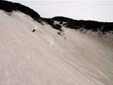 | 2002年5月11日(土) 三段山フリコ沢スキーツアー(三段山ラストラン) 例年より2週間ほど早く、三段山での最後のスキーツアーを行いました。 雪は、やはり少なくて白銀荘から一段目までは板担ぎ。そこから南西ルートを行けば稜線までシールで登高できます。 (滑降してみて分かったのですが、三段山へ向かって右側の樹林帯を行けば、白銀荘から稜線までずっとシール登高が可能です。) 下りは、山頂からフリコ沢へ滑降し、谷から二段目へトラバースしてきました。フリコ沢には、まだ豊富に雪がありますが、山頂直下はとても急傾斜で、途中でコースが狭くなっている部分があります。滑落に注意してください。 フリコ沢の中は、谷と谷との間の雪が切れはじめており、もう少しでハイマツにより分断されて谷の通過が困難になりそうです。無理すればまだスキー滑降は可能だと思いますが、かなりスキー板を担がなければならないし笹藪を通過する箇所も増えるでしょう。 僕らは、今回で三段山のスキー滑降は打ち止めと致します。 お詫び:ボーダーの方と一緒にツアーを行いましたが、コース取りの配慮が足りなくてずいぶん大変な思いをさせてしまい申し訳ありませんでした。滑降気味にトラバースする事、滑降途中で立ち止まるときには再出発しやすいように緩傾斜地点にすること、樹林が密で急な斜面は避けることなど、指摘されるまで注意が足りませんでした。文句一つ言わずに笑顔でついてきてくれたきよみさんに感謝します。 ピンクテープ:我々がせっせと回収したピンクの標識テープが、またしてもシーズン終了間際にどこかのスットコドッコイによって取り付けられたようで、雪渓外のハイマツ上に点々とぶら下がっていました。 雪が溶けたことにより、テープの位置は手の届かない高さ&ハイマツの奥深くになっており、テープに接近して回収することができませんでした。おかげで、この一夏の間は意味のないピンクテープが景観に紛れ込むことになります。 夏道とは全然違う位置にぶら下がっているので、これを目にした人はコースが混乱するかもしれません。 蛍光ピンクって、すごく新緑に映えますねぇ・・・まったくのコース外に連なることになってしまったピンクテープの存在は、滑稽を通り越してもの悲しさすら感じさせます。 怒:「こいつをぶら下げた奴!シーズン終了間際なら、なおさらのことちゃんと回収しろ!」 失礼しました。 天候:曇り時々晴れ 気温:5度〜12度 風速:3〜10メートル 雪量:少ない 雪質:ザラメの上に黄砂 コース:白銀荘〜ナマコ尾根 白銀荘9:50-13:05三段山山頂13:36-16:20白銀荘 メンバー:旦那、ゆきこ、スー、toshi、N西、キ、きよみ 合計7名(順不同) |