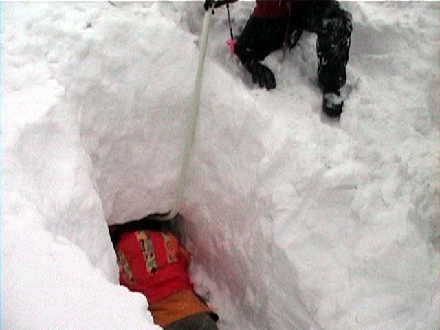二メートル近くまで掘った穴に潜り込む。頭部周りの空間を確保し、呼吸用ホースを設置した |