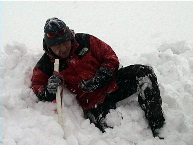 埋没後、呼吸用ホースと無線機を使って、「どんな気持ちですか?」「息苦しいですか?」