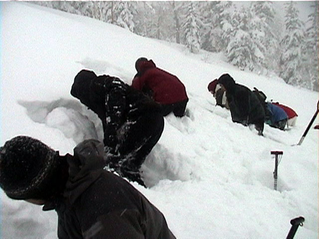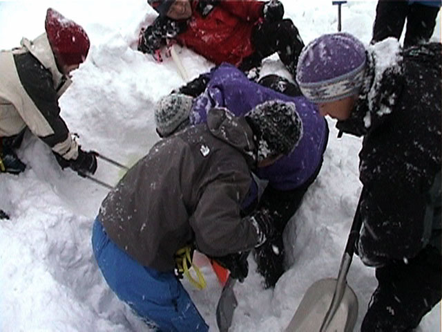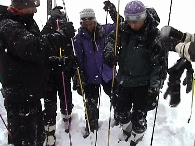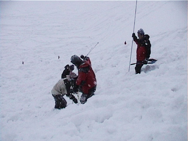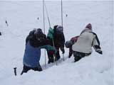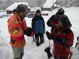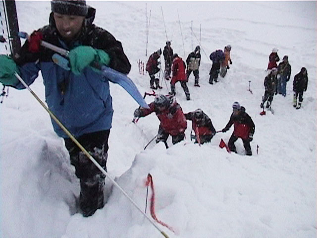 リーダーが周辺警戒と分担を指示し、ゾンデ棒、シャベル、ビーコンなどに分かれて捜索 |