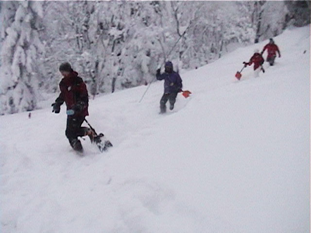 雪崩想定地帯を示すデポ旗で囲った斜面に遭難者の最後の目撃想定地点を示すデポ旗をたて、ビーコンを仕込んだザックを付近に埋めておき、5名1チームの救助隊が突入して何分後にザックを発見できるか競った
