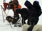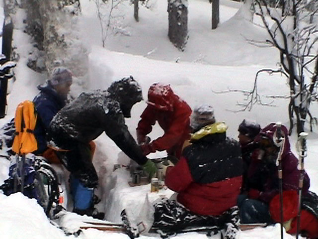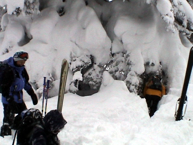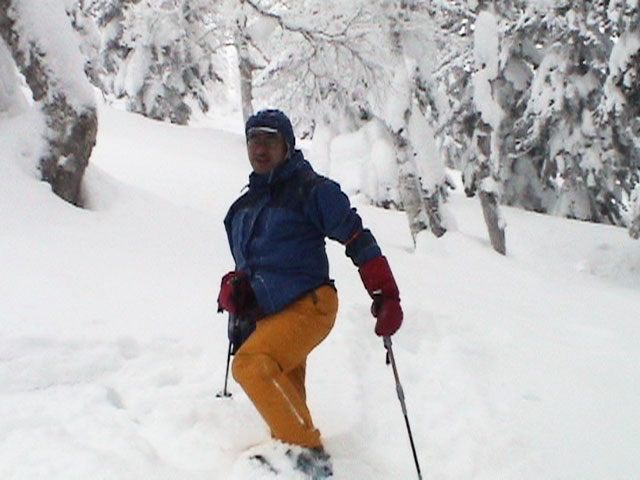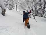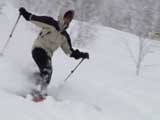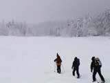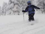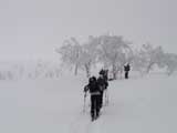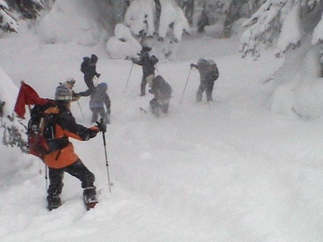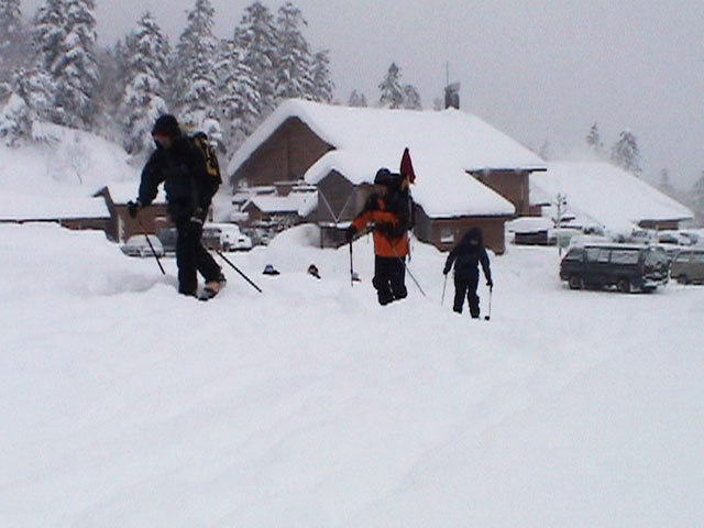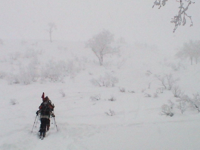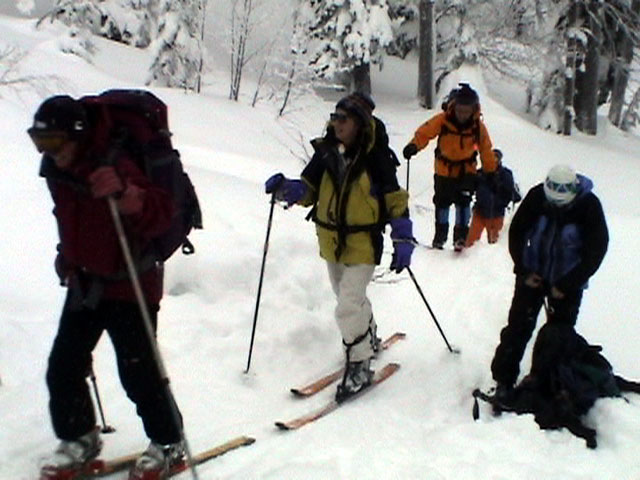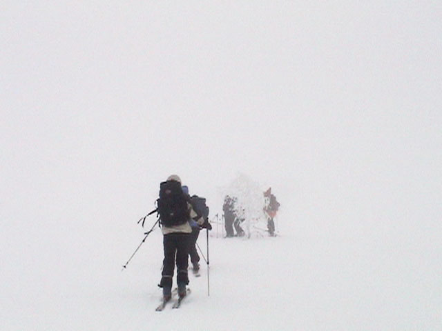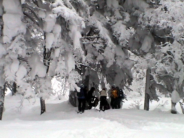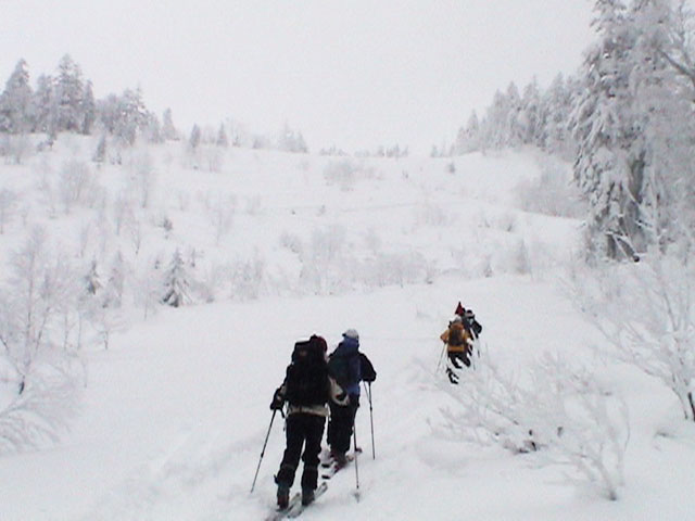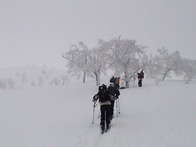 | 2002年12月29日(日) 三段山スキーツアー(三段山レディース発足) 骨折してからの復帰準備第一弾として、三段山の二段目上まで行って来ました。ただし、ギプスをしたまま、スノーシュウでの上り下りでしたが・・(^_^;) 今回は三段山レディースのサポートを受けて・・というか、おじゃま虫として旦那が無理矢理同行させてもらいました(ちなみに三段山レディースとは、長い間準備を進めていた旧称「三段山奥様クラブ」の事です。この度、女性でも奥様でなければダメなのか?という指摘を受けて、「三段山レディース」と改名して正式発足しました。キャプテンはスーママことやすこさんです。現在「三段山ジュニア」も発足準備中とか・・)。 さらに、特別ゲストとして北海道山岳挑戦会のひできさんも同行してくれました。名前の通り勇ましい滑りでした。 旦那は、Hiroさんから借りたMSRのスノーシュウで、あわよくば皆の後を追ってピークでも踏んでやろうかと思っていましたが、残念ながらホワイトアウトのために、二段目の上でギブアップ。 下山時にはスノーシュウのトップが沈んで意外と苦戦しました。転ぶと起きあがりにくいし、やっぱり片手だときついです。ピークへ行けなくて良かった(^_^;)。 あとは楽しく樹林帯でお茶などをして帰ってきました。HYMLの皆さん、おいしい紅茶ごちそうさまでした。 雪の量は十分でしたが、二段目から上はウインドパックされていて滑りずらそうです。 天候:雪 気温:-15〜-20度 風速:0〜5m 視界:樹林帯より上は視界不良 雪量:十分 雪質:ウインドパック〜パウダー コース:白銀荘〜三段山 メンバー:三段山レディース(やすこ、ゆきこ、おけい、ちか、みどりママ)、旦那、スー、北海道山岳挑戦会(ひでき) 合計8人(順不同) |