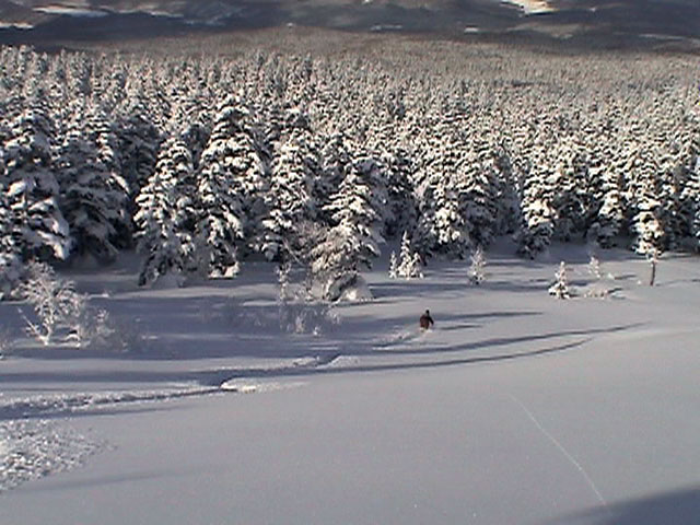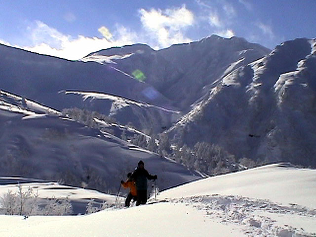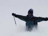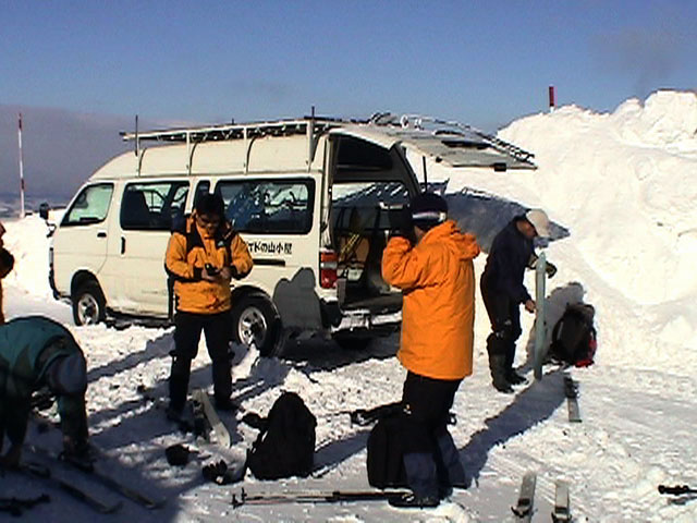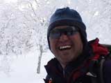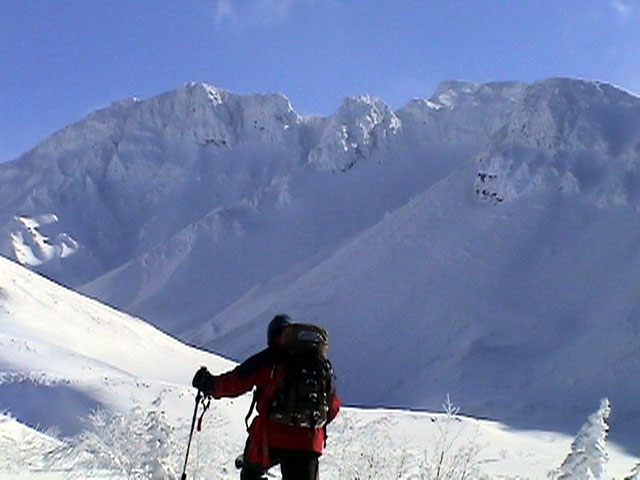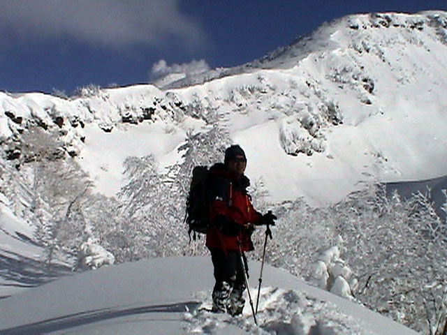 三段山噴火口近くのオープンバーンに到着。もちろんノートラック。