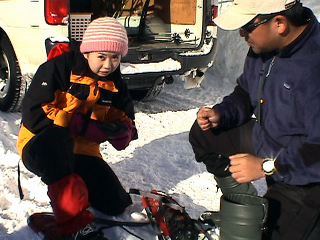 初めて履くスノーシューの装着を手伝ってもらっている様子