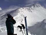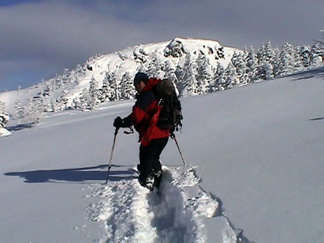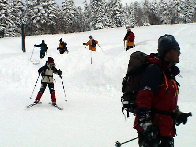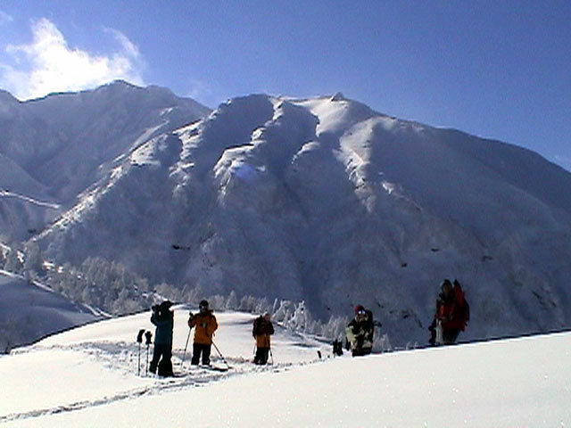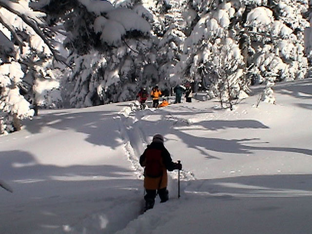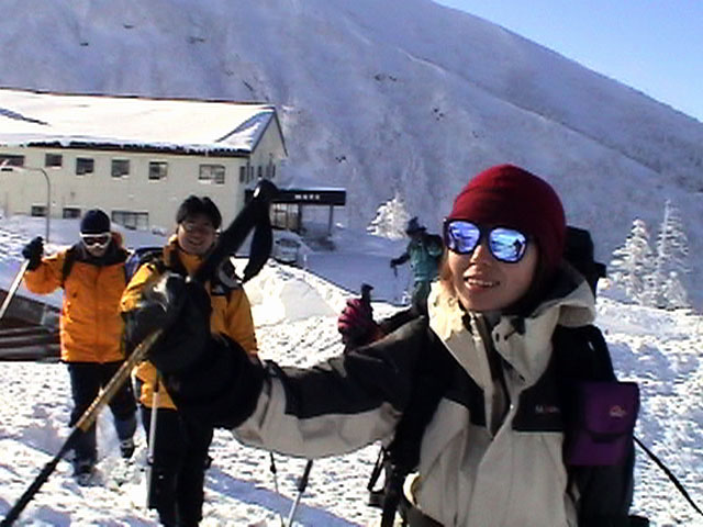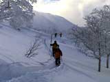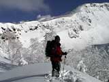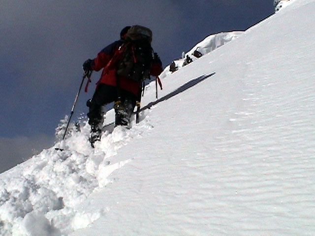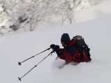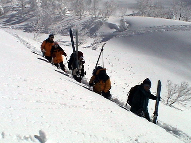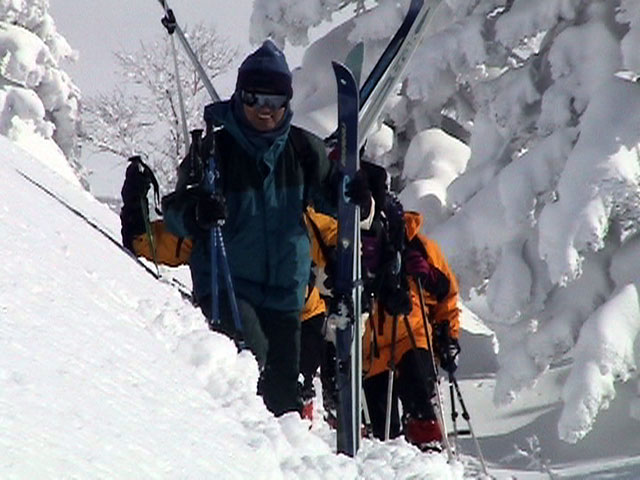 弱層試験をして、雪崩の危険性を確かめた後、急斜面をを登る山小屋さん。一番の難所だ