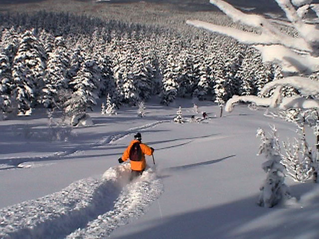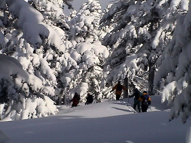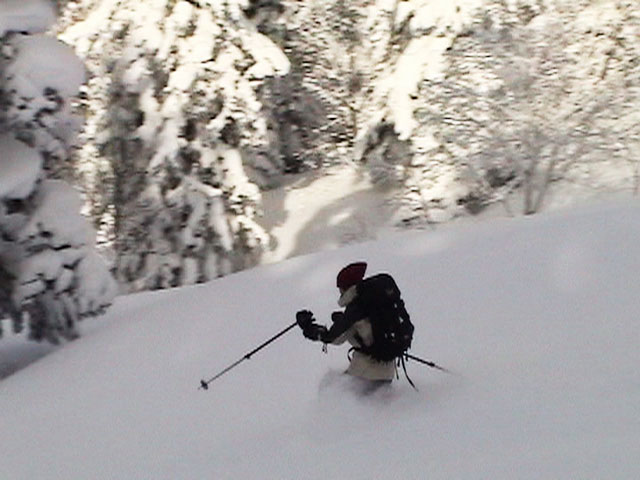 ツアー後半、樹林帯にぽっかりと出現した斜面を滑る