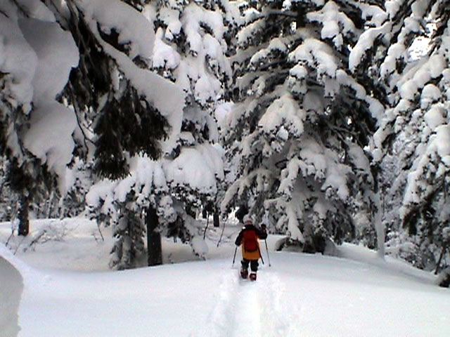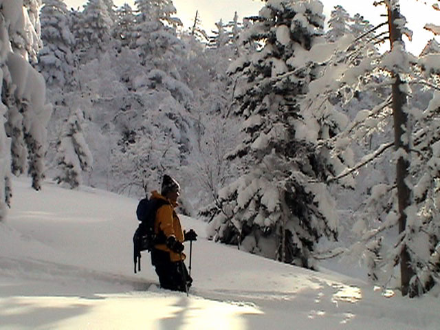たっぷり雪を抱いた樹林帯を行く。心が安まる。