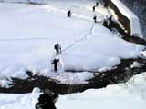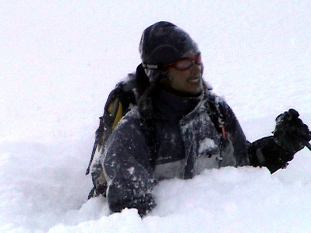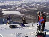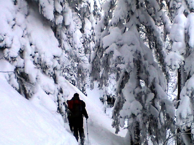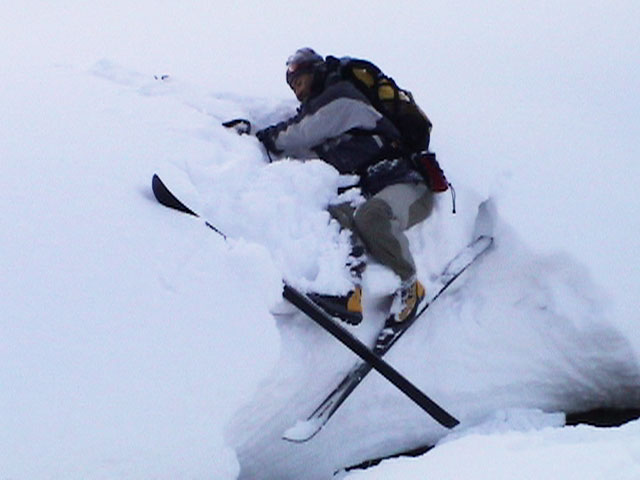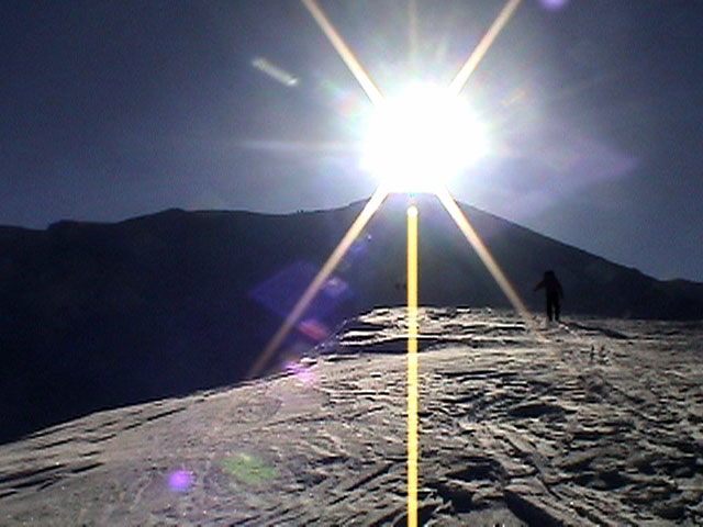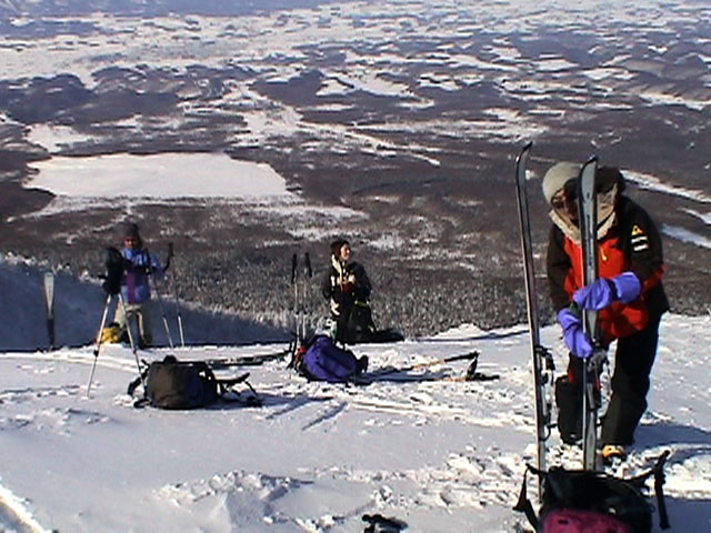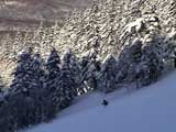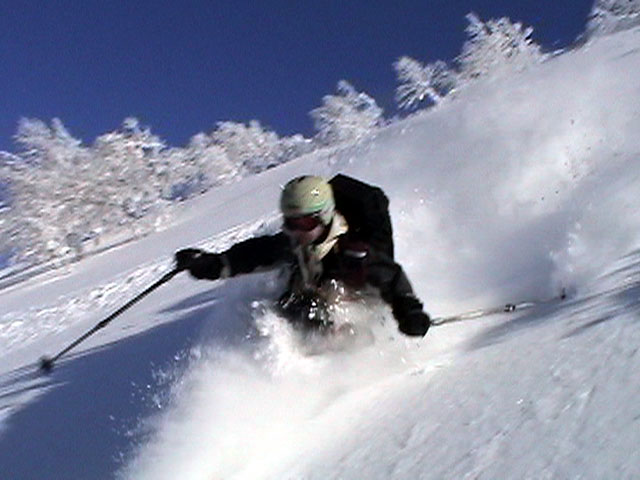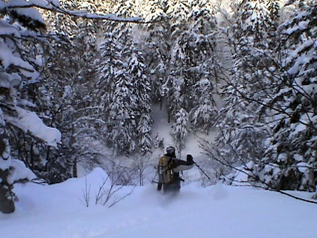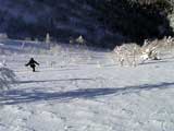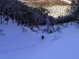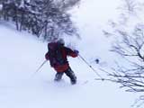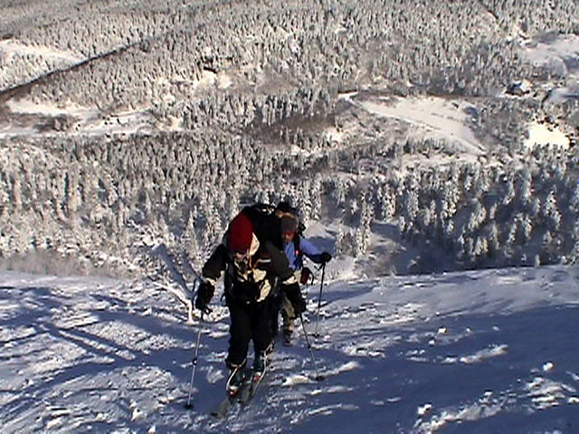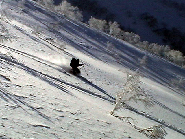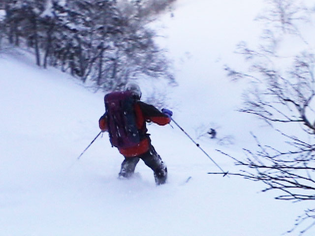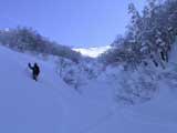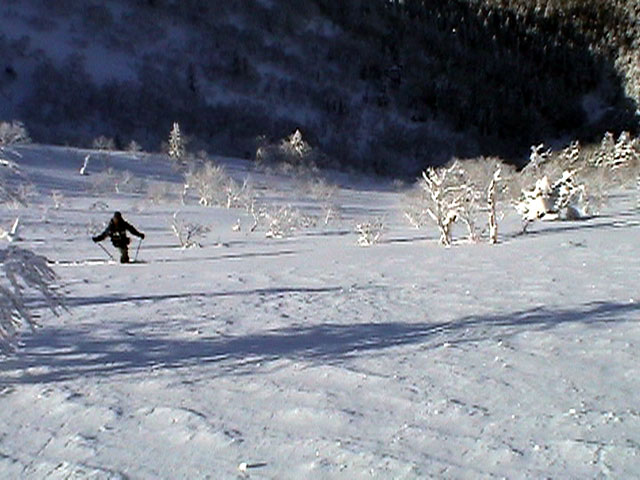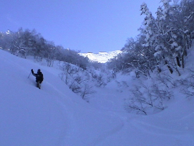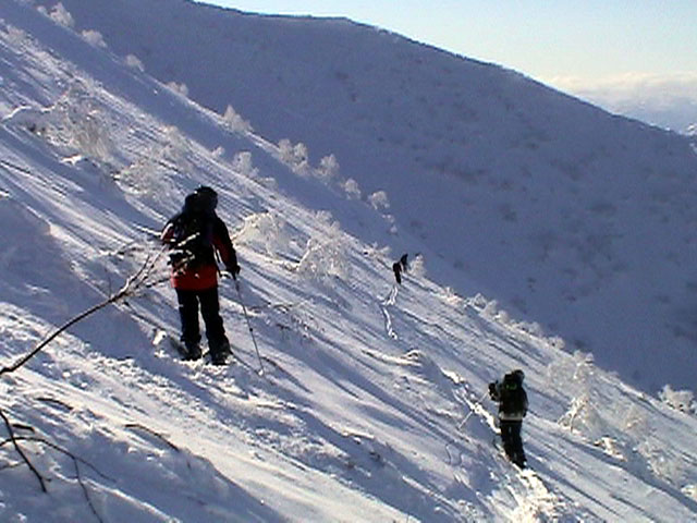 | 2003年1月26日(日) 富良野岳スキーツアー(ジャイアント尾根西側斜面滑降ルート開拓) なんと今シーズン一度も富良野岳を滑っていない旦那。方々から寄せられる富良野岳の粉雪便りに我慢できず行ってきた。 最近、富良野岳は大変混雑している(ほんの2〜3年前には考えられない事だが)。週末の駐車場は常に満車。いつもベベルイ沢にたくさんのシュプールが見えるようになった。 そこで今回は新しく滑降ルートを開拓することにした。前日に仲間とカシミールでみっちりルートの検討を行いGPSへデータをアップロード。さて、滑降ルート開拓は成功するのか・・・? 今日は全道的に快晴!当然富良野岳も晴れるだろう。しかも気温は低めに推移するので雪質も期待できる。混雑を避けるために、いつもより早い8時30分にバーデン前に集合した。 駐車場でGo Ridingのウエブマスターや、さなさん、yossyさんらと出会えた。登るルートは一緒だ。よろしく! 森林限界まで登ってみると、いつもと違って東から風が吹いているために、ベベルイ沢の上部がクラストしていた。尾根上も1500m付近から上はアイゼンが無いと安全に登れない状態。仕方がないので予定していた滑降ルートを変更し、風下になっているジャイアント尾根の西側に滑降ルートを探しながら西側斜面をトラバースしてみた。 そしたら・・・見つけた!素晴らしい斜面を。斜度といい、雪質といい文句なしのオープンバーン。そのまま一気に谷底まで滑り降り、標高1111mからジャイアント尾根を東へトラバースして帰ってきた。 天候:快晴 気温:-10〜-12度 風速:0〜2m 雪量:十分 雪質:下部はパウダー、上部はウインドパック〜クラスト メンバー:旦那、ゆきこ、toshi、めぐろ、ニッシー 合計5名(全員テレマークスキー) コースタイム:バーデン上富良野前8:50-ベベルイの滝9:40-森林限界(1370m)10:56-11:22滑降開始地点(1500m)11:58-トラバース開始地点(1111m)13:06-ベベルイの滝14:14-バーデン上富良野前14:40 |