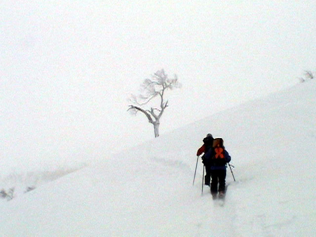 ![]() 二段目上 風が強く視界も悪いので登頂断念。偵察と弱層試験の結果、東壁滑降決定 |