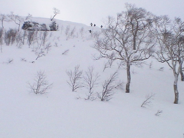 ![]() ここからは有志のみ三度登り返し。今度は二段目の北東斜面を・・たこ踊り滑り? ぱっちまん |