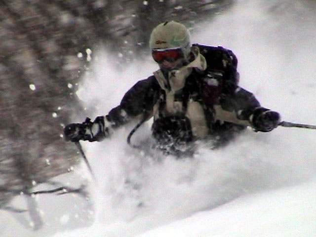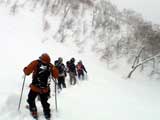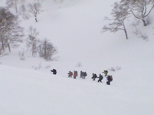 | 2003年2月1日(土) 三段山スキーツアー(東壁を落ちろ!) めずらしく今日の三段山一番乗りは我々。偶然出合ったY田さん達と共に行動した。 膝まであるラッセルを全員で交代しながら、なんとか二段目上まで登ったが、ここから強風とホワイトアウトのため、潔く登頂断念。 雪が深すぎてノーマルルートの傾斜では滑りを楽しめないため、ここから、ナマコ尾根側の東壁滑降してみることにした。厳冬期に東壁を滑るのは初めて。 幸い東風が吹いていたので、雪庇があまり発達していなくて崩壊の恐れはなさそうだった。ぱっちまんさんが実施したシャベルポンポンテストの結果も、40センチ下に弱層があるものの、なんとか大丈夫そう。 まばらに灌木が生えている35度くらいの斜面へ落ちてみたところ、素晴らしいオーバーヘッドパウダーを楽しむことができた。 そのまま二段目下までトラバースして登り返し、今度はさらに高度を上げて雪庇からジャンプしての滑降。皆さん上手い! 三度目の登り返し・・(^_^;)今度は帰路を考えずに谷底まで大滑降。 ここでは旦那も撮影を放棄し、ファーストトラックを譲ってもらって、一気に滑り降りた。 気管に入ったパウダーにむせながら斜面を見上げると、見上げると首が痛くなるような谷の上から自分の足下まで、一条の綺麗なラインが刻まれていた。もう・・何も言うことはない。 天候:雪時々曇り 気温:-10〜-12度 風速:2〜5m 雪量:十分 雪質:深いパウダー メンバー:旦那、ゆきこ、ぱっちまん、ナガ 合計4名(全員テレマークスキー)+Y田さん達(6名) コースタイム:白銀荘9:42(1414m)-11:10二段目上(1350m)11:35-(三回登り返し)-白銀荘(1414m)14:50 |