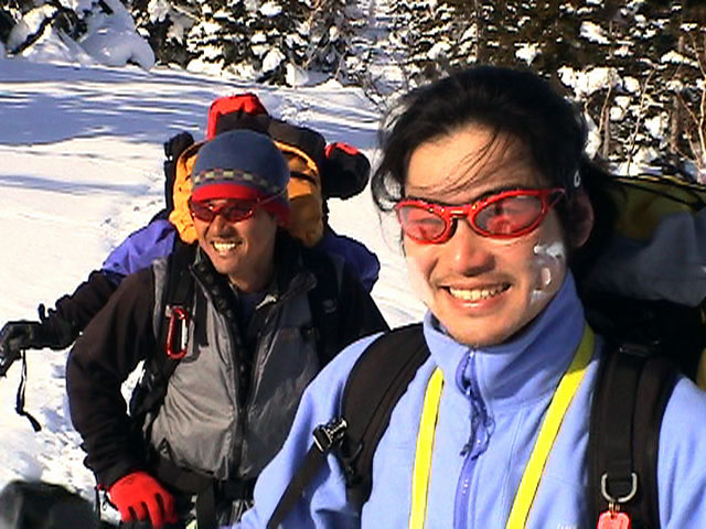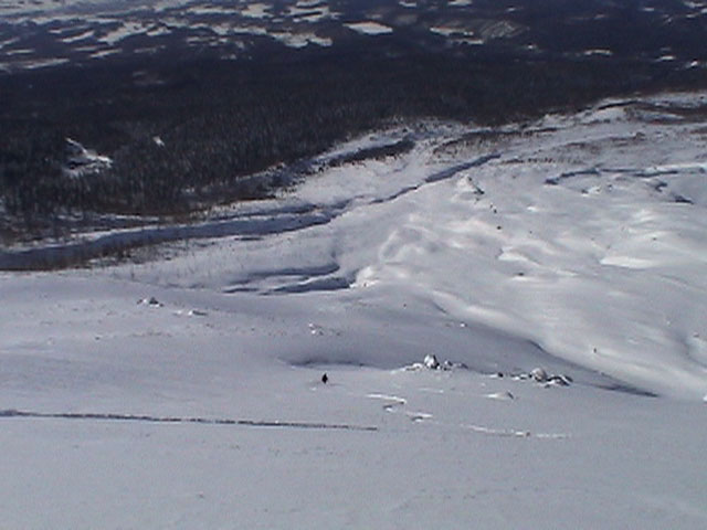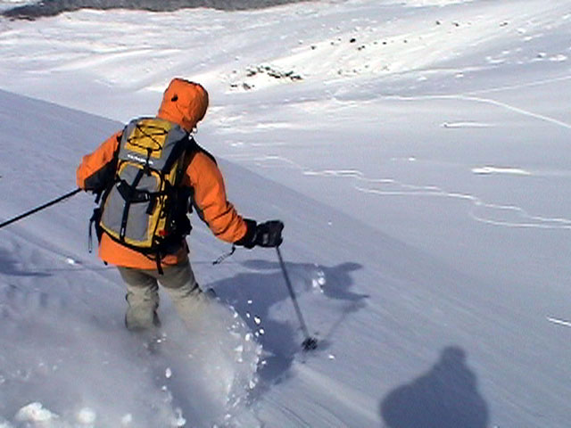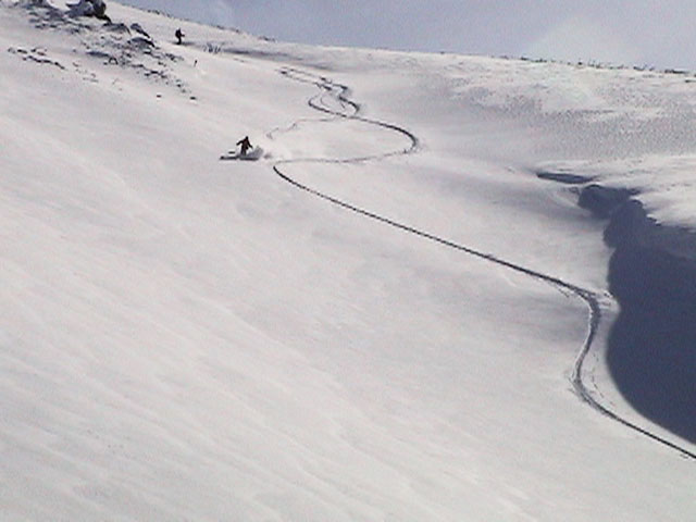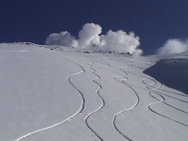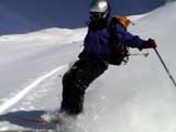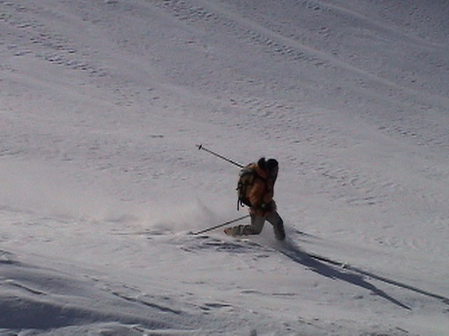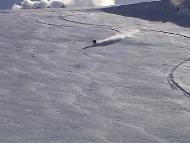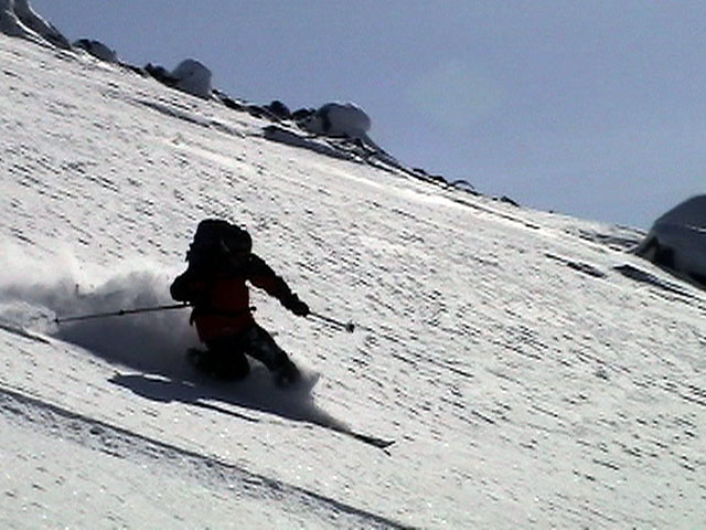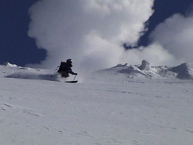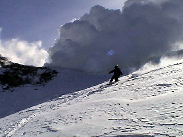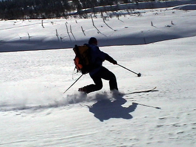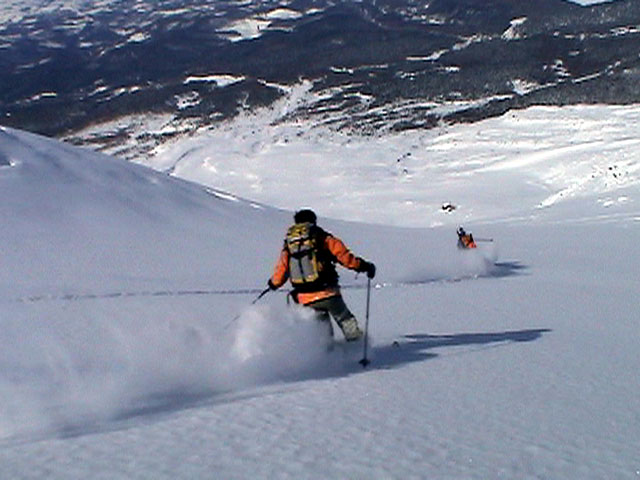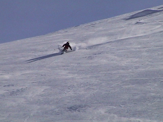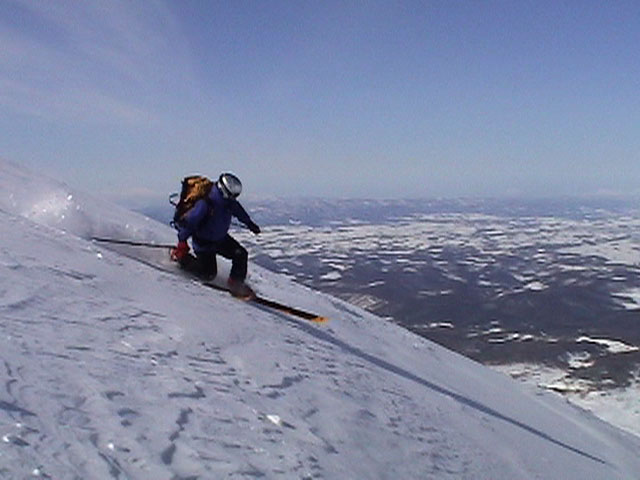 | 2003年2月23日(日) 前十勝スキーツアー(噴煙は招くよ・・) 完璧な快晴。ただし、夕べから今朝にかけて風が強かったらしく、だいぶパウダーは飛んでしまったようだ。 まず、十勝避難小屋経由で前十勝のピークを目指した。 前日のトレースのおかげで順調に高度を稼げたが、東風に吹かれた噴煙が前十勝のピークを撫でていたので登頂は断念。火山警報が出ていたので警戒していたが、噴煙の様子は以前とは特に変わったとは思わなかった。でも相変わらず不気味だ。 気温は低いので全般的に雪は良かったが、前十勝ピーク付近はウインドパックされていた。これは予想の範囲内。前十勝付近で気温は-20度。飲料水もビールも凍る。いや、そんなことよりもつま先が冷えてちぎれそうに痛む。長居は無用だ。 慎重に滑降を開始したが、すぐに雪質が良くなって、いつの間にか全開でぶっ飛ばしていた。ボウル状斜面を半分ほど落ちてからトラバースし、250mほどの長さの綺麗な谷を滑降。あまりにも気持ちが良かったので、登り返して今度は500mを滑降。何度か岩を踏んだけど、やっぱり前十勝は良かった。快晴と前十勝はよく似合う。 天候:快晴 風速:0〜2m 気温:-12〜-20度 雪量:十分(ただし、岩地雷多数!) 雪質:20センチのパウダー(上部は一部ウインドパック) メンバー:旦那、toshi、ぱっちまん、ニッシー 合計4名 コースタイム:白銀荘9:00-火山観測所9:10-十勝岳避難小屋付近(1345m)10:20-11:27前十勝ピーク手前(1702m)11:49-白銀荘14:32 |