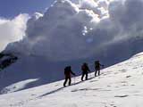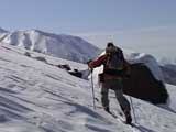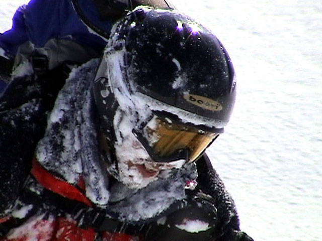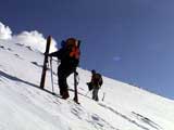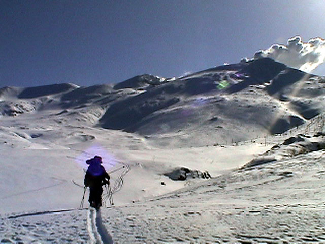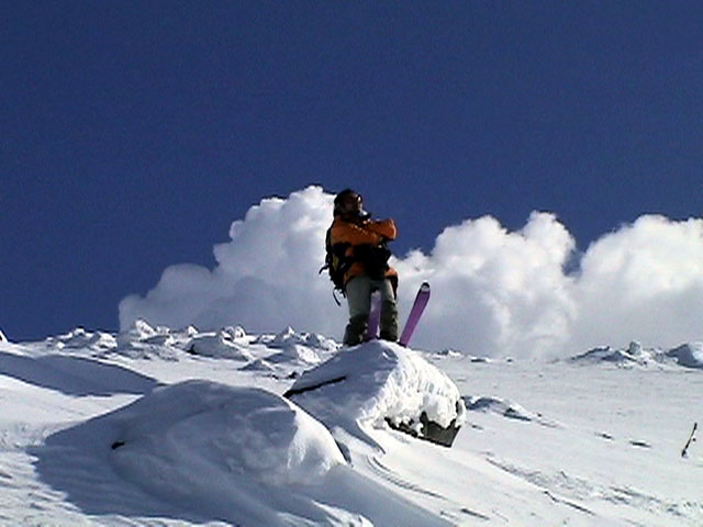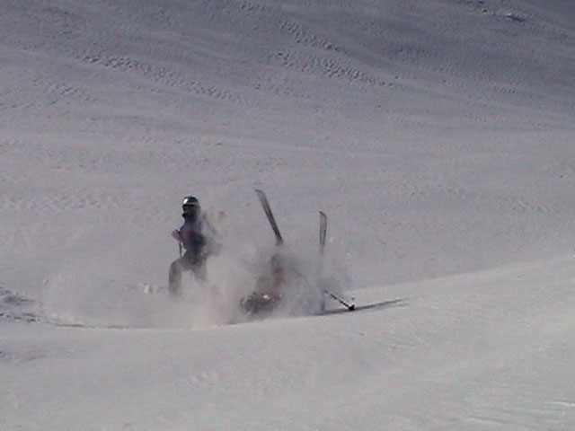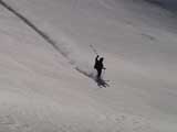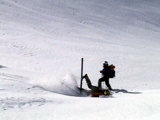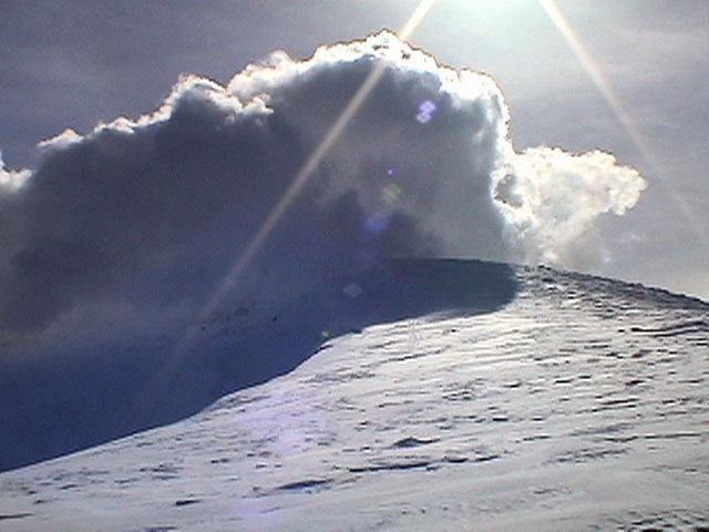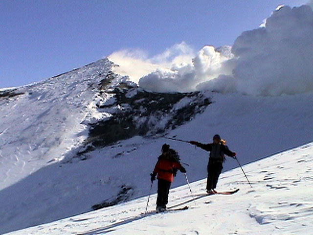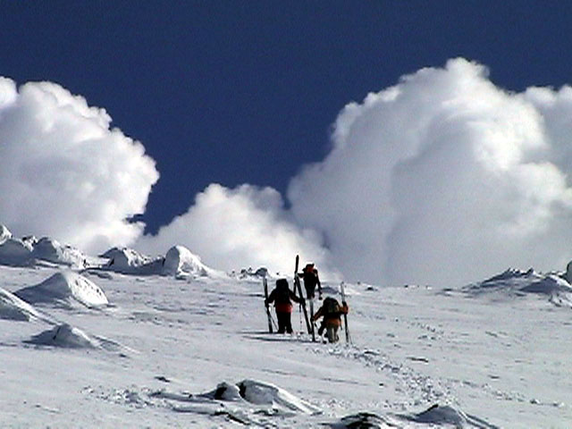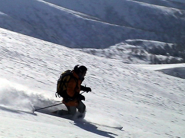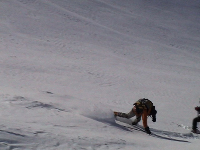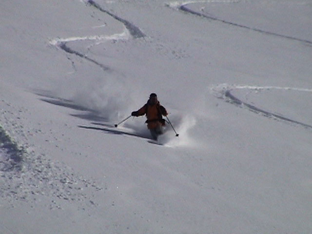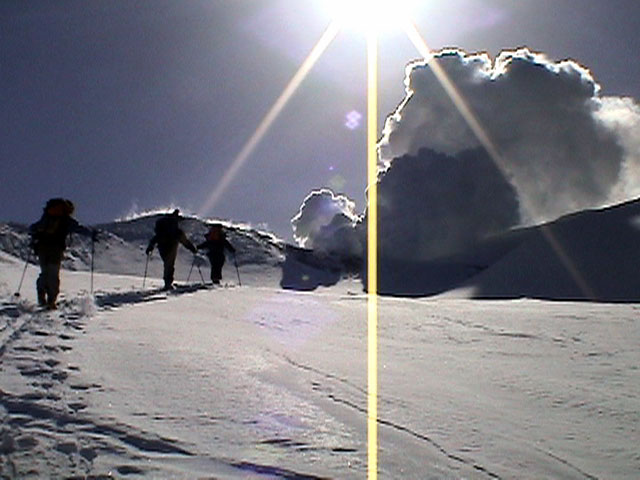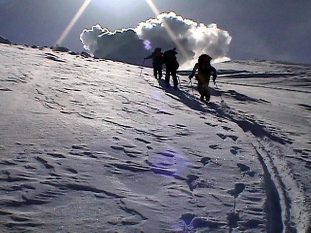 | 2003年2月23日(日) 前十勝スキーツアー(噴煙は招くよ・・) 完璧な快晴。ただし、夕べから今朝にかけて風が強かったらしく、だいぶパウダーは飛んでしまったようだ。 まず、十勝避難小屋経由で前十勝のピークを目指した。 前日のトレースのおかげで順調に高度を稼げたが、東風に吹かれた噴煙が前十勝のピークを撫でていたので登頂は断念。火山警報が出ていたので警戒していたが、噴煙の様子は以前とは特に変わったとは思わなかった。でも相変わらず不気味だ。 気温は低いので全般的に雪は良かったが、前十勝ピーク付近はウインドパックされていた。これは予想の範囲内。前十勝付近で気温は-20度。飲料水もビールも凍る。いや、そんなことよりもつま先が冷えてちぎれそうに痛む。長居は無用だ。 慎重に滑降を開始したが、すぐに雪質が良くなって、いつの間にか全開でぶっ飛ばしていた。ボウル状斜面を半分ほど落ちてからトラバースし、250mほどの長さの綺麗な谷を滑降。あまりにも気持ちが良かったので、登り返して今度は500mを滑降。何度か岩を踏んだけど、やっぱり前十勝は良かった。快晴と前十勝はよく似合う。 天候:快晴 風速:0〜2m 気温:-12〜-20度 雪量:十分(ただし、岩地雷多数!) 雪質:20センチのパウダー(上部は一部ウインドパック) メンバー:旦那、toshi、ぱっちまん、ニッシー 合計4名 コースタイム:白銀荘9:00-火山観測所9:10-十勝岳避難小屋付近(1345m)10:20-11:27前十勝ピーク手前(1702m)11:49-白銀荘14:32 |