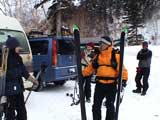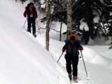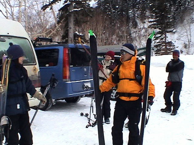 | 2003年3月2日(日) 富良野岳スキーツアー(モナカ谷) 今日は吹雪の中のヒリヒリツアーを楽しみにしていたら、意外と良い天気。 雪は降っていないし、視界もあるし、風もそれほどでもないし・・まったく拍子抜けだった。 しかし、さすがに前十勝や三段山は見るからにクラストしていそう。少しでも良い雪を求めて富良野岳入ることにした。ジャイアント尾根の西側斜面を二十林班沢川へ向かって降りてみたら・・上部はやっぱりカリカリ。谷へ降りてもウインドパックされた重たい雪(モナカ)でメタメタ。かなりトラバースして見つけた良い斜度のオープンバーンも、こうなると単に恨めしいだけの存在。滑落の危険性があるほどクラストしていなかったのは良かったけど。 それでもジャイアント尾根側の1350m付近から下は良いコンディションのパウダーだった。今日はさすがに入山者は少なかったんだけど、途中まで一緒に登っていたエゾ山岳会の人達や、ガリガリの西尾根を豪快に降りてきた「なまら癖-X」の人達も楽しそうに登り返して滑っていた。 旦那は、不覚にもぱっちまんから頂いた泡盛で良い気持ちになってしまい、(^_^;)珍しく登り返しもせずに、なんだかいい加減なコース取りで降りてきてしまった。本人は楽しかったんだけど、反省。 天気:くもり 風速:0〜8m 気温:-5〜-10度 雪量:十分 雪質:ウインドパックモナカ〜樹林帯はパウダー メンバー:旦那、ゆきこ、ぱっちまん、スー、キャプテン、まろ 合計6名 コースタイム:凌雲閣駐車場9:03-ジャイアント尾根森林限界(1360m)10:56-11:30滑降開始地点(1489m)11:45-バーデン上富良野前13:53 |