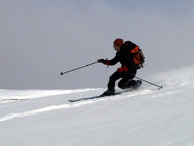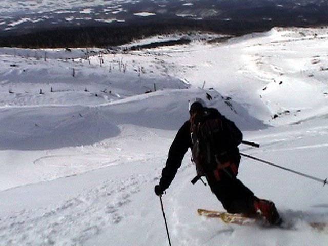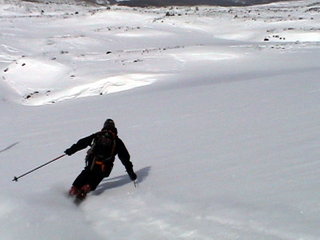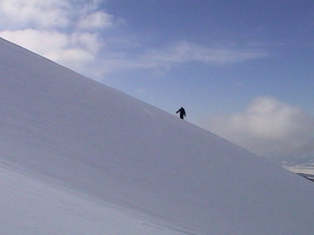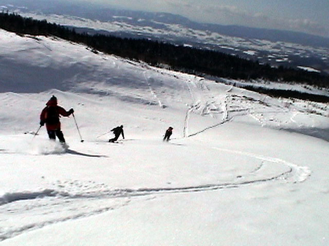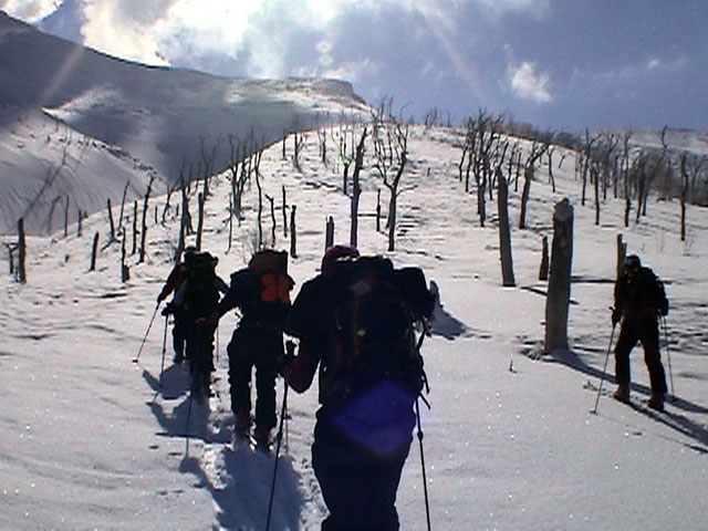 | 2003年3月9日(日) 前十勝スキーツアー(気分はもう春山?) こんなに快晴になるとは予想していなかった。日差しはもう完全に春山。 相当の悪雪を覚悟していたのだが、斜面を選ぶことによってハードバーンの上に5センチの新雪という状態を快適に滑ることができた。堅雪のおかげで岩地雷の心配も無し。 途中でボーダーとセッションして、正面スロープとその横の谷を登り返して楽しんだ。 滑落するほど堅い雪だったので、MSRスノーシューか、アイゼンが欲しかったツアーだった。 天気:快晴 風速:0〜1m 気温:-5〜-10度 雪量:十分 雪質:ハードバーンの上に5センチの新雪 メンバー:旦那、ゆきこ、ぱっちまん、田中パパ、ゆうちゃん、まろ、しのぶちゃん 合計7名 コースタイム:白銀荘8:50-火山観測所9:00-前十勝正面スロープ(1500m)10:33-11:40谷のボトム昼飯地点(1157m)12:42-隣の谷へ登り返し(1395m)13:36-白銀荘14:37 |