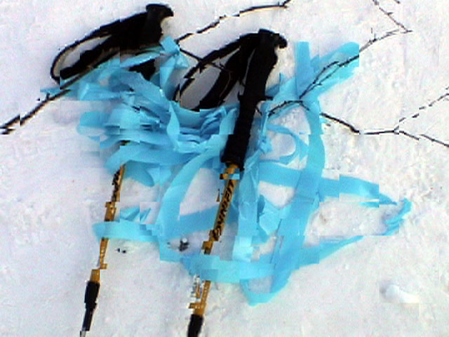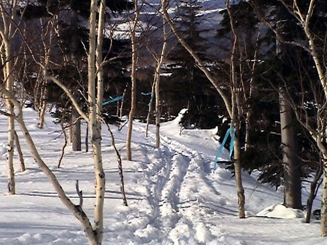 残念なことに、白銀荘横の樹林帯に、3〜5メートル感覚でびっしり吊された青テープ群を発見。どうやら昨年のものと同じらしい。