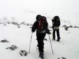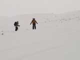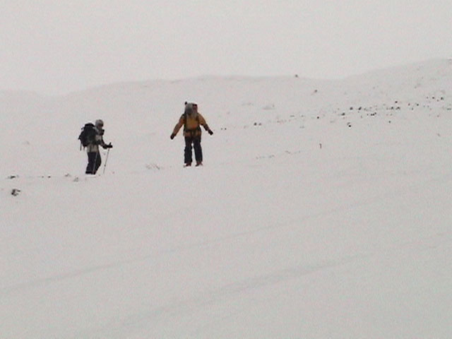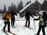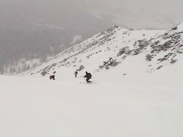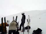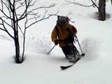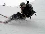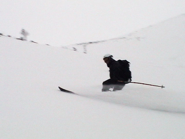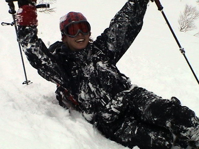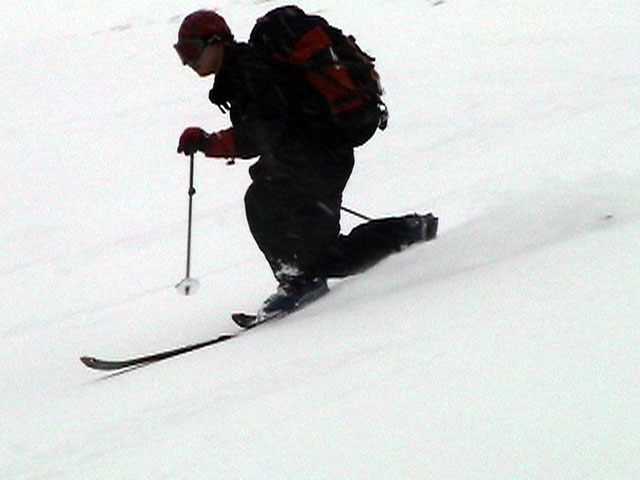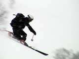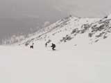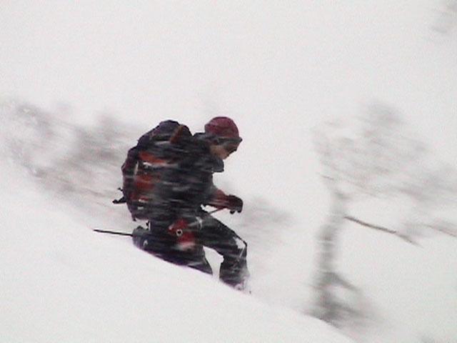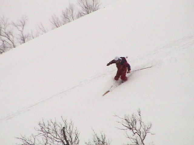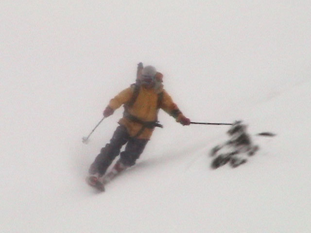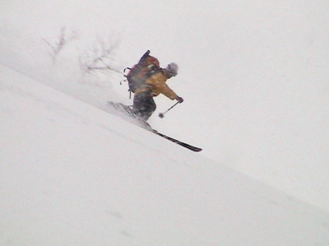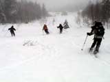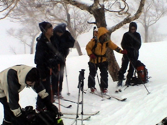 | 2003年4月19日(土) 三段山スキーツアー(土砂降り転じてパウダースキー) 朝、雨の音で目が覚める。すぐにかっちゃんから電話「今日行くんですか?」「もちろん!」とは言ったものの、かなり不安。旦那の予定では白銀荘付近は雪になっている筈なのだが。 ・・・強い雨の降る白銀荘に到着。駐車場はガラガラ。 ぱっちまんが、ムンクの「叫び」の真似をしながら登場する。 かなり萎えて白銀荘のロビーで管を巻く僕ら。「帰ろうか・・」「いや、雨は雪になるはずだ」「・・ビール飲むか」 一時間程たつと、本当に雨が雪に変わってきた。チャンス! 雨さえ降らなければ何とかなるのだ。というか雨以外ならどんな天候でも行く。急いで準備開始。 そこへ、かなりやられた感じのボーダーが二人降りてきた。様子を聞くと「土砂降りの雨」「ガスで視界が悪い」とのこと。 あまりの悪条件に僕らは逆に盛り上がって、「イヤゥホウー!」とか雄叫びを上げる。アホだ。 登ってみると案の定、湿った雪が降り視界も悪い。後方から、名古屋からやってきた森さんというテレマーカーも追いついてきて、以降は一緒に動いた。 無理矢理トークで盛り上げながら登り続ける僕ら。「きっと雪が止んで、視界も良くなるよ!」 すると、本当に雪が止み、視界が良くなってきた。ピークも見える はなからピークにはこだわっていなかったので、廊下の途中から西の谷へ移動して滑降することにした。 まず旦那が偵察と称して10メートルほど滑ってみたら・・信じられないほど良い雪「ビンゴ!」「なまら良い感じのパウダーだ!」「うそ!」 皆ウヒャウヒャ言いながら滑り始める。本当にこの季節にしては奇跡的に良い雪質。滑りやすいザラメの上に、これまた良い感じの新雪が5センチほど乗っている。 こうなると最初に萎えた反動か、もう盛り上がりが止まらない。森林限界まで滑った後で再び上り返し。 板がよく走るので、三段山程度の傾斜でもとても面白く滑れる。樹林帯を快適に滑って今回のツアーは終了。 途中でadachiさん一家と出会い、しばし談笑できたのもうれしい。 ダメ元でも来てみたら良いことがあるものだ。十分満足して(びしょ濡れで)帰路についた我々だった。 天候:雨〜雪〜くもり 気温:0〜2度 風速:0〜1m 雪質:ザラメの上に5センチのパウダー 雪量:十分 メンバー:旦那、ゆきこ、ぱっちまん、しのぶちゃん、かっちゃん 合計5名 コースタイム:白銀荘9:45-11:53西の谷(1620m)12:09-白銀荘13:26 |