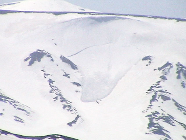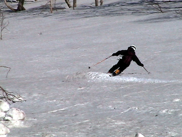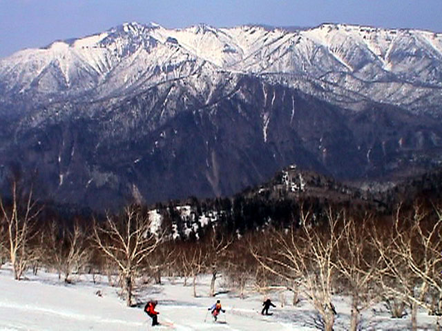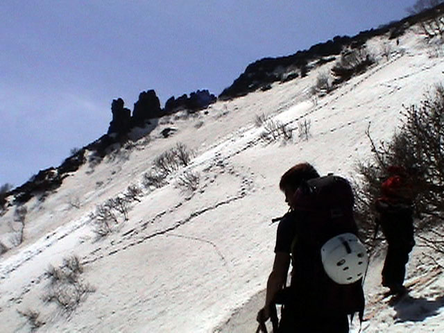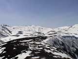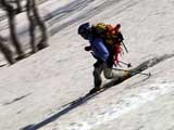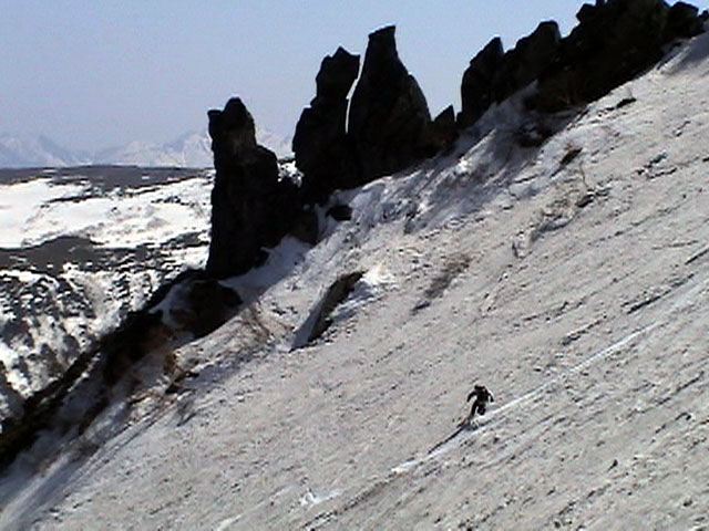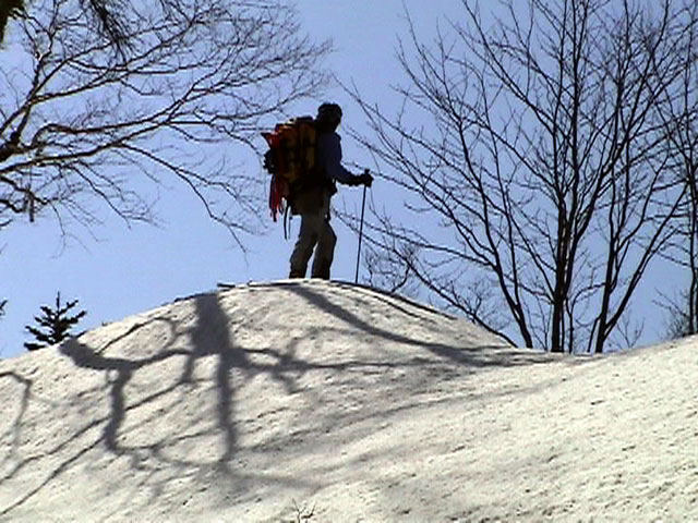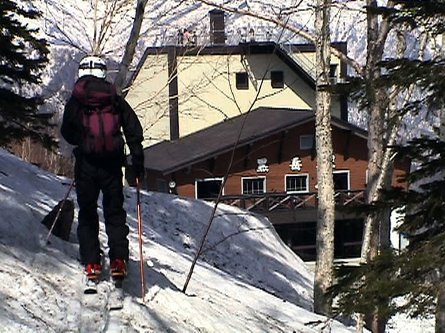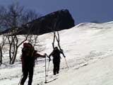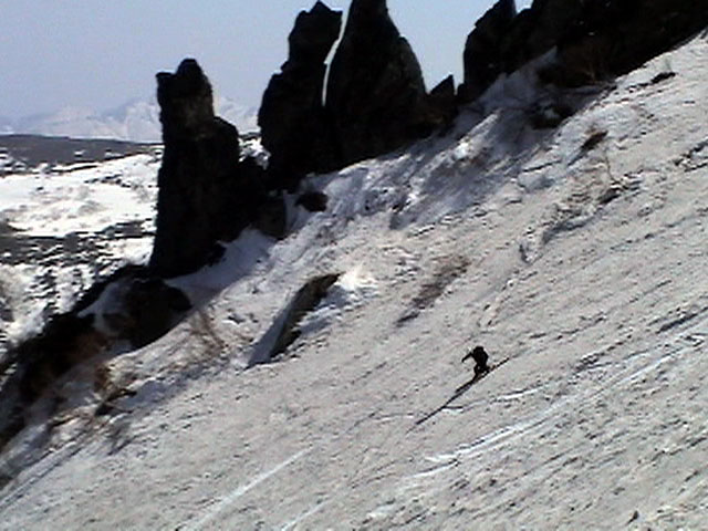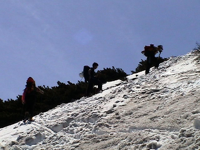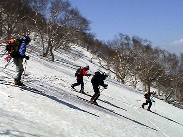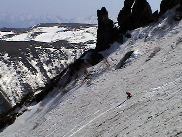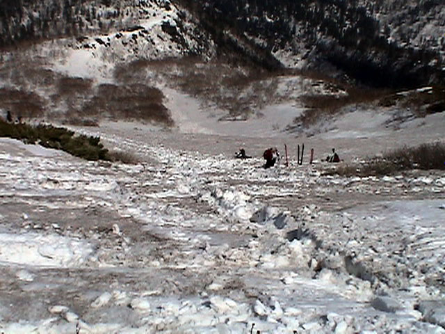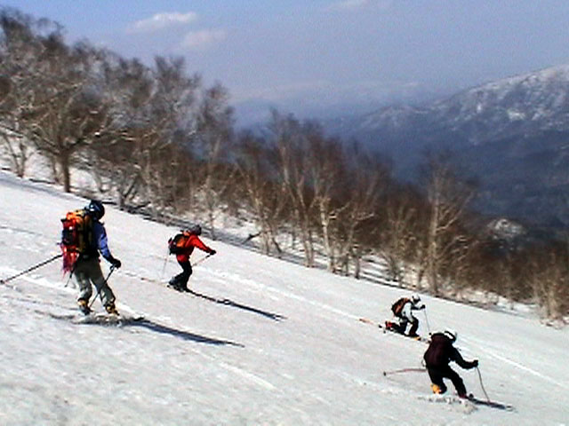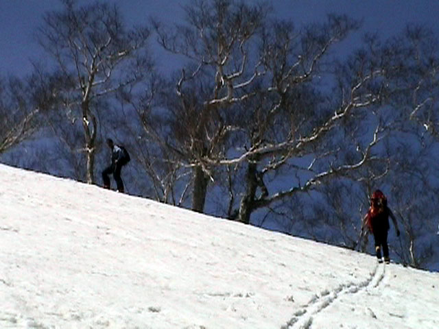 | 2003年5月3日(金)憲法記念気日 黒岳スキーツアー(灼熱の黒岳、ビールが旨かった) 初めての黒岳。天気も快晴で、期待に胸が躍る。気温は5月とは思えない暑さで、今年初めて車の中でクーラーをつけたくなった程だ。ひとまず愛山渓に荷物をデポしたあと、黒岳へ向かった。この陽気に誘われて、ロープウェイは混雑していた。ロープウェイを降りても相変わらず気温が高い。悪雪は必至だ。10:40、リフトを降りて、遙か先に先行している田中パパを必死に追いかけるが、全然追い付けない。大汗をかきながらの急斜面直登だ。Tシャツ一枚でも暑い。傾斜は次第に急になっていき、「とんでもないところに連れてこられた」と、ちょっと不安になってきた。ツボ足の登山者が荒らした斜面は落とし穴だらけだし雪もグザグザで、下りはスキーが刺さりそうだ。頂上直下で、 旦那:「ここらにスキーをデポしましょうか?」(ヘロヘロ) 田中パパ:「あ”!?」(ドスのきいた声) という殺伐としたやり取りのあと(むろんスキーのデポは許可されない)、12:10に黒岳登頂!明日の旭岳もこんなペースで登られたら…、う〜ん、とんでもないツアーに参加してしまったものだ。北鎮岳の方に良い感じのメロウな斜面が見えるが、皆の関心は雪崩跡のある急斜面に集中する。絶対について行かない方がいいね。 下り始めは、落とし穴にはまりながら滑降地点までジグザグに降り、手付かずの急斜面の上に立つ。旦那は撮影地点へ。田中パパ、ドロップイン!思ったよりも滑りやすそうだ。続いてゆうちゃん。ちょっとバランスを崩しながらも良い滑りを見せる。僕は、転びながら何とか滑降(滑落?)。ラストのかっちゃんの滑りはダイナミックだったが、転倒もダイナミック!みんなでデブリの下端まで滑ったあと、リフト方向へトラバース。あっという間に登り口に到着した。ゲレンデを滑ってロープウェイ山頂駅まで行き、食堂でランチ。 さて、ここからが三段山クラブの本領発揮!旦那様と田中パパは競ってビールを空ける(ビール中瓶二本+350ml缶ビール二缶)。滑りながら「アルコールが切れたから補給しなきゃ」と連発していた旦那はアルコール依存症なのか!?テラスでのんびりビールを興じる姿はスイスアルプスの夏スキーを楽しむ優雅なスキーヤーを連想させるが、しかし…。ま、このようなスキーもアリかな。 「来シーズンはパウダーの季節に来たいね」って話しながら帰って来ました。 (文責:ニッシー) 天候:快晴 気温:15〜18度 風速:0m 雪質:ザラメ 雪量:十分 メンバー:旦那、ニッシー、かっちゃん(俺流)、田中パパ、ゆうちゃん 合計5名 コースタイム:黒岳リフト終点10:40-12:10黒岳山頂(1984m)12:54-13:43黒岳ロープウエイ駅 |
