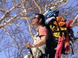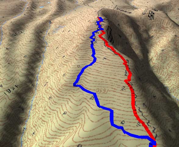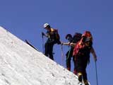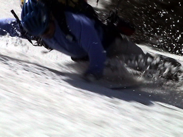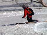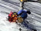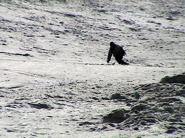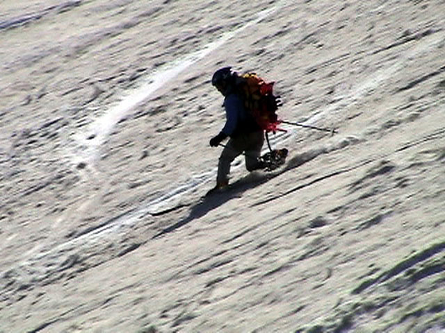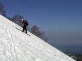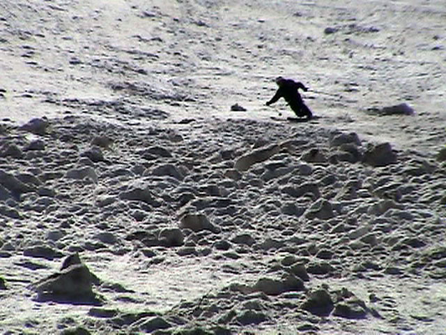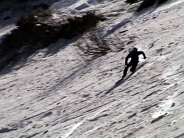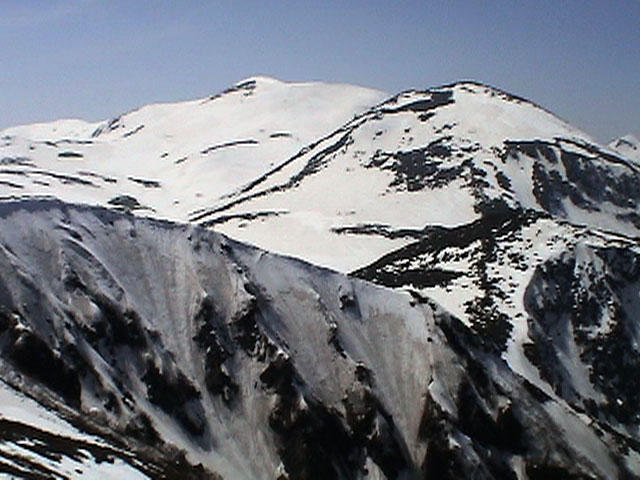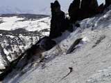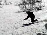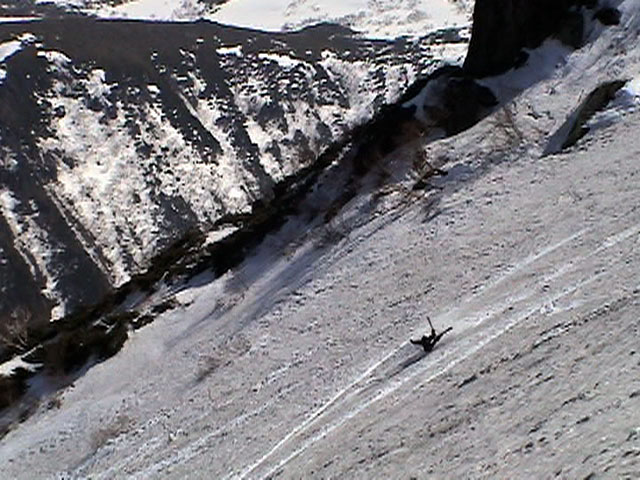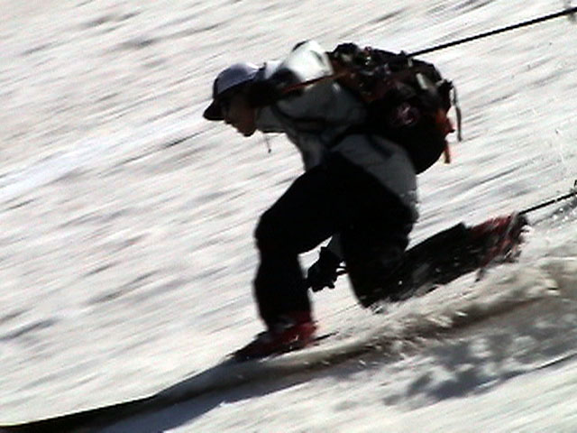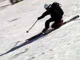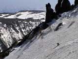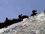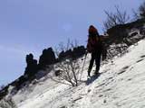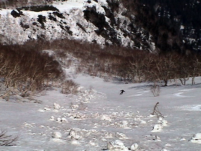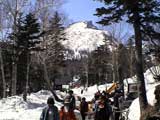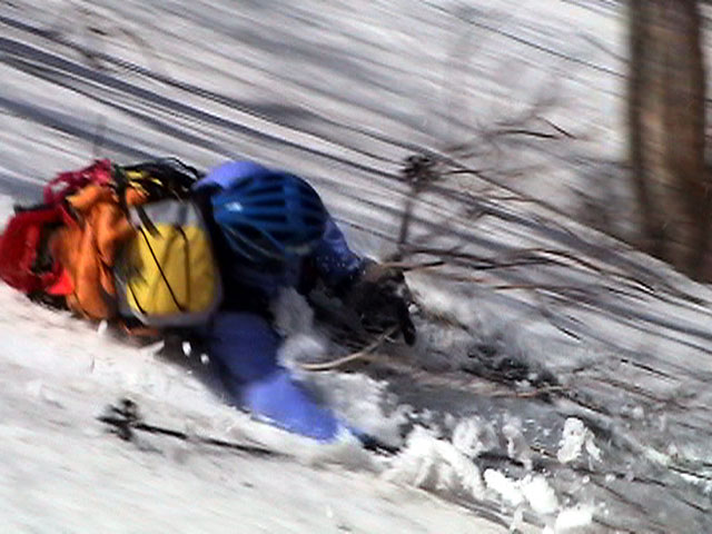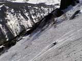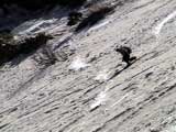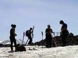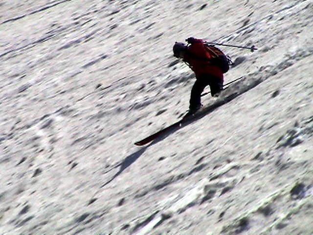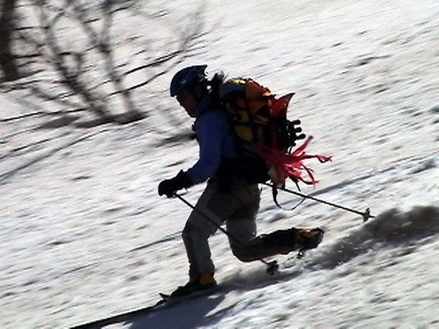 | 2003年5月3日(金)憲法記念気日 黒岳スキーツアー(灼熱の黒岳、ビールが旨かった) 初めての黒岳。天気も快晴で、期待に胸が躍る。気温は5月とは思えない暑さで、今年初めて車の中でクーラーをつけたくなった程だ。ひとまず愛山渓に荷物をデポしたあと、黒岳へ向かった。この陽気に誘われて、ロープウェイは混雑していた。ロープウェイを降りても相変わらず気温が高い。悪雪は必至だ。10:40、リフトを降りて、遙か先に先行している田中パパを必死に追いかけるが、全然追い付けない。大汗をかきながらの急斜面直登だ。Tシャツ一枚でも暑い。傾斜は次第に急になっていき、「とんでもないところに連れてこられた」と、ちょっと不安になってきた。ツボ足の登山者が荒らした斜面は落とし穴だらけだし雪もグザグザで、下りはスキーが刺さりそうだ。頂上直下で、 旦那:「ここらにスキーをデポしましょうか?」(ヘロヘロ) 田中パパ:「あ”!?」(ドスのきいた声) という殺伐としたやり取りのあと(むろんスキーのデポは許可されない)、12:10に黒岳登頂!明日の旭岳もこんなペースで登られたら…、う〜ん、とんでもないツアーに参加してしまったものだ。北鎮岳の方に良い感じのメロウな斜面が見えるが、皆の関心は雪崩跡のある急斜面に集中する。絶対について行かない方がいいね。 下り始めは、落とし穴にはまりながら滑降地点までジグザグに降り、手付かずの急斜面の上に立つ。旦那は撮影地点へ。田中パパ、ドロップイン!思ったよりも滑りやすそうだ。続いてゆうちゃん。ちょっとバランスを崩しながらも良い滑りを見せる。僕は、転びながら何とか滑降(滑落?)。ラストのかっちゃんの滑りはダイナミックだったが、転倒もダイナミック!みんなでデブリの下端まで滑ったあと、リフト方向へトラバース。あっという間に登り口に到着した。ゲレンデを滑ってロープウェイ山頂駅まで行き、食堂でランチ。 さて、ここからが三段山クラブの本領発揮!旦那様と田中パパは競ってビールを空ける(ビール中瓶二本+350ml缶ビール二缶)。滑りながら「アルコールが切れたから補給しなきゃ」と連発していた旦那はアルコール依存症なのか!?テラスでのんびりビールを興じる姿はスイスアルプスの夏スキーを楽しむ優雅なスキーヤーを連想させるが、しかし…。ま、このようなスキーもアリかな。 「来シーズンはパウダーの季節に来たいね」って話しながら帰って来ました。 (文責:ニッシー) 天候:快晴 気温:15〜18度 風速:0m 雪質:ザラメ 雪量:十分 メンバー:旦那、ニッシー、かっちゃん(俺流)、田中パパ、ゆうちゃん 合計5名 コースタイム:黒岳リフト終点10:40-12:10黒岳山頂(1984m)12:54-13:43黒岳ロープウエイ駅 |