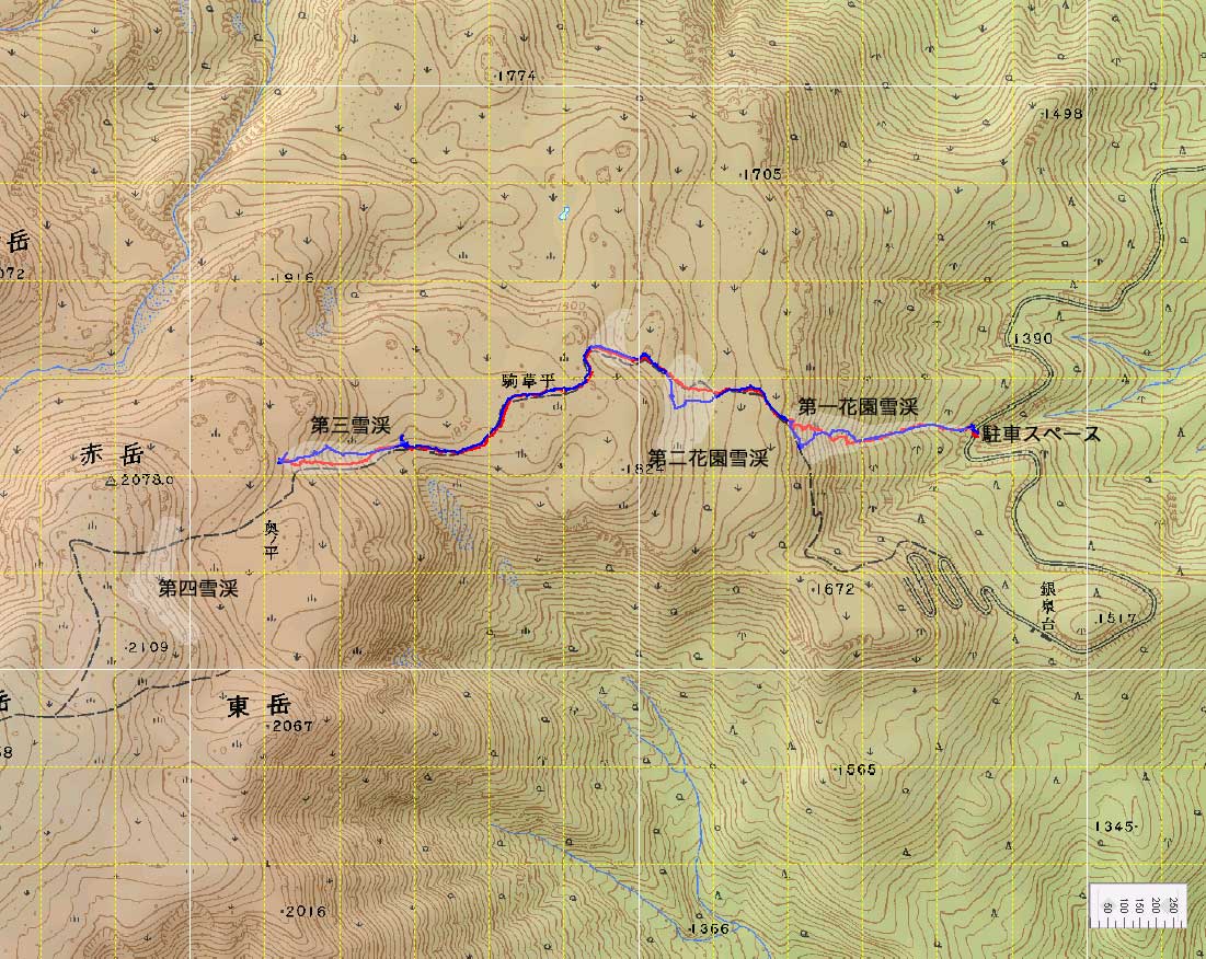 トラックログ図(赤が登り、青が下り)