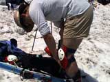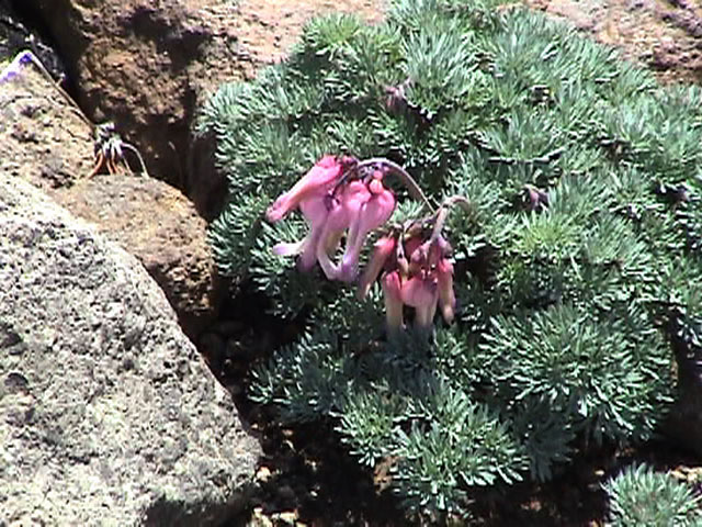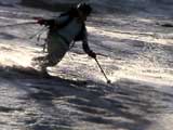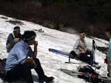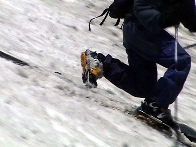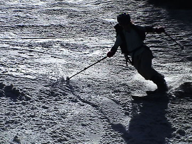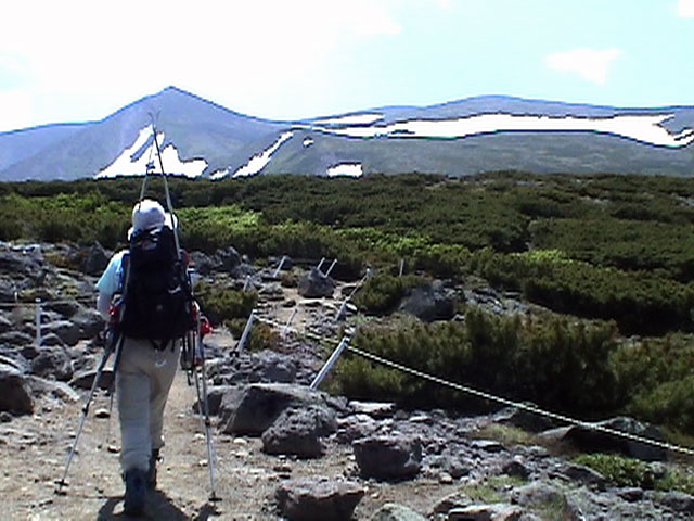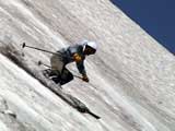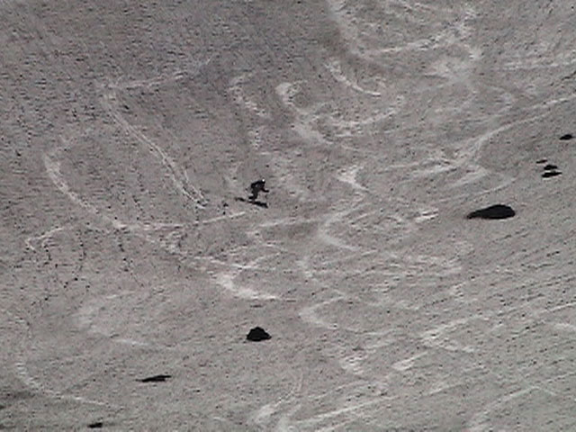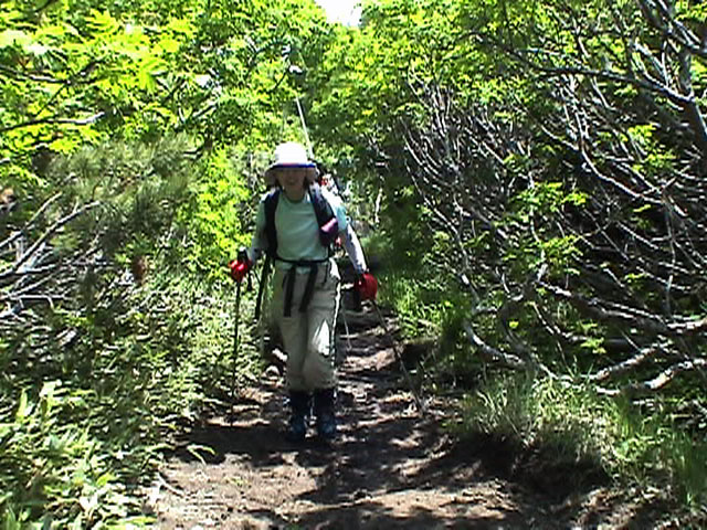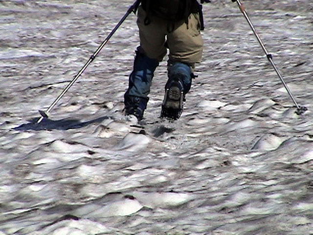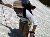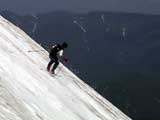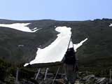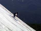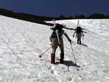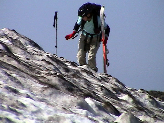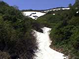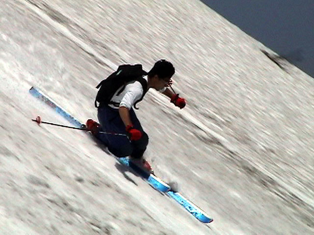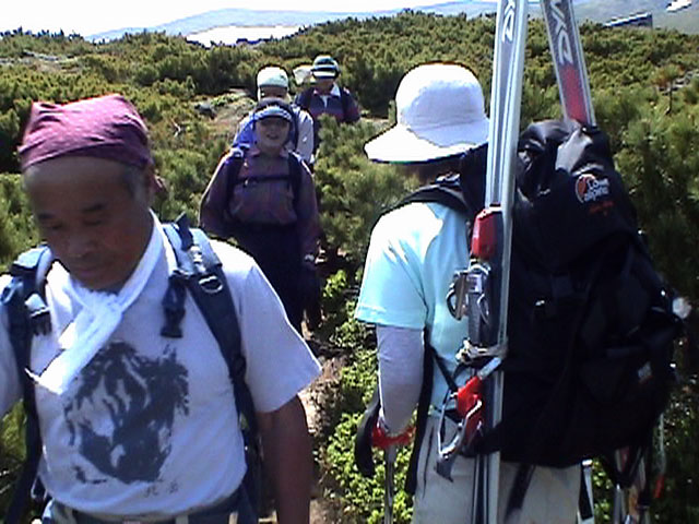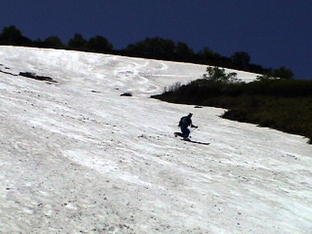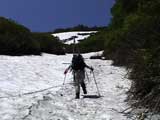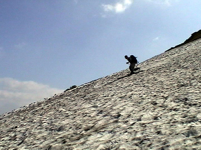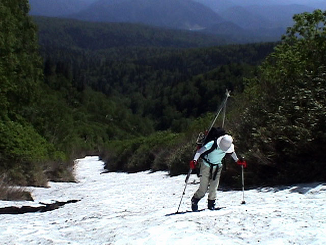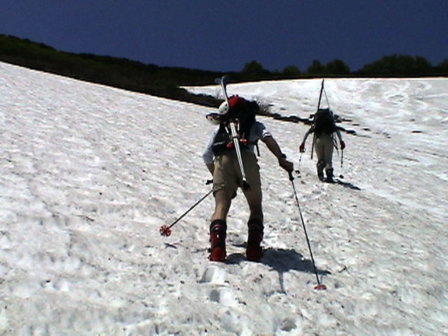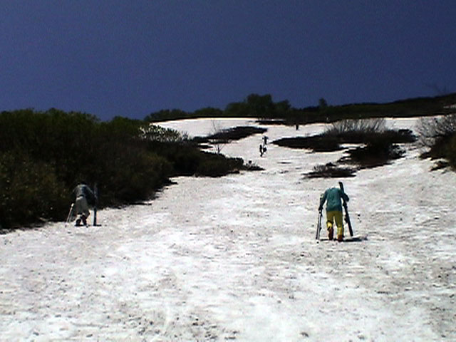| 2003年6月22日(日) 赤岳スキーツアー(ラスト・ラン) 恒例の赤岳ラスト・ラン。「しつこくスキー派」ではお馴染みのエリアだ。 ここは銀泉台までの林道が開通(今年は6月20日午前11時)してから山開き(今年は6月28日)までの間に滑るのがコツだ。一般登山者が少なく、スキー規制もかからない。 通常は銀泉台が登山口だが、まだ十分な雪が残っていたので、銀泉台の約一キロ手前の第一花園雪渓入り口からスキーを担いでアプローチした。入り口付近には15台くらいは駐車できるスペースがある。 第一花園雪渓の入り口には、「入山届けを銀泉台で記入すること」との看板が立っていた。 スキーをザックに括り付けて登ってみると、雪は意外と柔らかく、アイゼンを使用せずに済んだ。前回の経験から登山靴は用意せずにテレマークブーツだけで行動した。 山開きは来週なのだが、結構沢山の登山者が居た。そしてそれ以上のたくさんのスキーヤーが居て賑やかだった。さすがに皆さん上手い。 スキーヤーはほとんどが第一花園雪渓を登り返して滑っていた。 雪のコンディションや斜度は、第一花園雪渓が一番良いだろう。旦那達はもの好きに第三雪渓まで上がってみたが、上に行くほどスプーンカットが酷く、コンディションは悪くなった。 しかし、第一花園雪渓は上部の傾斜がきつく、転ぶと結構滑落するので注意。ちなみに雪面には砂が浮いているので、肌を露出していると擦り傷だらけになるかも。 それとは別に、駒草平のコマクサやキバナシャクナゲは見事だったので、一見の価値あり。 ここで偶然会った7名のテレマーカーは全員知り合い(^_^)。 Y田さん夫婦、toshiさん、K井さん、K宮さん、DJさん達・・皆さん好きだねえ。ビバ!しつこくスキー派! これで一応旦那はスキー納め。帰ってからすぐにウエアをクリーニングに出しちゃった。 結果:第一から第三まで三つの雪渓を滑降 天候:快晴 風速:0〜2メートル 気温:18〜22度 雪量:雪渓スキーとしては十分 雪質:ザラメ、(スプーンカット、ウォッシュボード、浮き砂あり)一番条件の良かったのは第一雪渓 コース:銀泉台手前、第一花園雪渓入り口〜赤岳第三雪渓 10:15第一花園雪渓入り口-11:30第一花園雪渓トップ-11:50-12:00第二雪渓-12:20駒草平-12:40第三雪渓13:16-13:30第三雪渓トップ13:40-15:57第一花園雪渓入り口 (第一花園雪渓の登り時間は、かなり途中で撮影をしていたので長くなっている) |