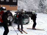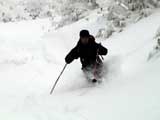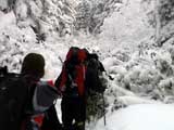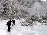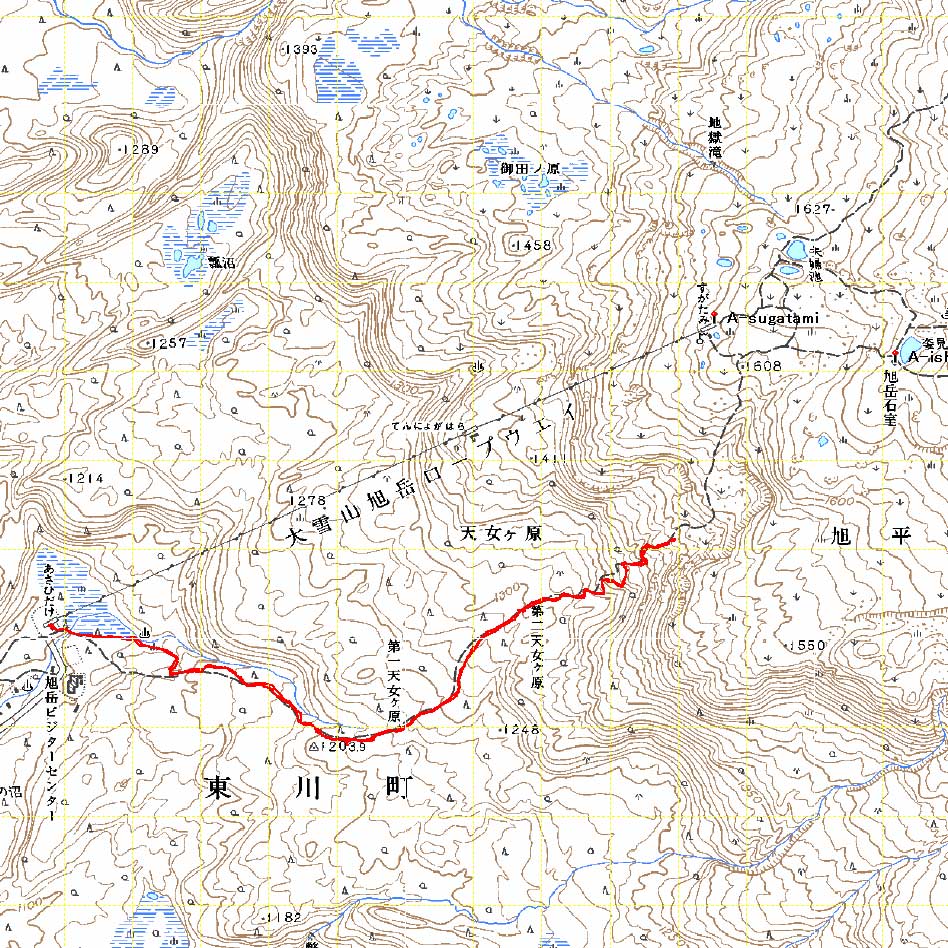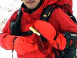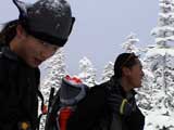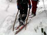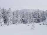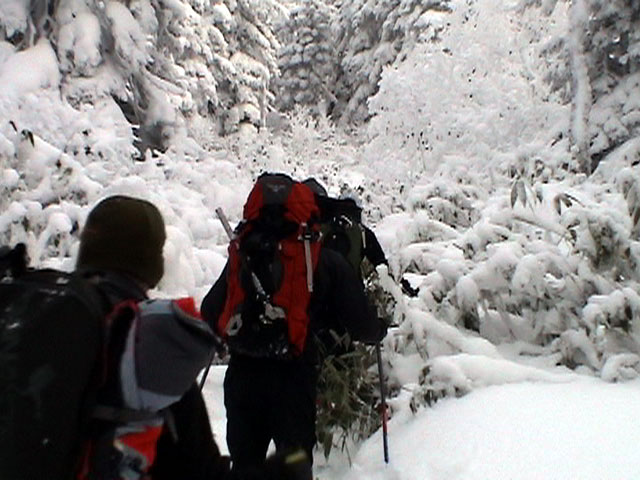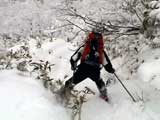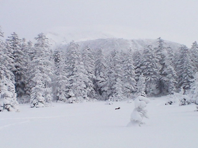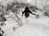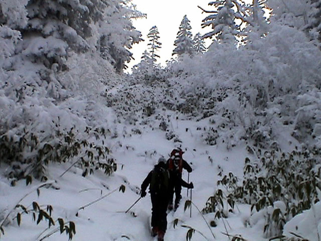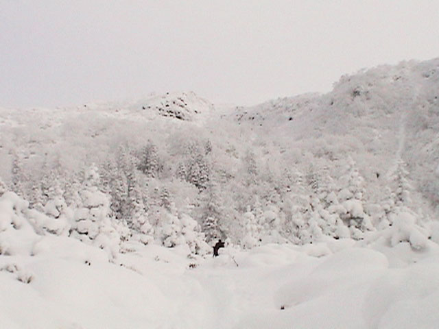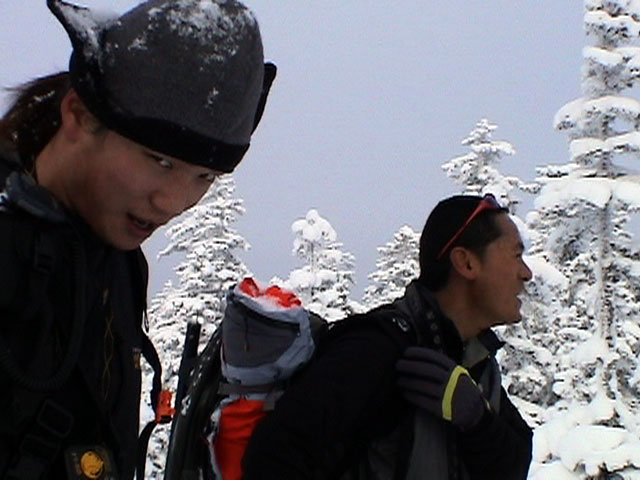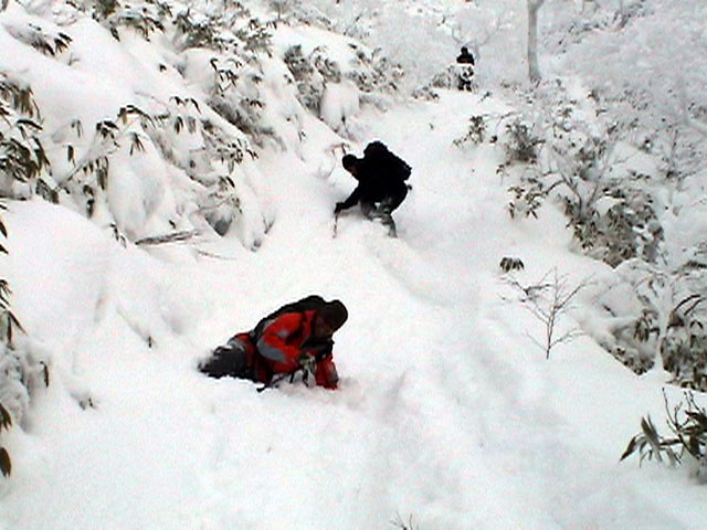 | 2003年12月6日(土)危険!!!:雪不足による岩の露出 旭岳スキーツアー(危ねぇ!ブッシュだらけ) 恒例の旭岳初滑り、毎年ロクな目に遭わないと相場は決まっているのだが、今回は史上最悪だった。すでに12月だというのに、まったく雪がない。 駐車場で、捨て板かファット板か選択に迷ったが、雪質自体は良さそうなのでファット板を選択してしまった。 かっちゃんが一時間先行してラッセルしてくれたが、夏道以外のコースは笹だらけでラッセルすらできない状態。ソールにはゴツゴツと岩が当たるし・・完全に板の選択をミスってしまった・・ 「これは、もうネイチャーツアーだ。小鳥のさえずりを聴きながら歩こう」とか、「今日の目的変更、ロッジ・ヌタプカウシペで、キトピロラーメンを食べながらビールを飲むこと」など、ぼやき続出、帰りたくなる。しかし、ラッセルして先行してくれた”かっちゃん”を見捨てる訳にはいかない。 盤の沢の上部で、やっと泣きそうな顔で姿見駅から降りてきた”かっちゃん”と合流できた。 「やべぇ・・ここは化け物岩のシュートよりも危ない」とのこと。ブッシュが濃いために滑降コースが夏道上に限られ、狭いところに岩が露頭しているので、ボーゲンすらままならないのだ。 「板が岩に当たってボーゲンのポジションが取れなくて暴走しちゃうんだよね・・」そりゃあ、怖い。 直ちに、現地点から撤退することにする。旦那と田中パパはシールを付けたままで降りることにした。もちろんソールの保護が目的だ。 滑降結果は?ズタボロです。心も体も・・なによりも板も・・ ソールはもちろん、旦那なんか岩を30センチに渡ってエッジで削ってしまいましたよ。板のその部分はエッジが無くなってしまった。どうしよう。 夏道からは出ていないので、植生への悪影響は無かったと思う・・それだけが救い。 あと、積雪が一メートル以上必要だ。それまでは近寄らない方が吉。 以上、人柱からの報告でした。 結果:盤の沢の途中で撤退 天候:薄曇り 風速:0〜1メートル 気温:-7度 雪量:積雪40センチくらい?まったく不十分 雪質:上質のパウダー コース:旭岳温泉〜盤の沢〜姿見駅 8:45旭岳温泉9:15-10:45盤の沢途中(1444m)11:06-11:50旭岳温泉 メンバー:旦那、田中パパ、ぱっちまん、かっちゃん、まーぼー、ミックス 計5名+一匹 |
