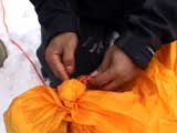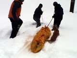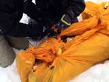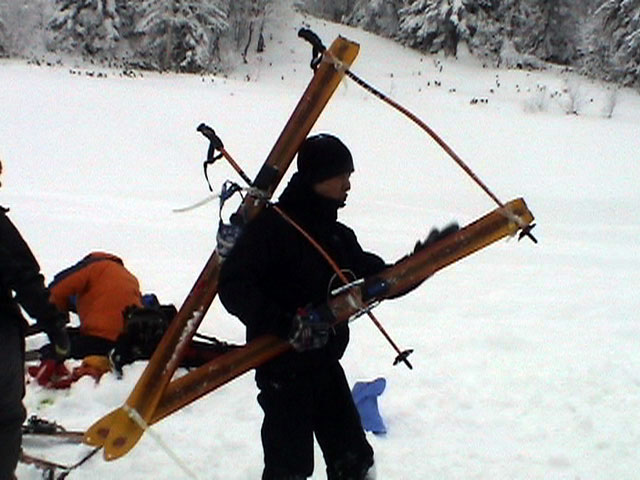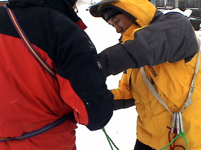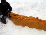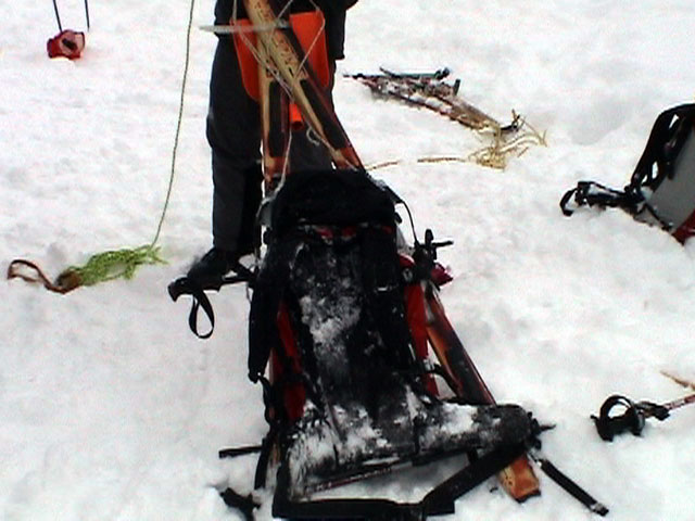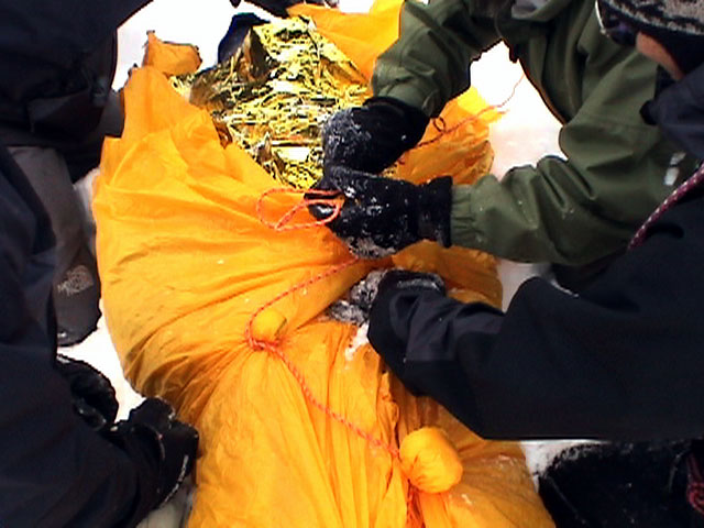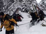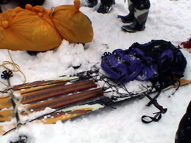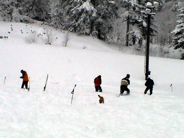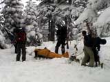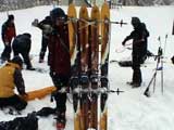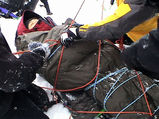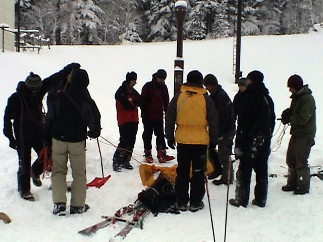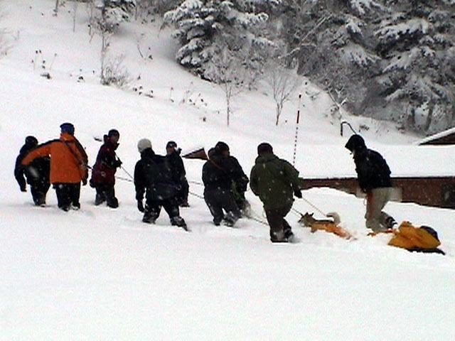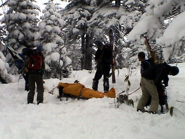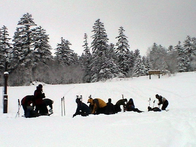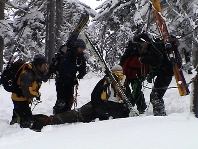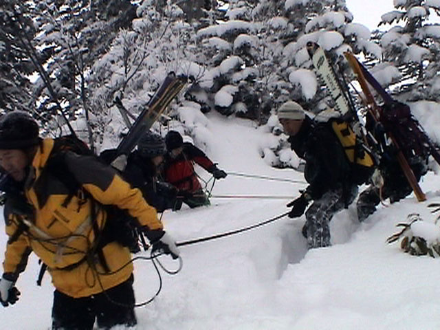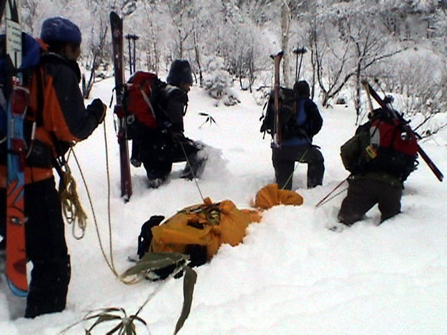| 2003年12月28日(日) 三段山BCレスキュー搬送訓練 この訓練の主旨(訓練冒頭の旦那の挨拶より抜粋) この度、三段山クラブ、ガイドの山小屋、Qaliは、同じ山域で活動する仲間として、遭難時にお互いを助け合う互助会を結成することにしました。 具体的には、遭難時にお互いの有志役員を緊急連絡先として、初期救助活動を行うというものです。 その互助会としての活動の一環として、今回搬出訓練を行うことになりました。 山中で行動不能に陥った場合、我々未組織登山者は、ヘリやスノーモビルによる救出を第一に考えますが、ヘリが飛べない、スノーモビルも出動できない状況も考えられますし、自己責任としてできるだけ私たちの力で救助活動を行いたいと思います。 昨年は、我々だけでも三名が山中で骨折事故を起こしました。幸い自力下山が可能な部位の骨折でしたが、もし足を骨折していたら、今回のような搬出作業を行うことになります。 これは明日にでも必要になるかも知れない技術の訓練です。どうか、皆さん真剣に取り組んでください。 一斑 担当 ぱっちまん polly(病欠)、マーボー、じゃん、田中パパ、ナマコ、ナガ 二班 担当 MARIC スー、キャプテン、旦那(記録担当)、かっちゃん、toshi、N崎 午前: 9:00〜9:30 テント場で練習場所確保(踏み固め) 9:30〜11:00 二班に分かれてソリ作り実技(インストラクター:ぱっちまん・MARIC) 11:00〜11:30 ビーコン訓練 午後: 12:00〜12:30 一段目へ移動(二班に分かれる) 13:00〜14:00 現場でのソリ作り 14:00〜15:30 一段目の上から下まで搬出訓練 16:00 解散 各自の必要装備:(通常の日帰りBC装備に加えて) 細引き3mm×10m スリング1.5m×一本 ザイル6mm×10m以上 カラビナ3個 ステン針金径0.5mm以上×5m(推奨) ペンチ ザック、スコップ、ポール ゴムバンド60センチ×5本以上 ツエルト ホカロン(貼り付けるタイプ)×6個(搬送される役の人が用いる) ヘッドライト 天候:曇り〜小雪 風速:0メートル 気温:-6度 雪量:不十分 雪質:深さ20センチ程度のパウダー コース:白銀荘〜一段目 |