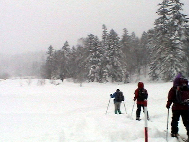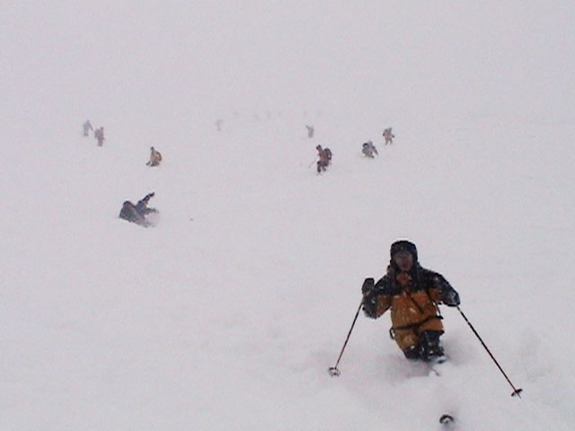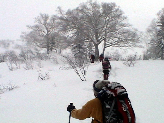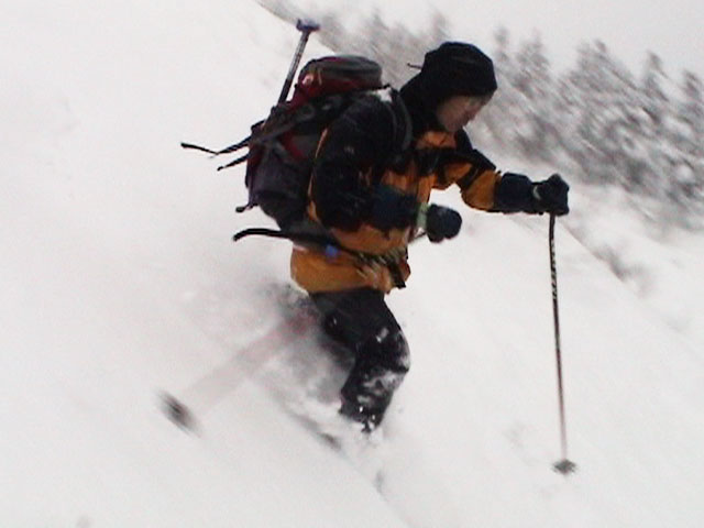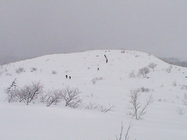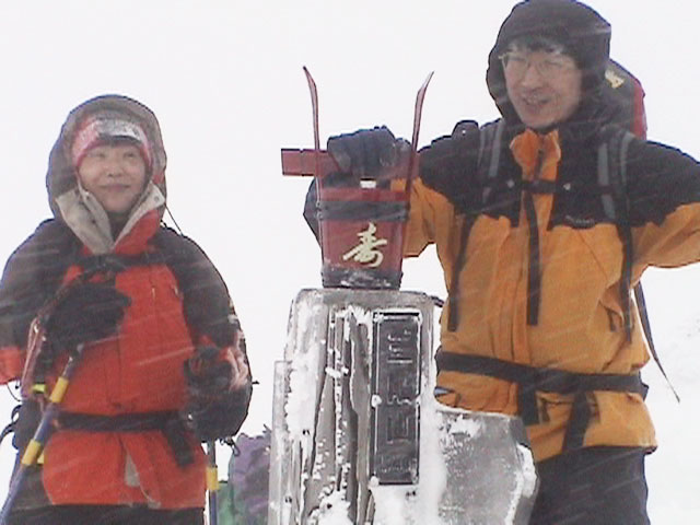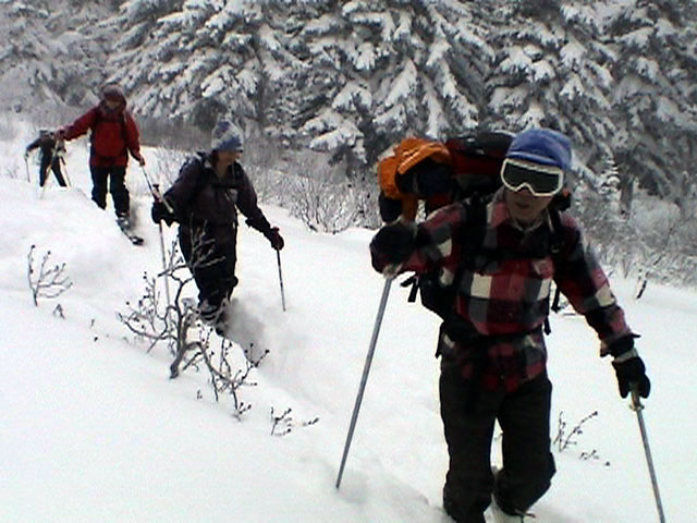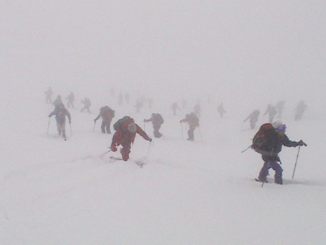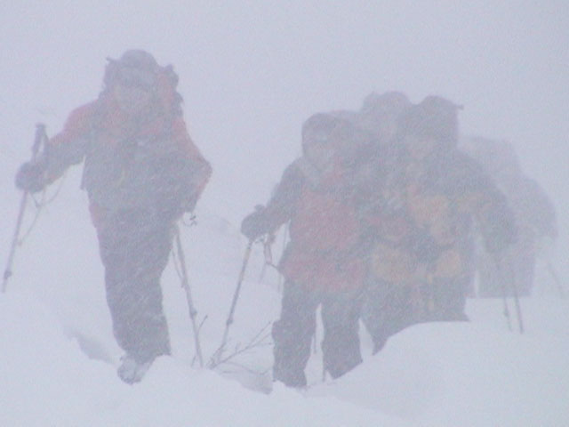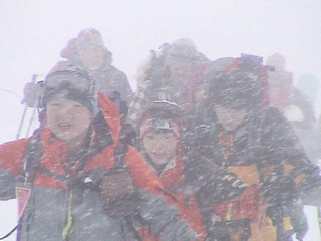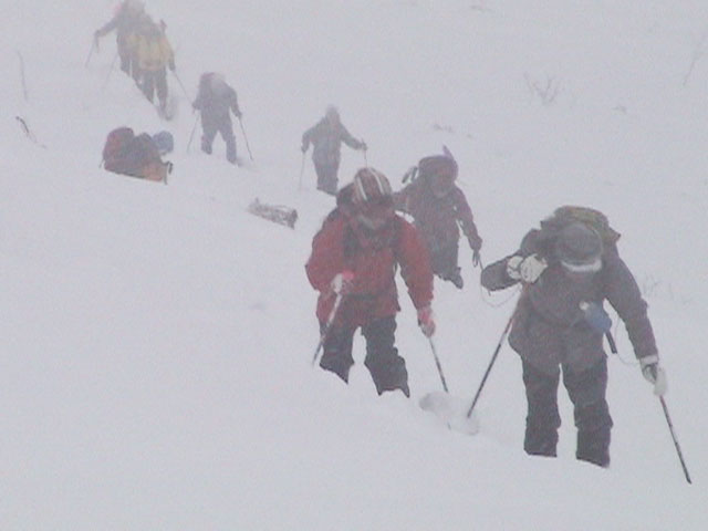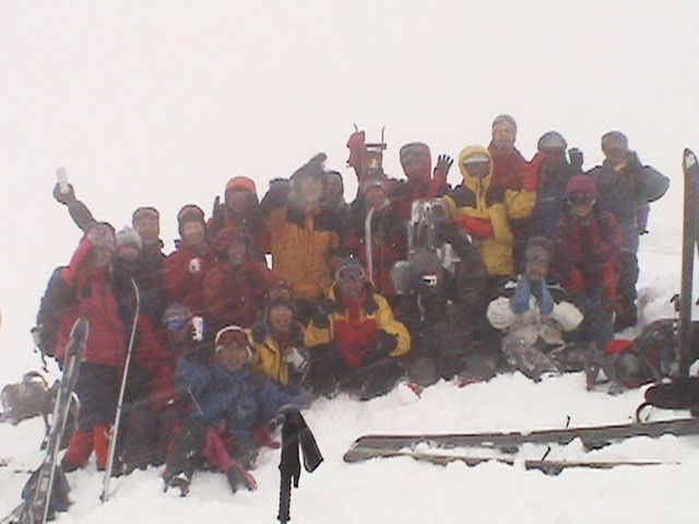 | 2004年1月11日(日) 三段山スキーツアー(三段山山頂結婚式) この日は、HYML(北海道山ML)の創設者小宮氏と山女さんの、三段山山頂結婚式が行われました。おめでとうございます。 参加者は合計26名の大所帯。先発隊と後発隊に分かれ、常に無線交信を行いながら行動しました。 二段目から上は、残念ながらホワイトアウトに近い悪天候でしたが、次々と登頂を諦めた登山者が下山する中、デポ旗を打つ島田さんを先頭に、ほぼ全員が山頂へ到達できました(スキーの不慣れな四名は四段目の手前でツエルトを張って待機してもらった)。 山頂は気温が低く視界も悪いため記念撮影だけに留め、挙式は二段目付近の樹林帯でおごそかに執り行われました。 下山時には、まだハイマツが多くて危険な三段山スロープを全員が無事にスキー滑降できました。 旦那が結婚するときに、やりたくても出来なかった事を実現された、小宮夫妻とHYML有志の企画・行動力に脱帽です。各班のリーダー、白銀荘の留守番隊、幹事の方々、参加者の皆さんお疲れ様でした。 参加された皆さんの技量と体力の高さに感心しました。 旦那もサポート兼撮影者として参加できて良かったです。 天候:雪のち曇り 風速:0〜3メートル 気温:-12〜-15度 雪量:不十分 雪質:30センチの軽いパウダー コース:白銀荘〜三段山 メンバー:旦那+HYML 計26名 |